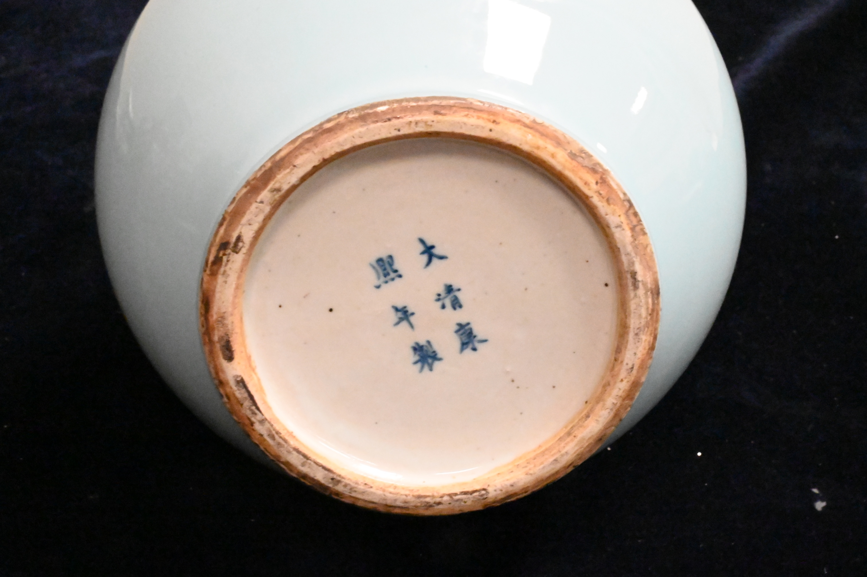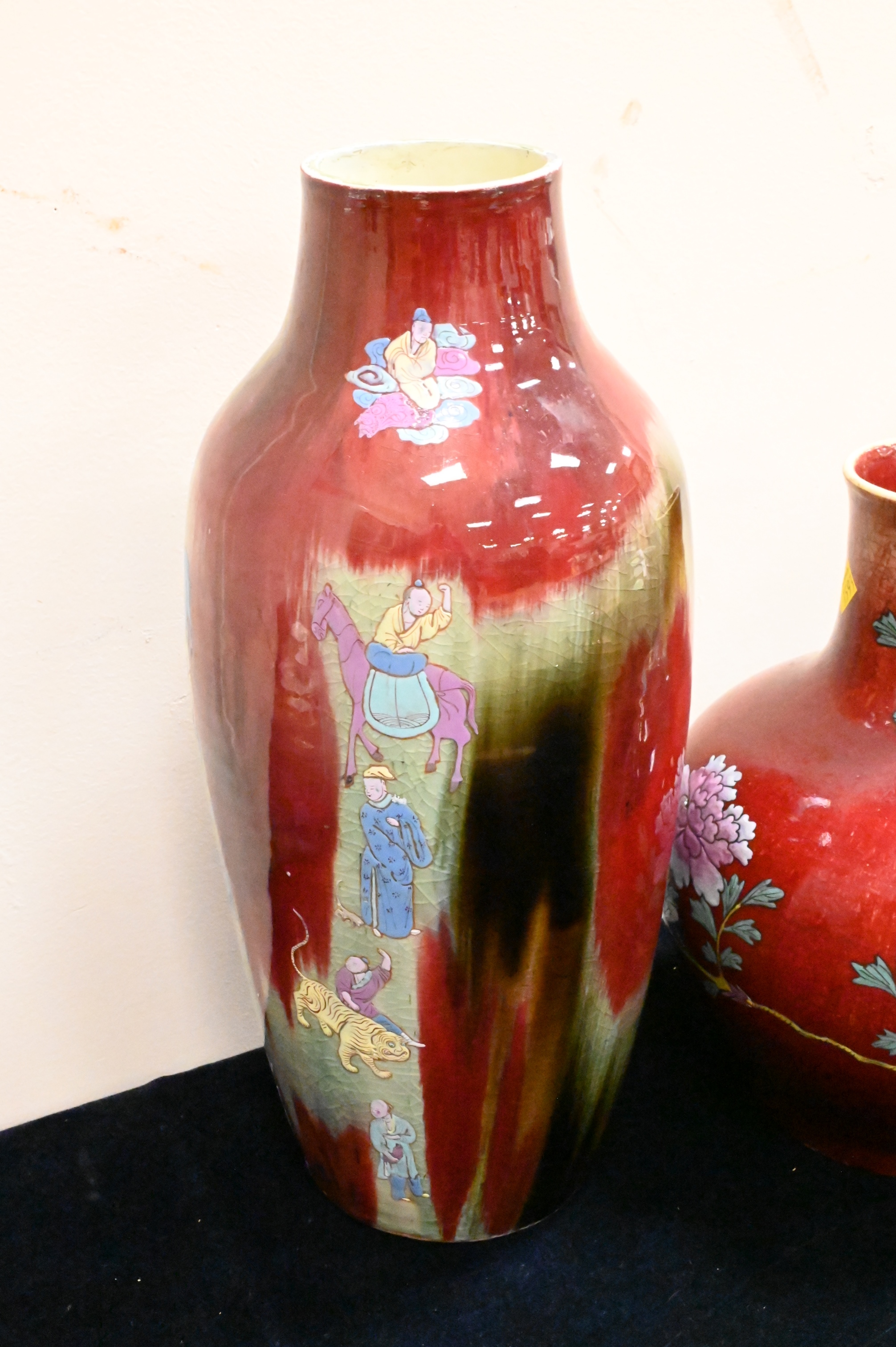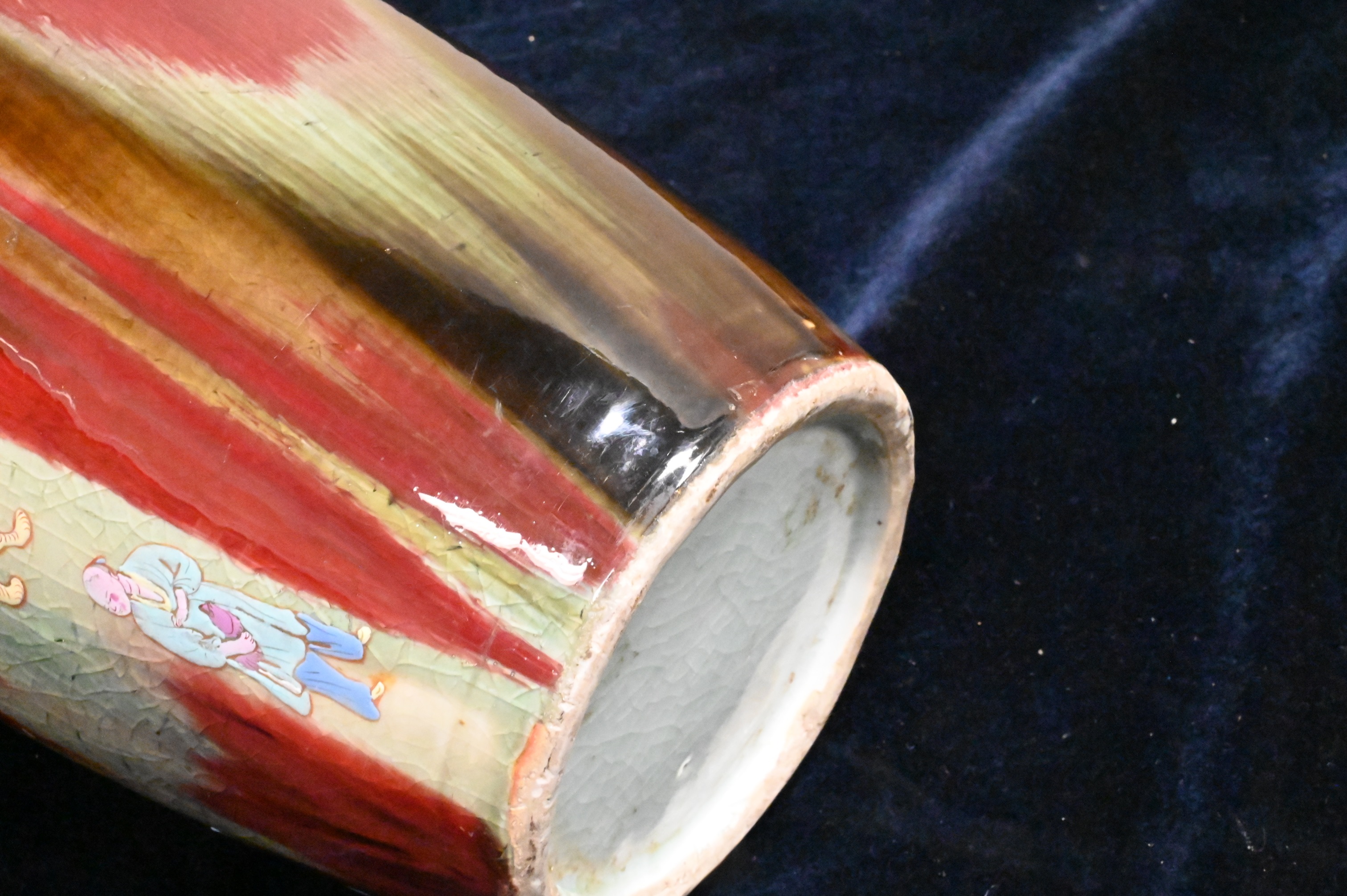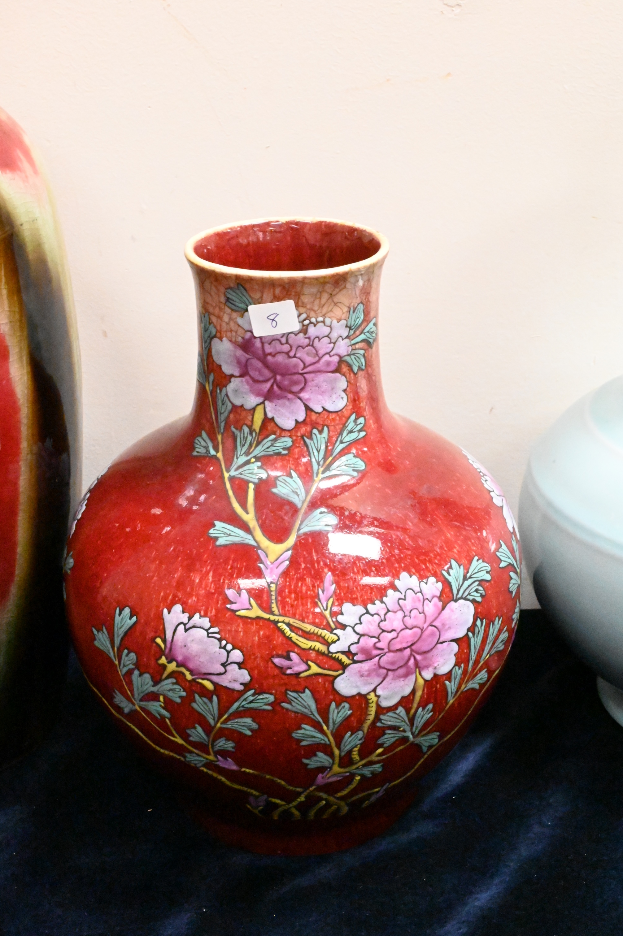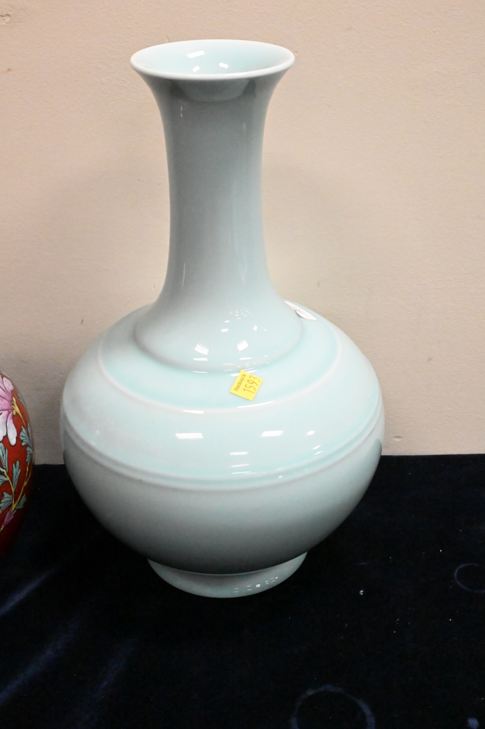 Three Chinese Porcelain Vases, to include vase with scrolling flowers, glazed vase with figures, along with a celedon vase, tallest height 19 inches.