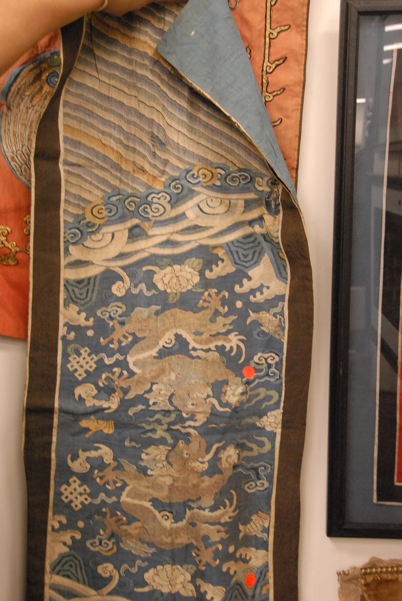 Three piece lot of Japanese and Chinese textiles, one framed.