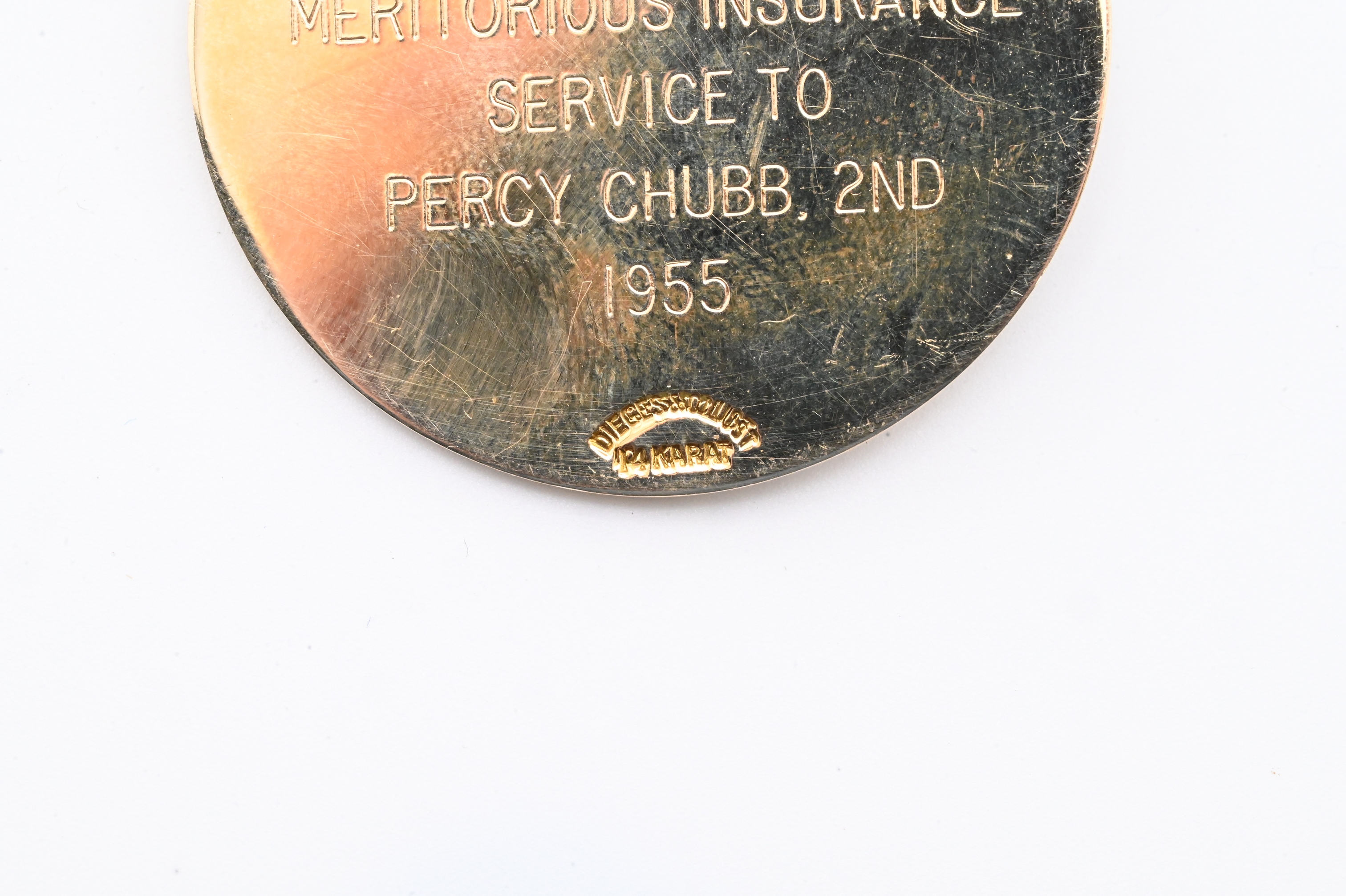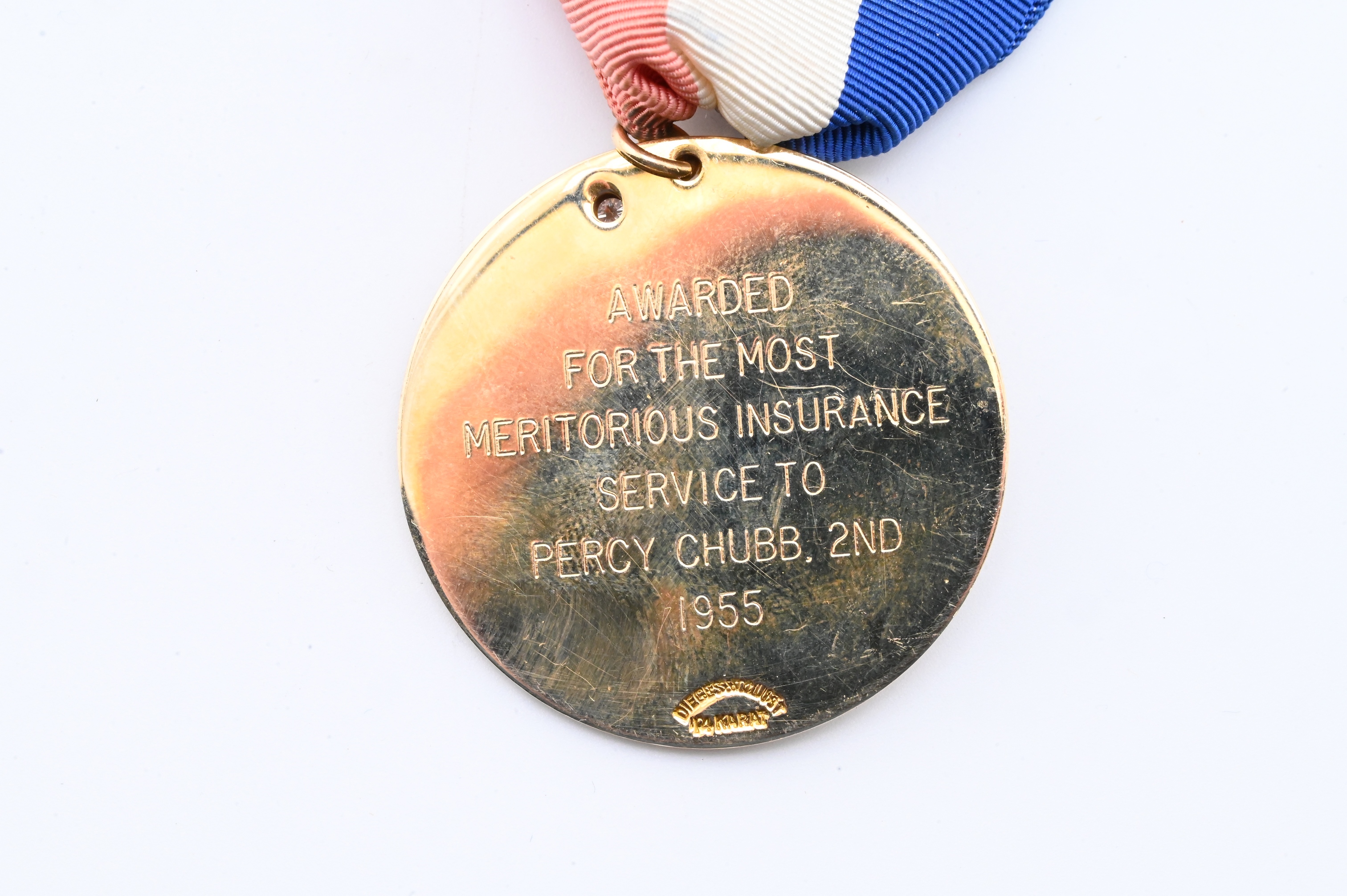 Gold-tone medal with applied diamond accent, suspended from a tricolor ribbon, obverse depicting a seated classical female figure holding a wreath and shield, inscribed “GENERAL INSURANCE BROKERS’ ASSN ANNUAL AWARD”, reverse engraved “Awarded for the most meritorious insurance service to Percy Chubb, 2nd, 1955”, presented in the original Dieges & Clust fitted case