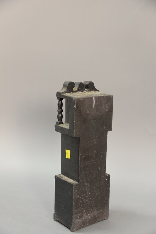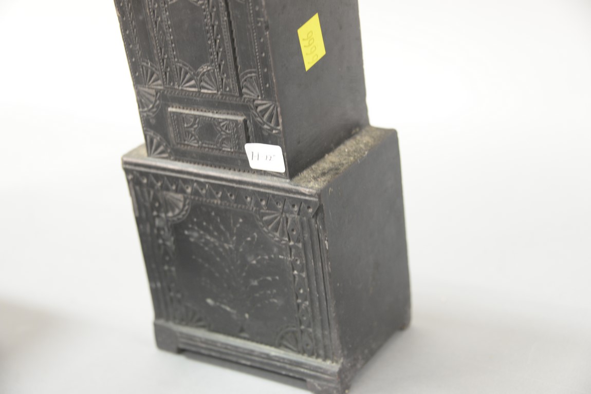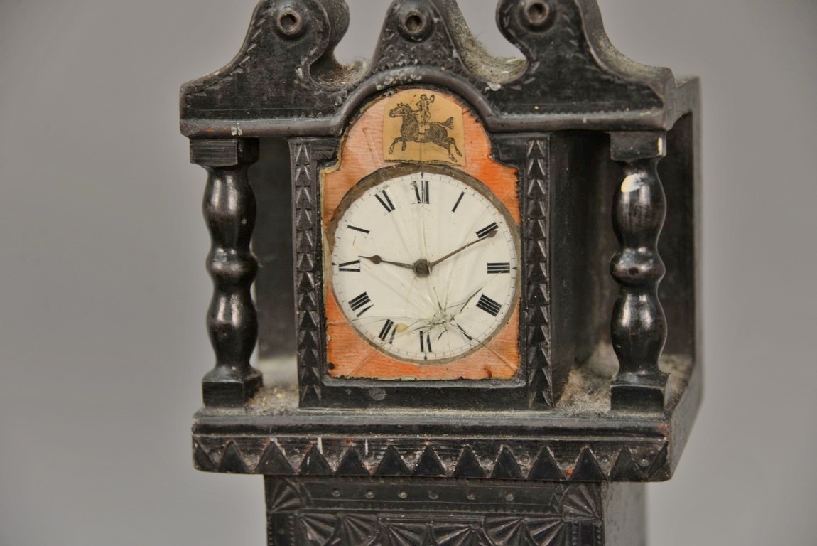 Lot 596: Carved stone miniature grandfather style clock having a pocket watch face, dial, and broken arch top. ht. 12 in.