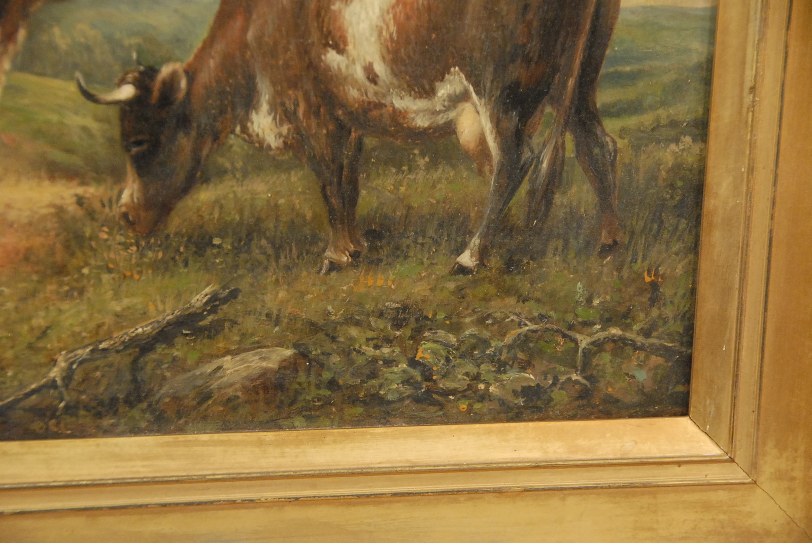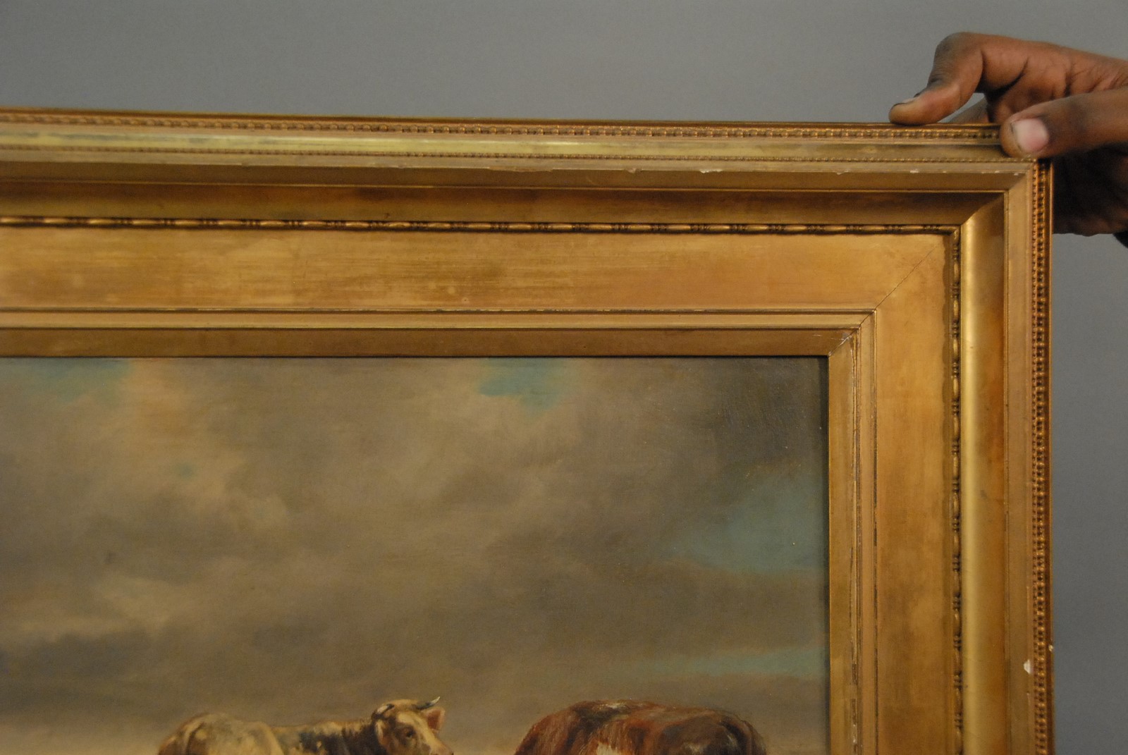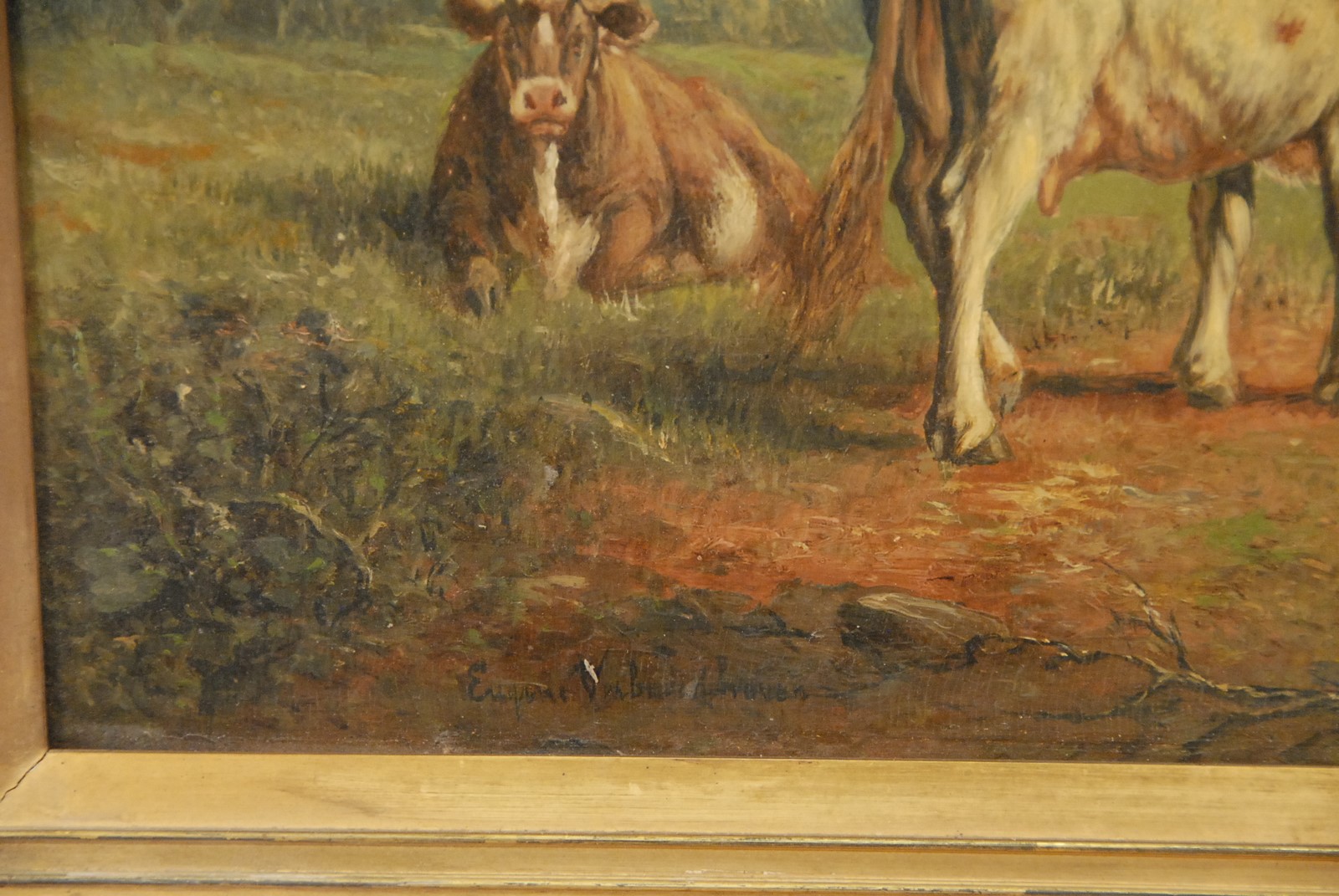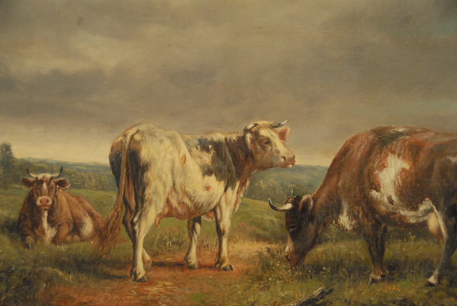 Lot 596: Eugene Verboeckhoven 1798-1881 GRAZING BULLS oil on panel signed lower left Eugene Verboeckhoven 12 x 16