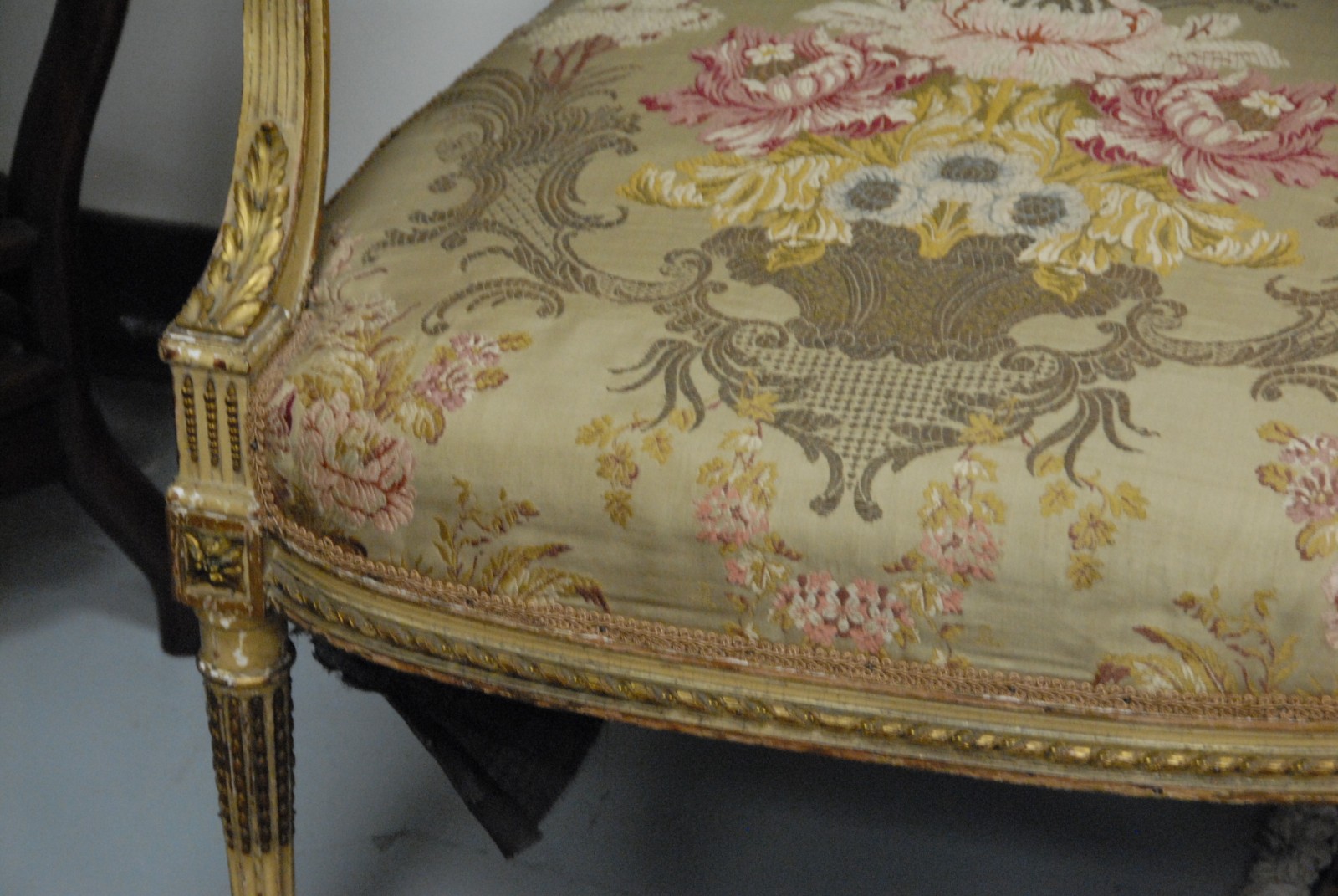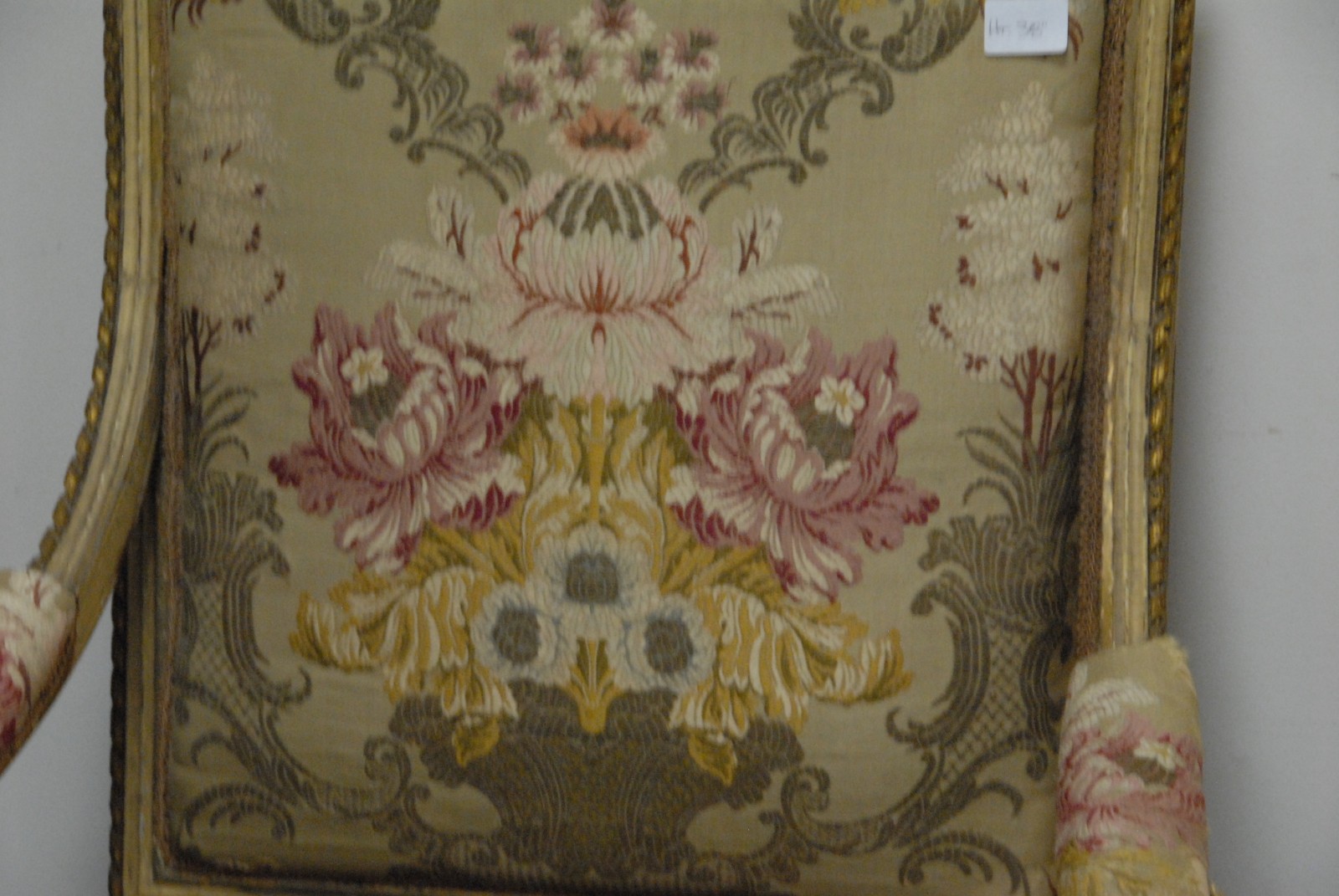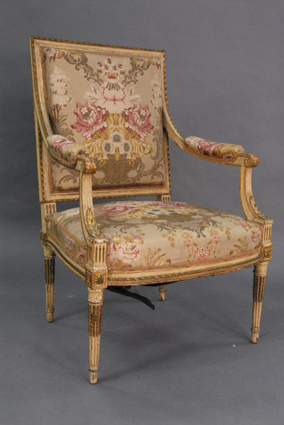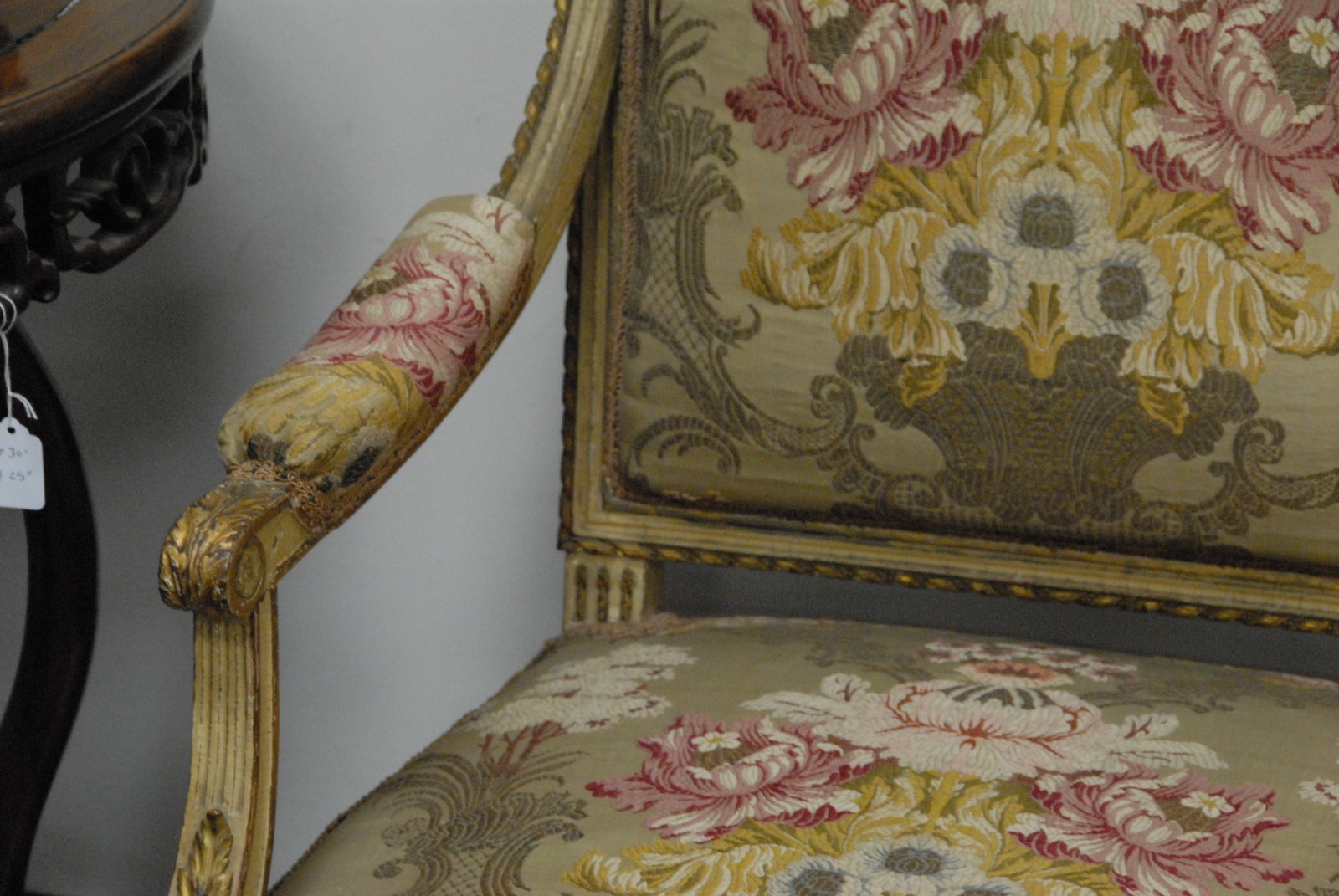 Louis XVI style upholstered armchair in old white paint, back, arms, legs and frame all trimmed in gilt bronze mounts upholstered with tapestry type material, probably 19th century .