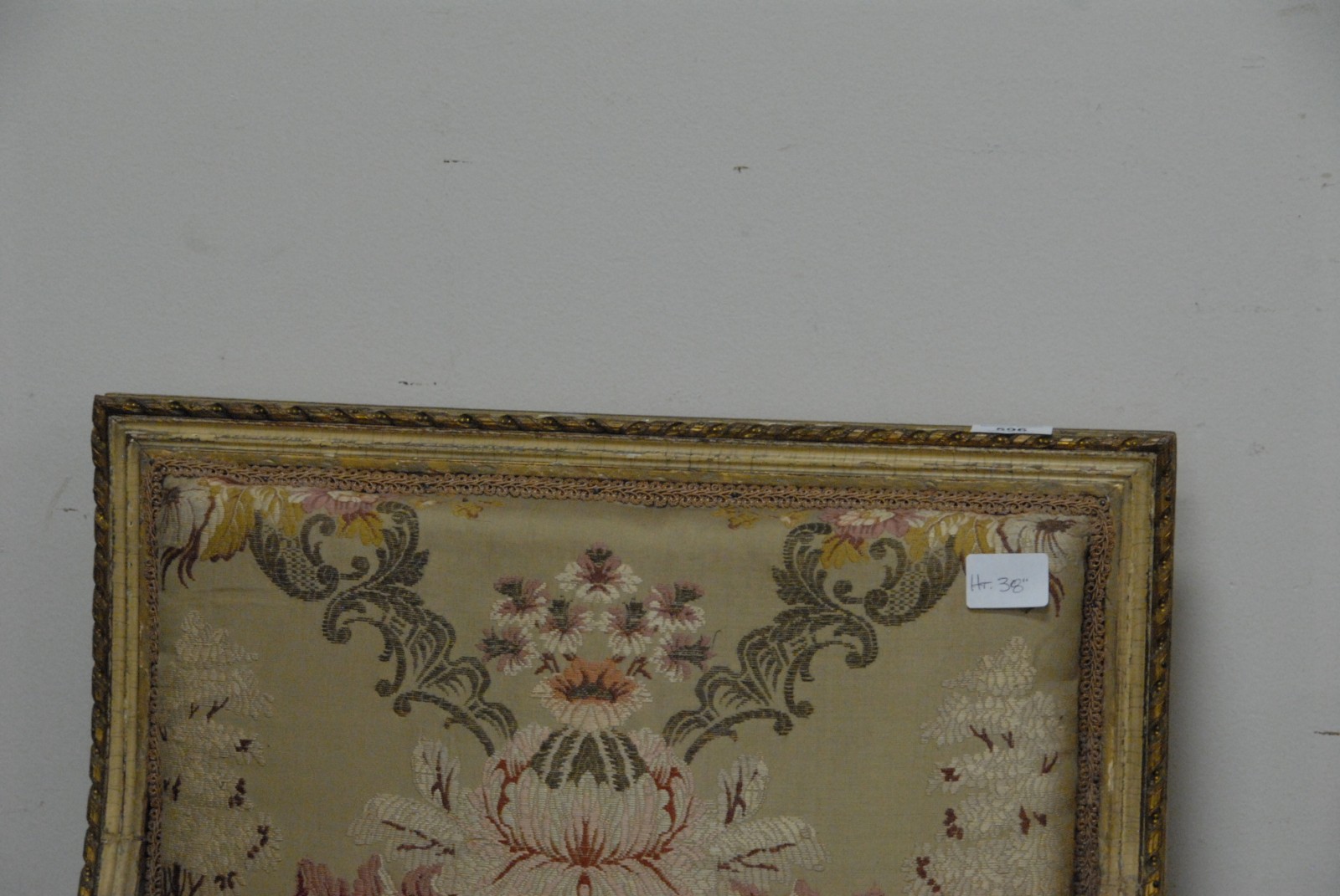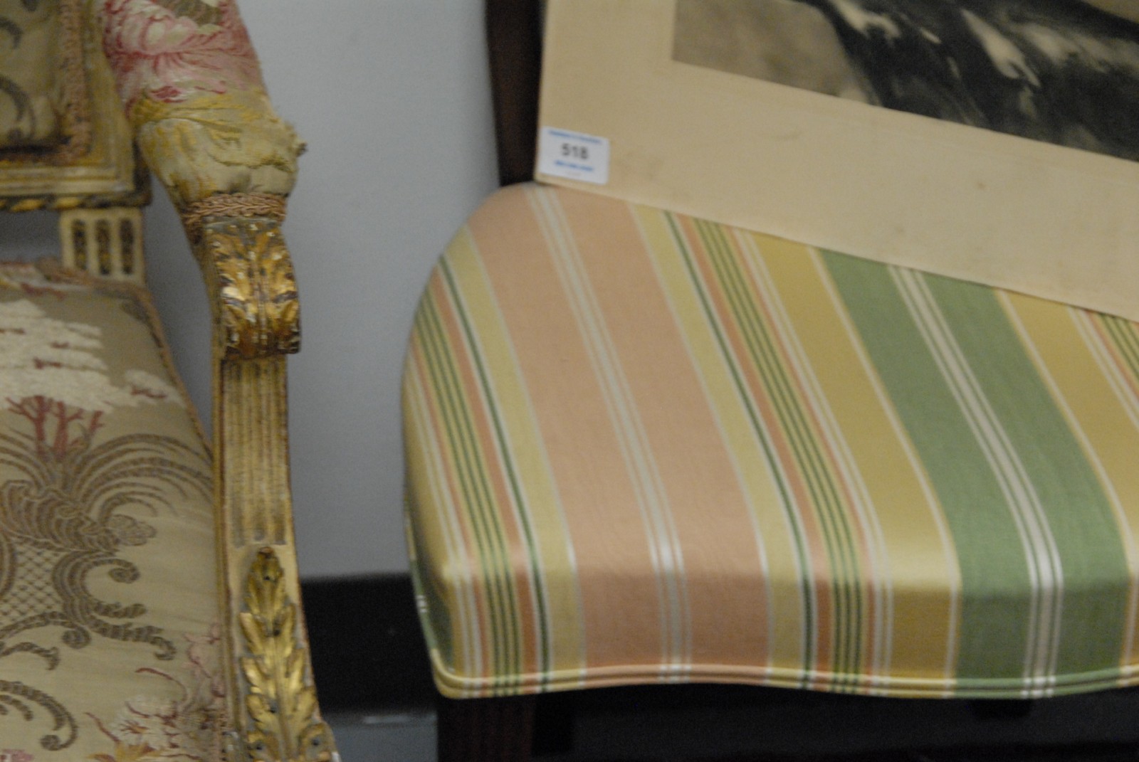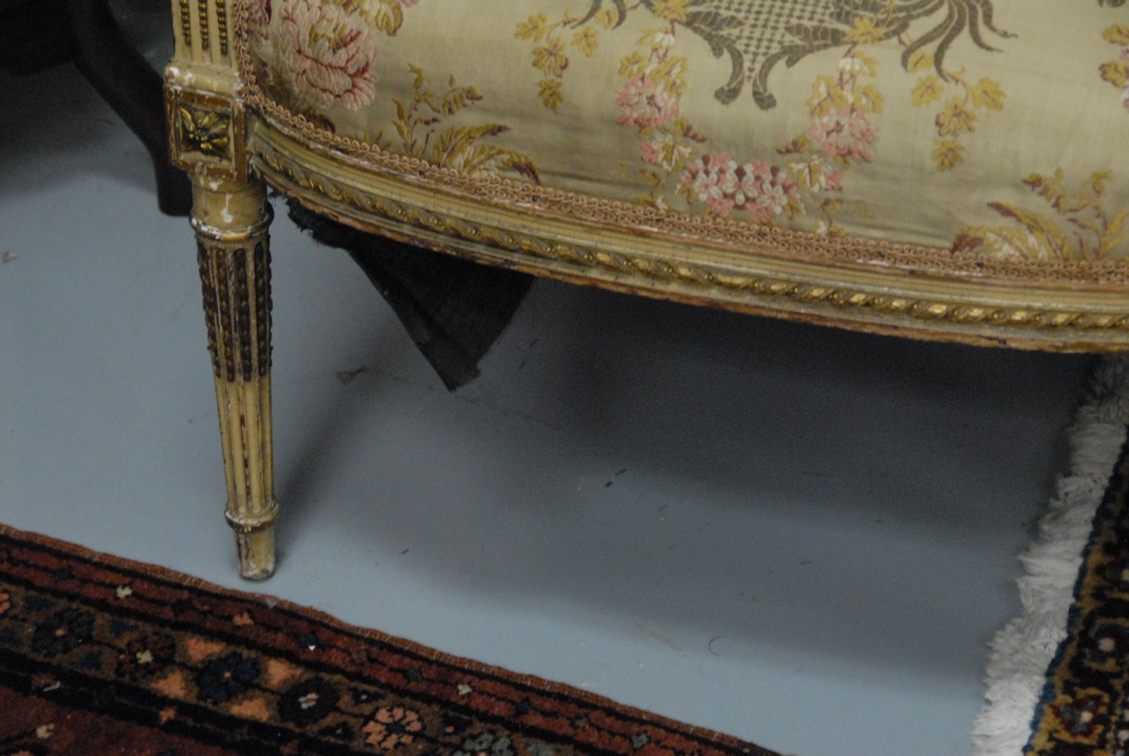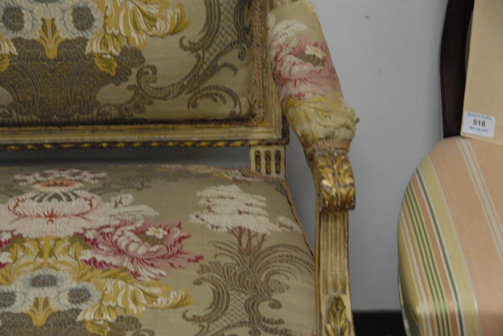 Louis XVI style upholstered armchair in old white paint, back, arms, legs and frame all trimmed in gilt bronze mounts upholstered with tapestry type material, probably 19th century .