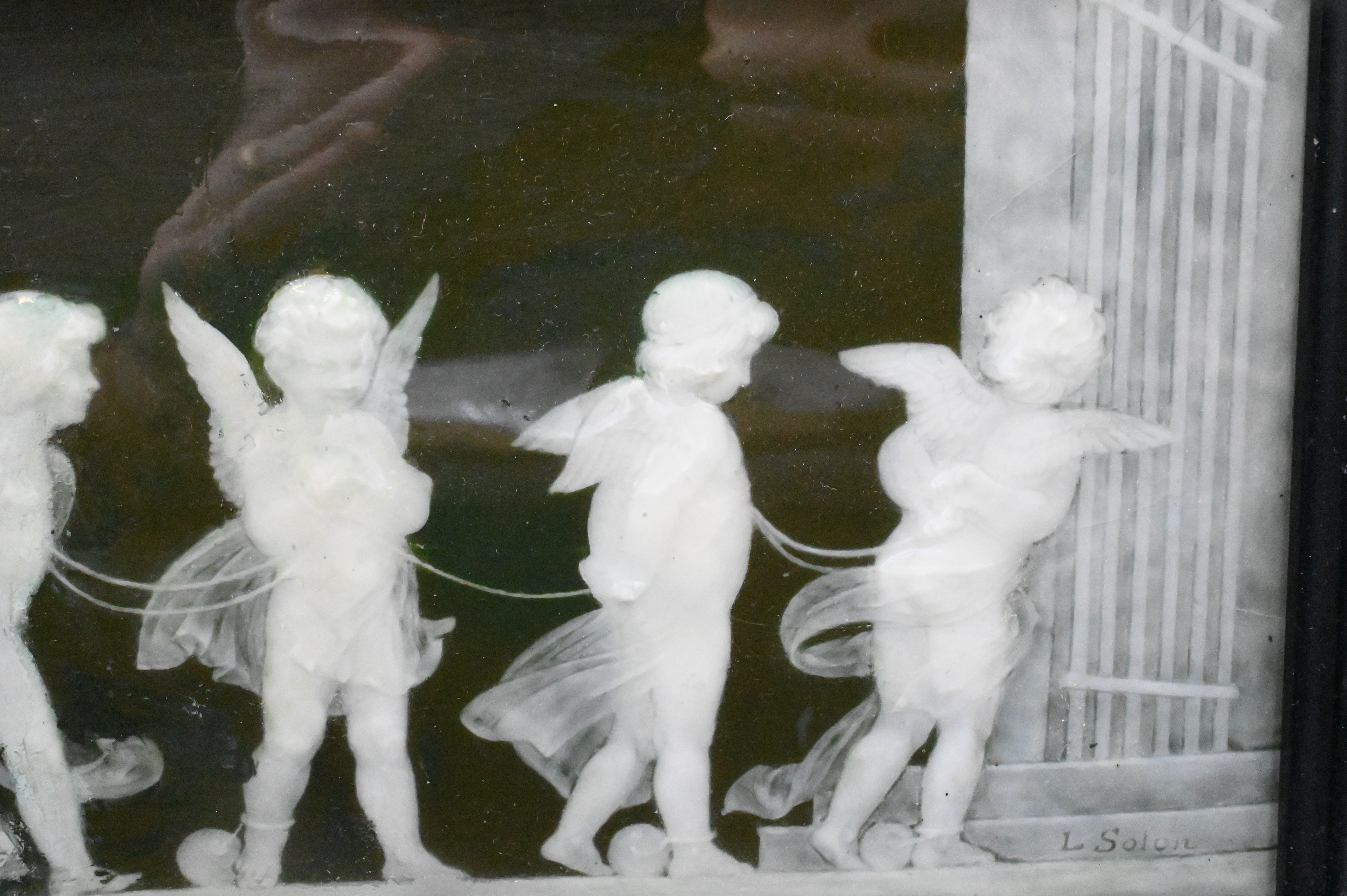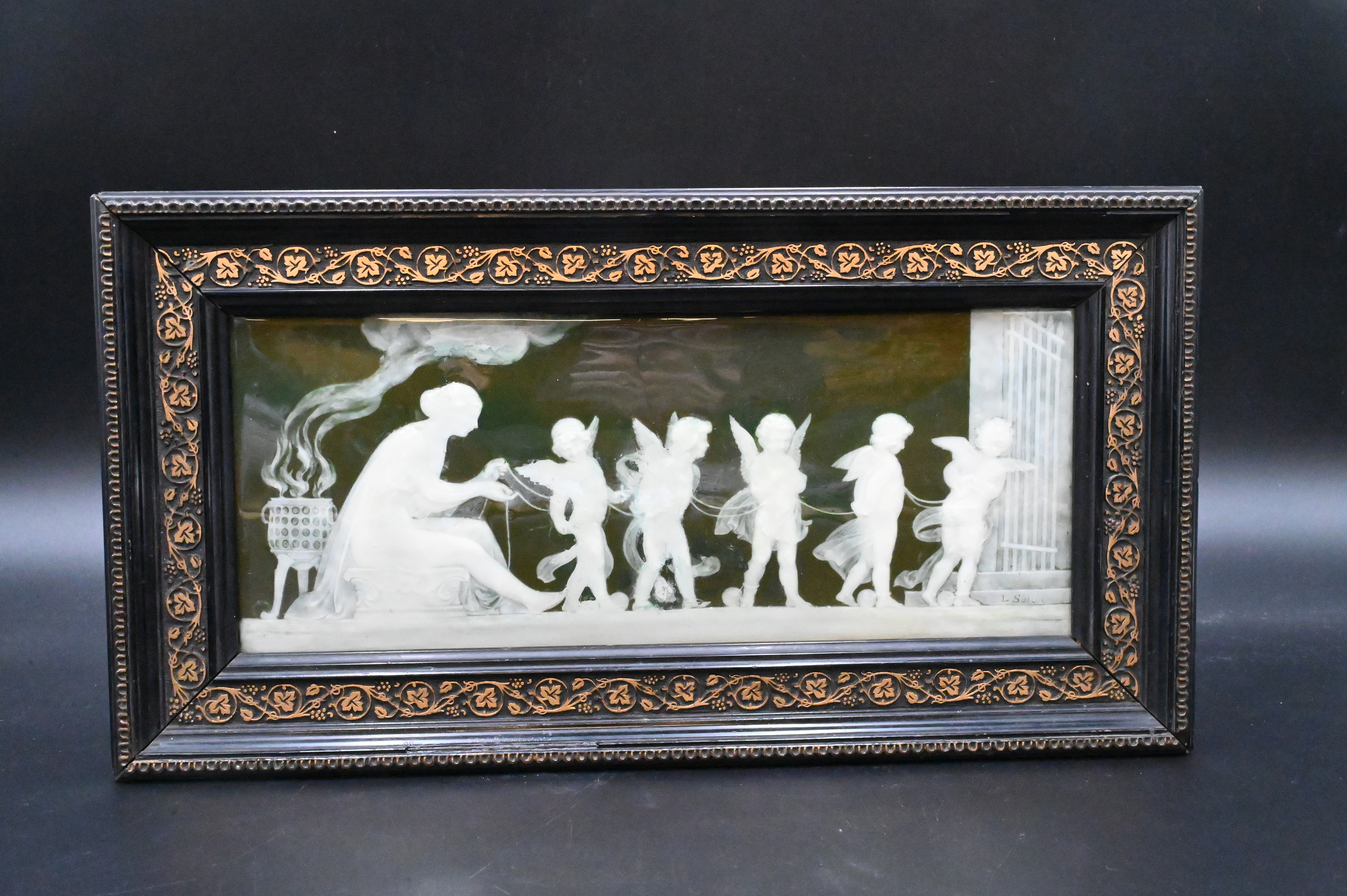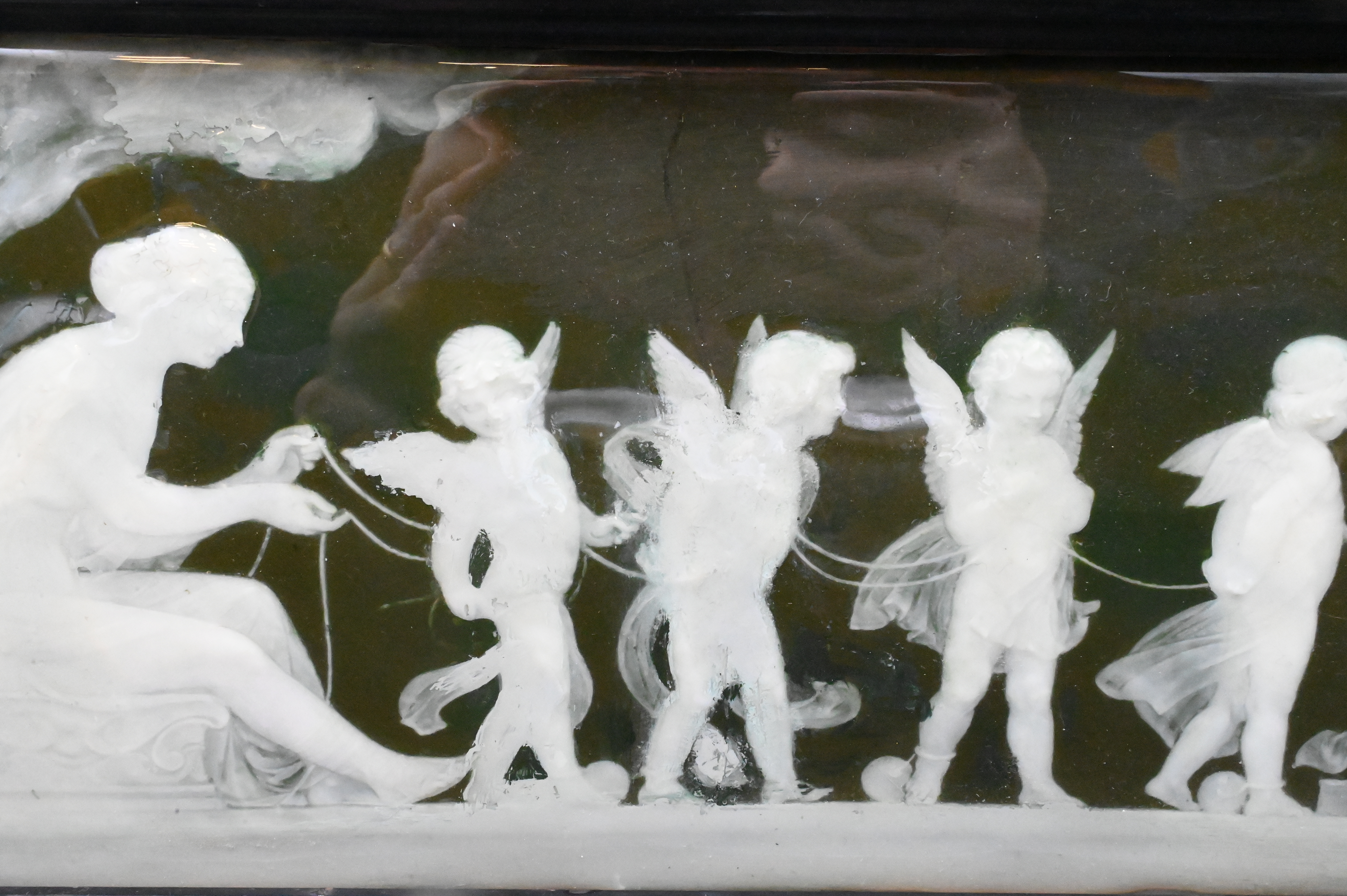 deep green ground rectangular plaque having mythological scene with five putti, strung together, several repaired cracks, circa 1880