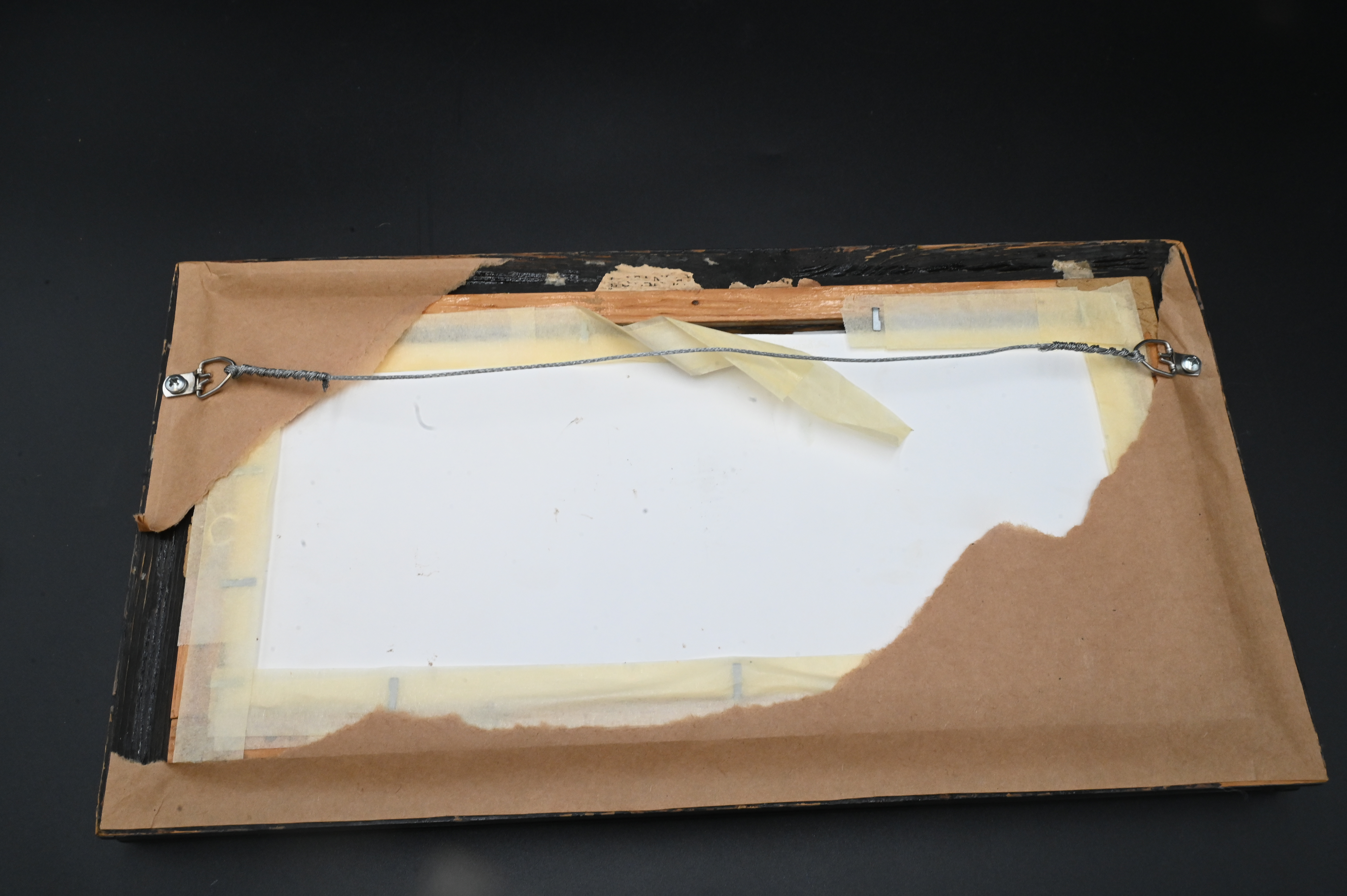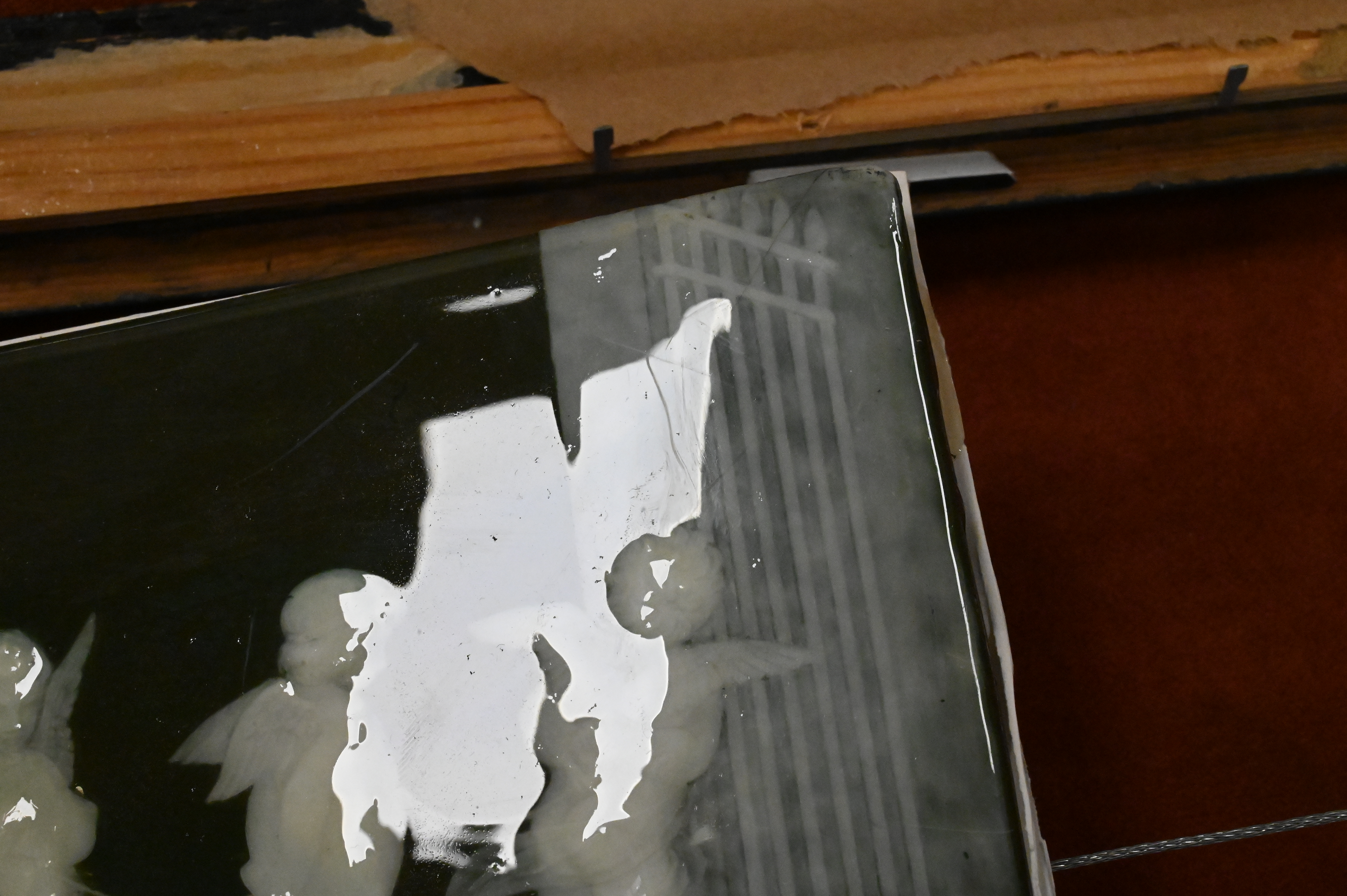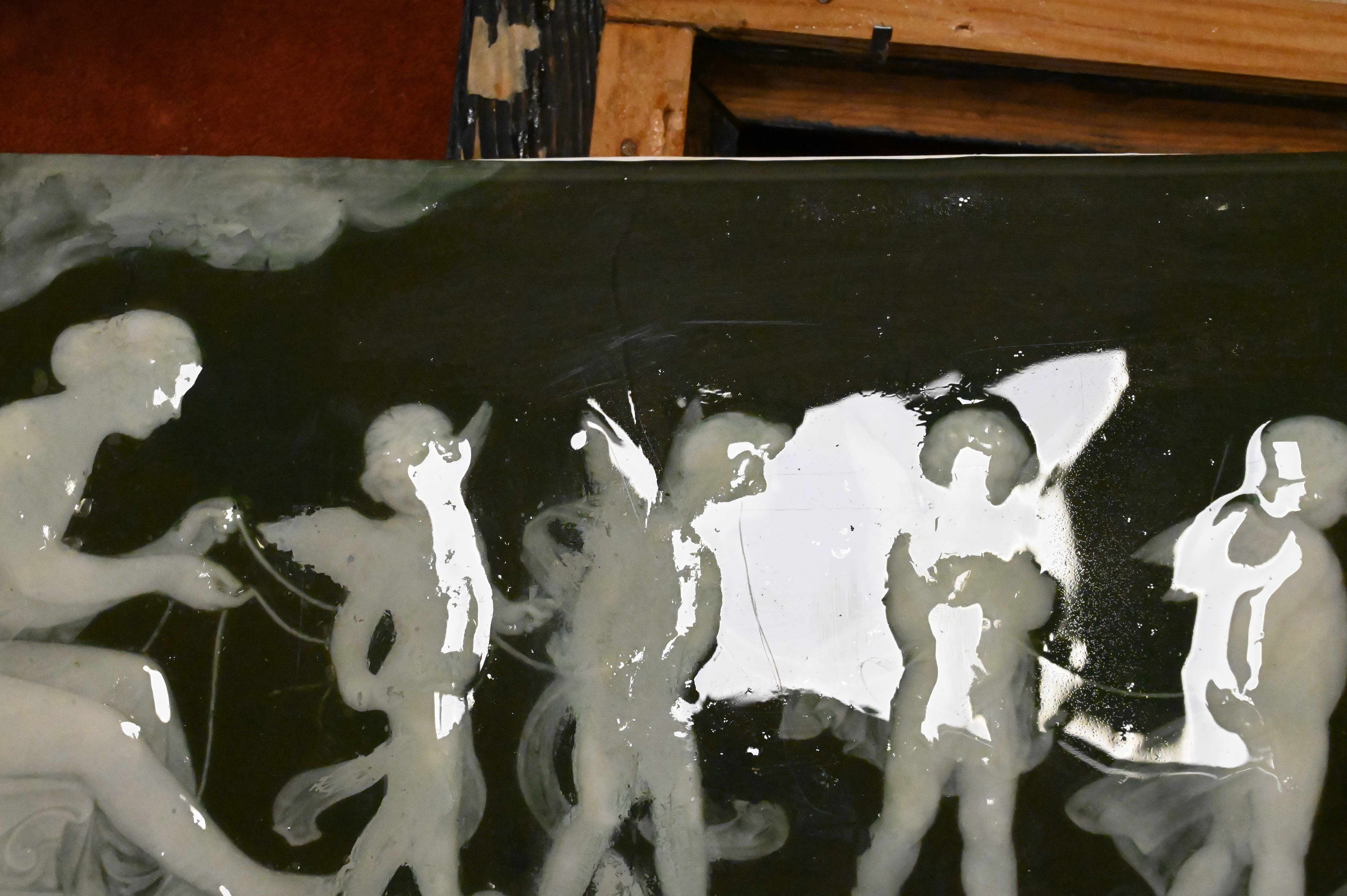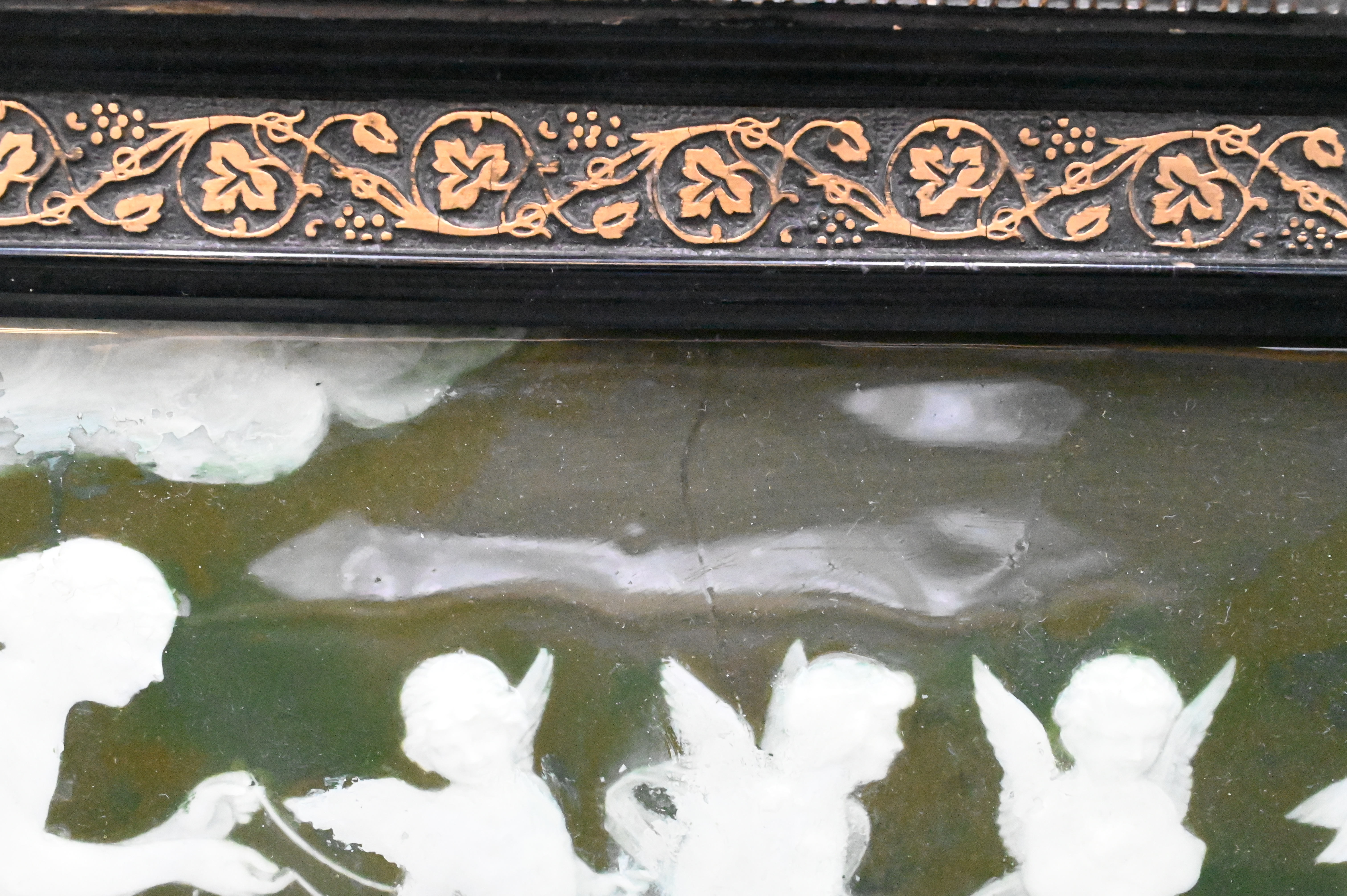 deep green ground rectangular plaque having mythological scene with five putti, strung together, several repaired cracks, circa 1880