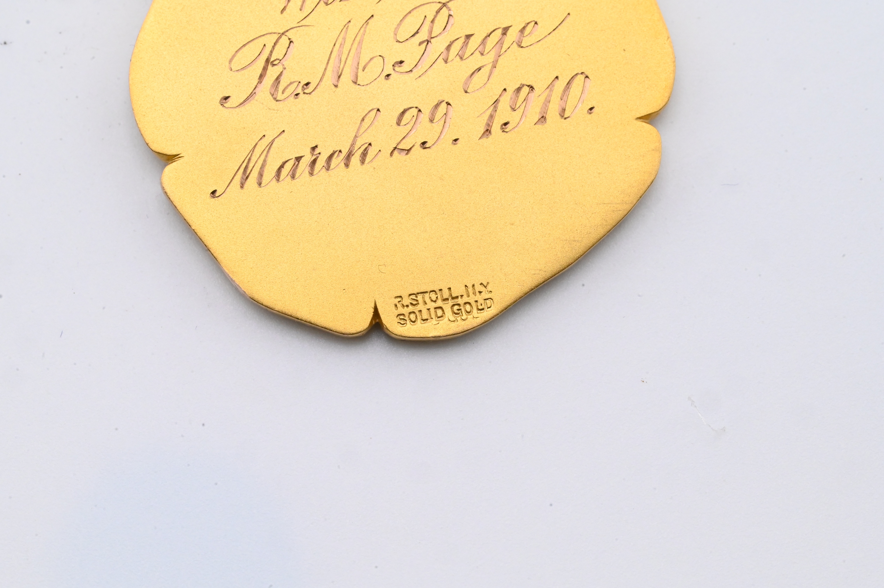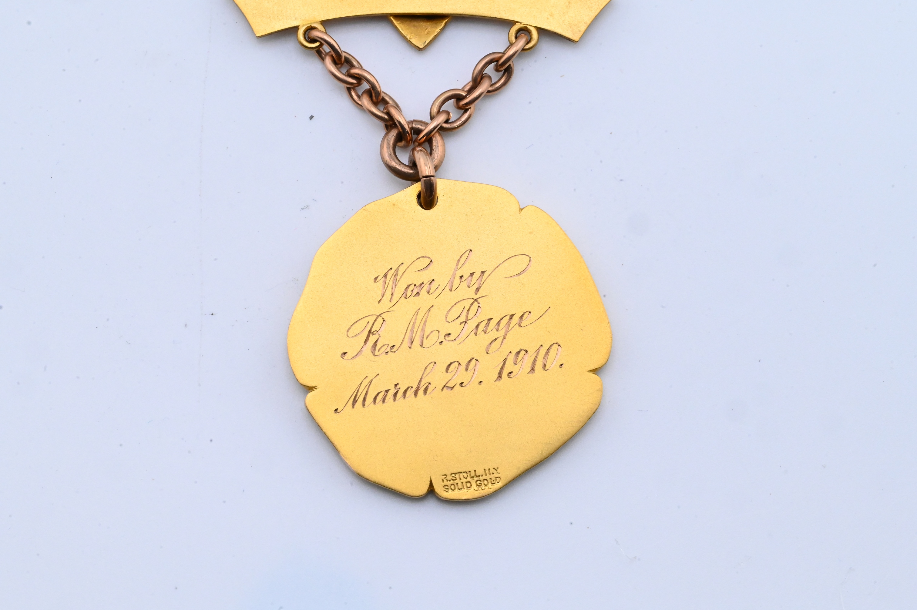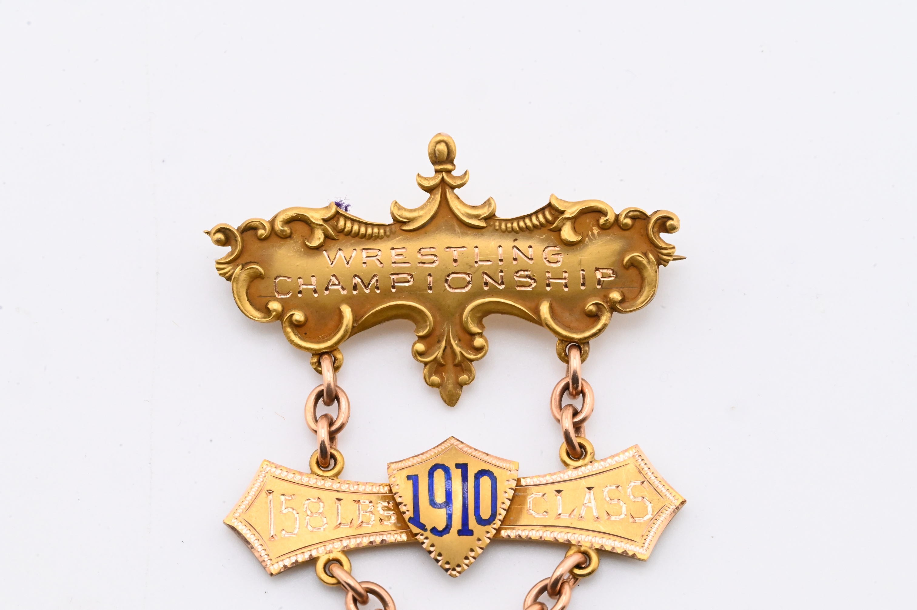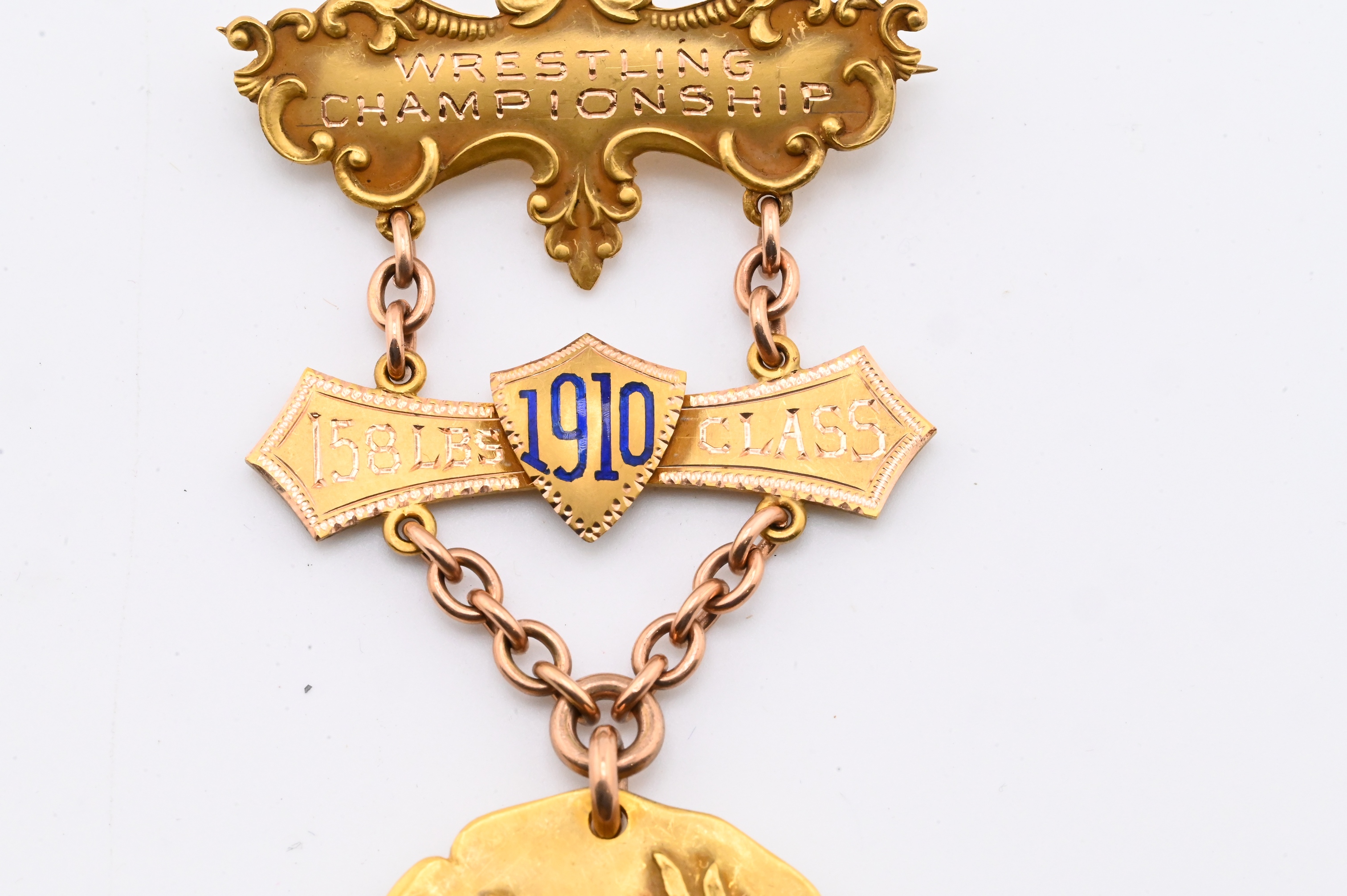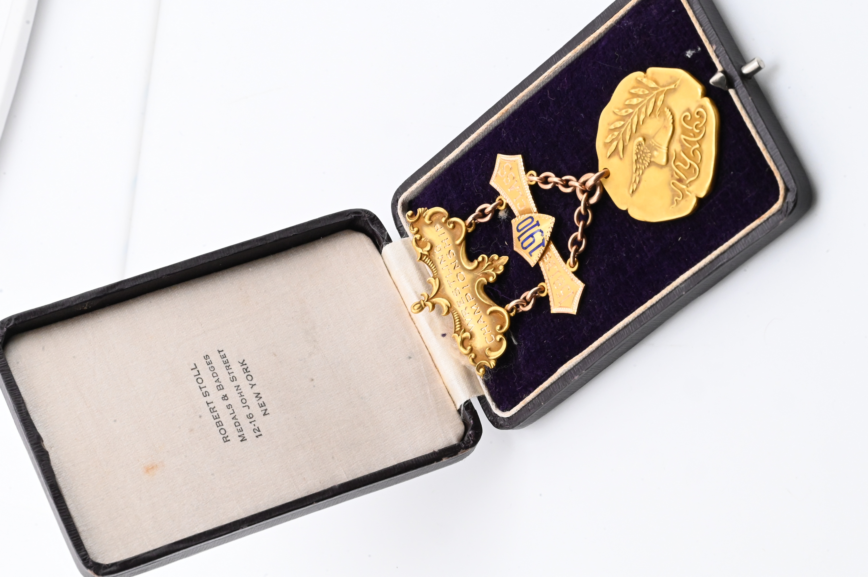 Robert Stoll, New York, solid gold medal with enameled “1910” shield and bar engraved Wrestling Championship 158 lbs Class, suspended from chain link and engraved on reverse “Won by R.M. Page March 29, 1910”, housed in original fitted case stamped Robert Stoll Medals & Badges, New York