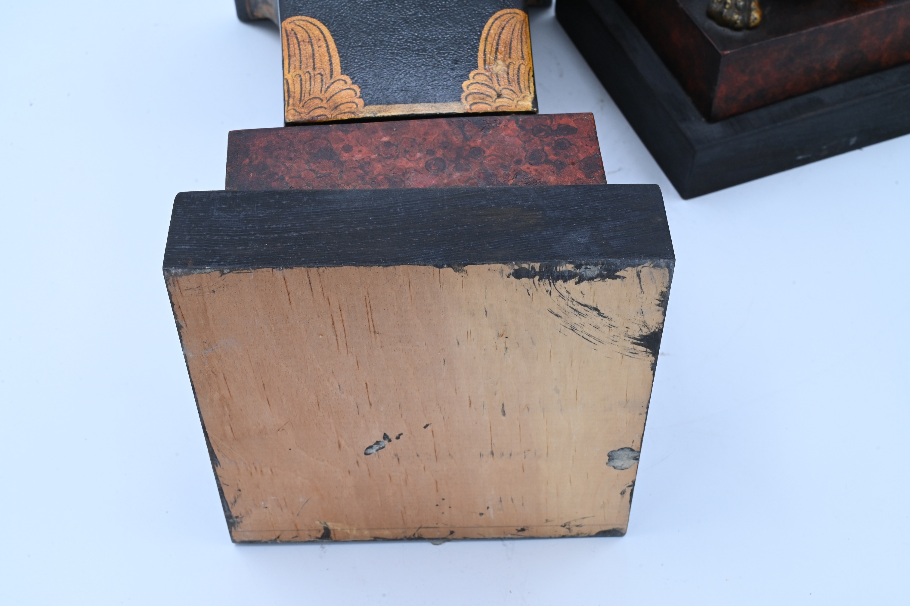 square form painted black with gold musical trophy and classical figure on sides, on claw feet resting on square platform base