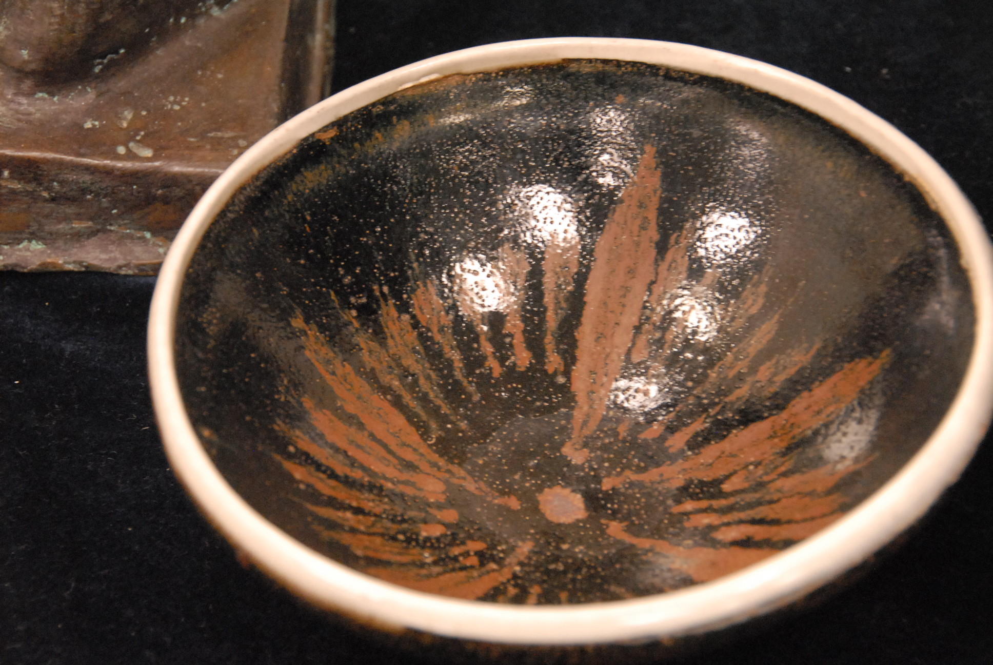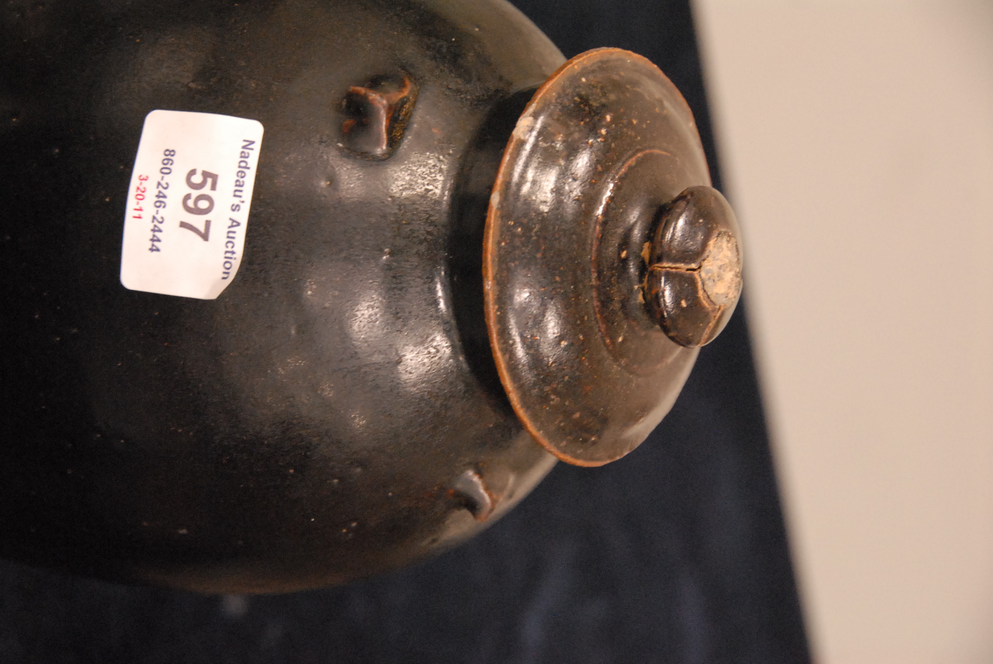 Song dynasty black glazed bowl with brown splashes design, and a Song dynasty black glazed tall jar with cover.