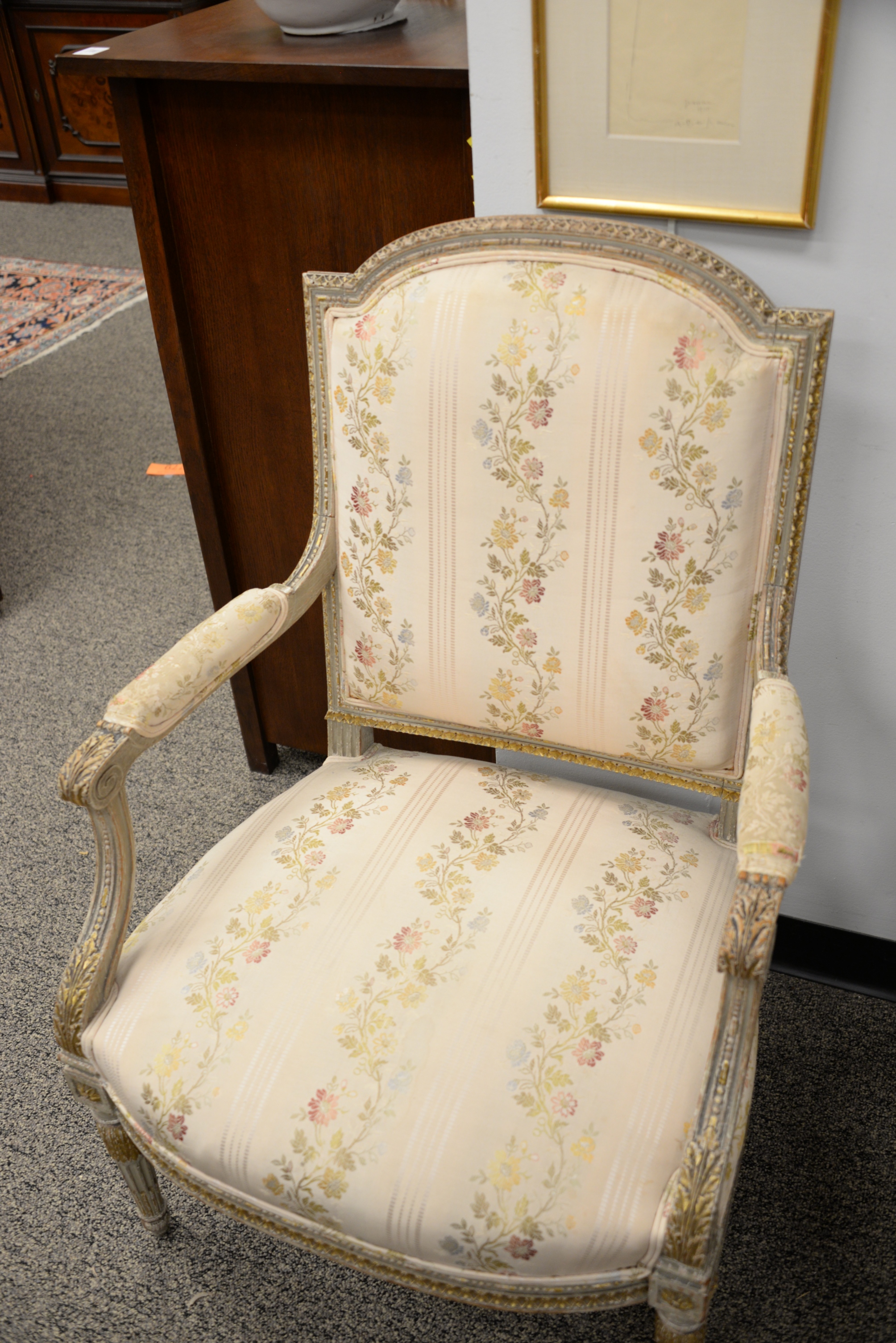 Suite of Four Louis XVI Style Upholstered Fauteuils, painted and partial gilt, each having arched crest above leaf top frame, padded and foliate carved arms over bowed seat, on acanthus carved fluted legs, height 40 inches, width 25 1/2 inches