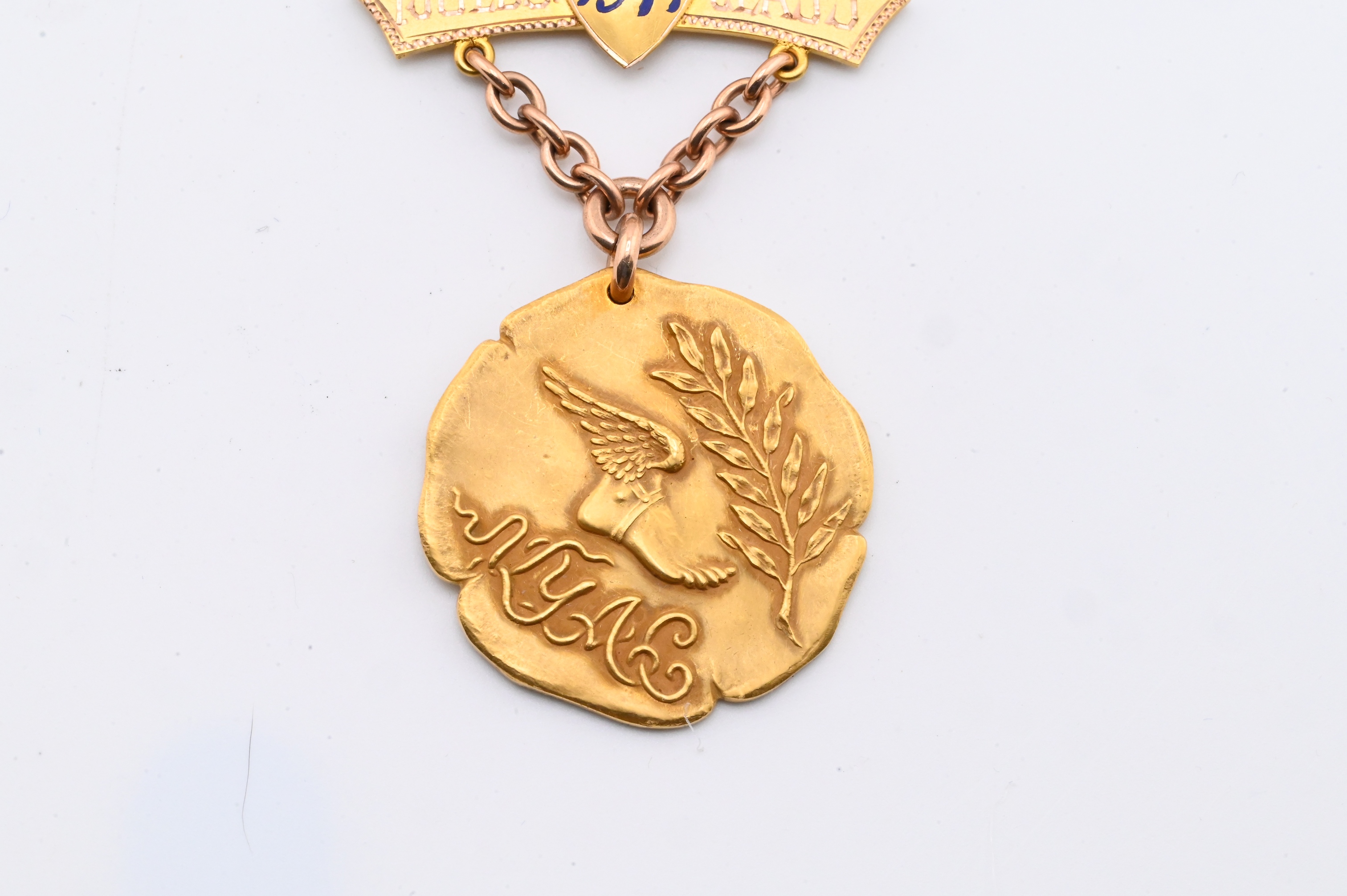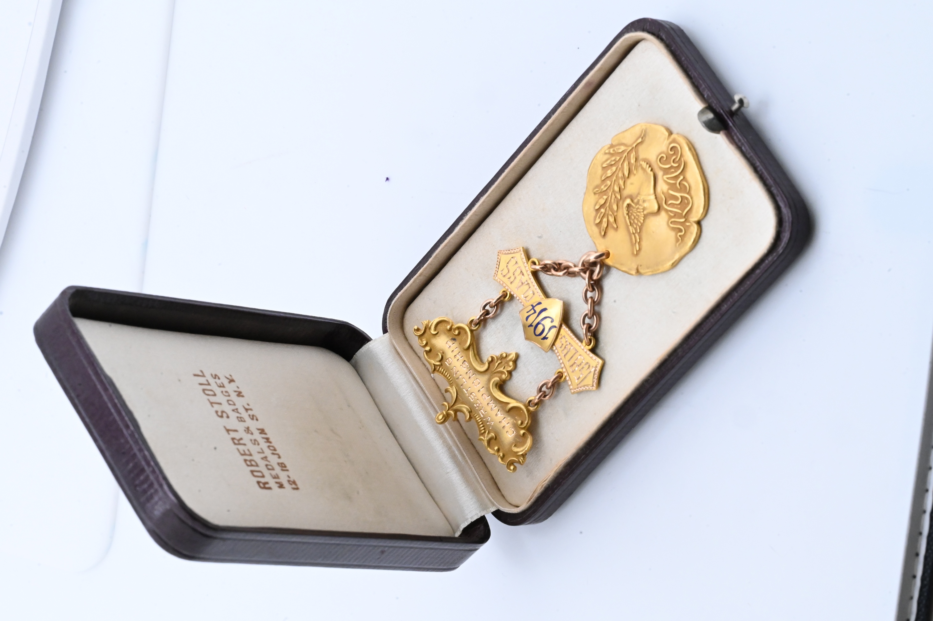 Robert Stoll, New York, solid gold medal with enameled “1914” shield and bar engraved Wrestling Championship 158 lbs Class, suspended from chain link, reverse stamped R. Stoll N.Y. Solid Gold, in original fitted case