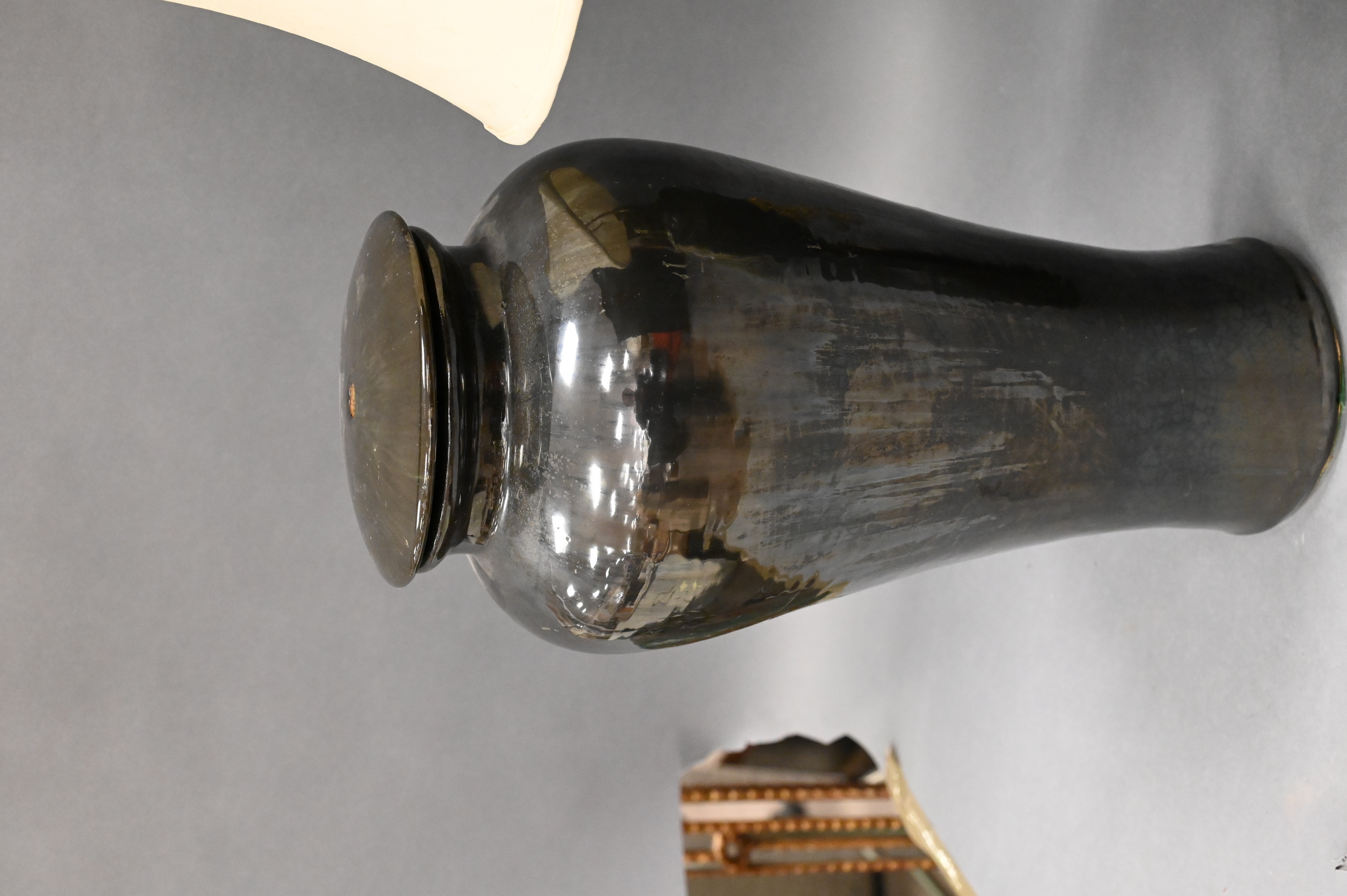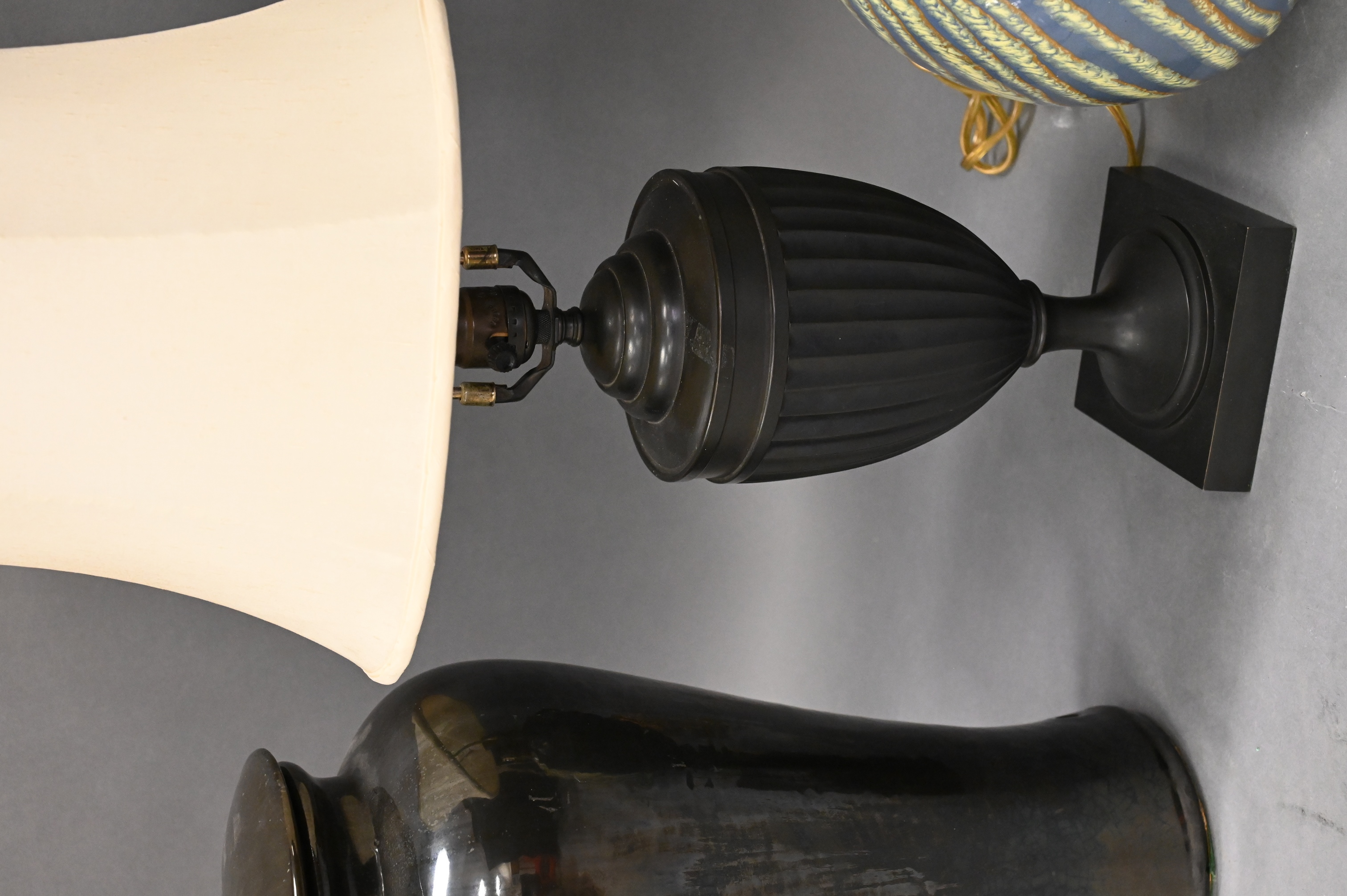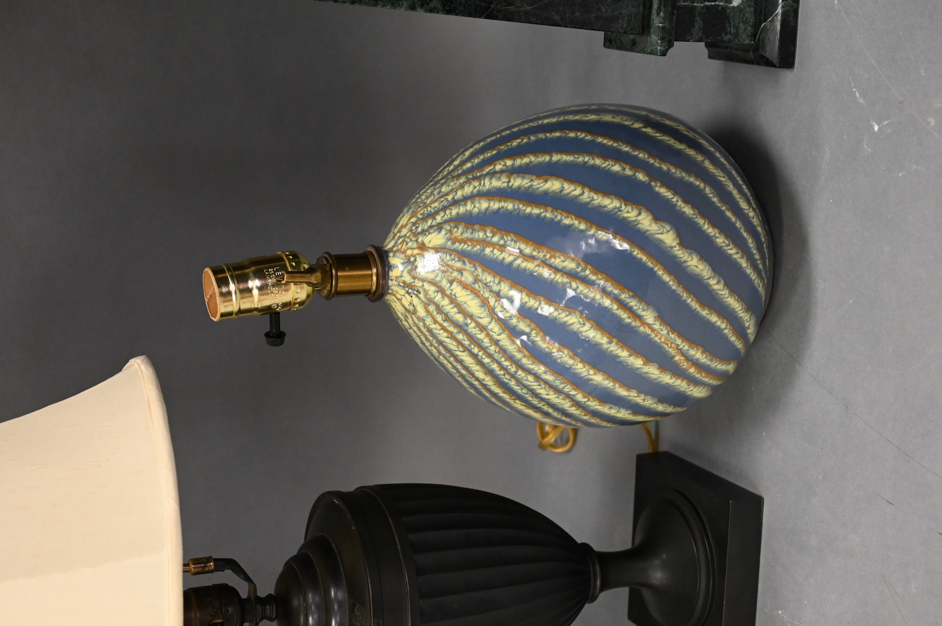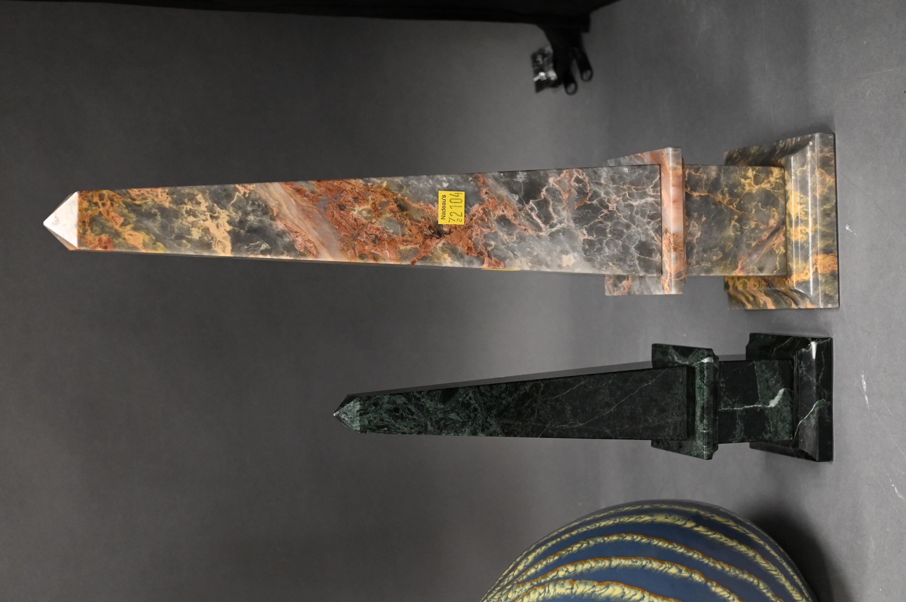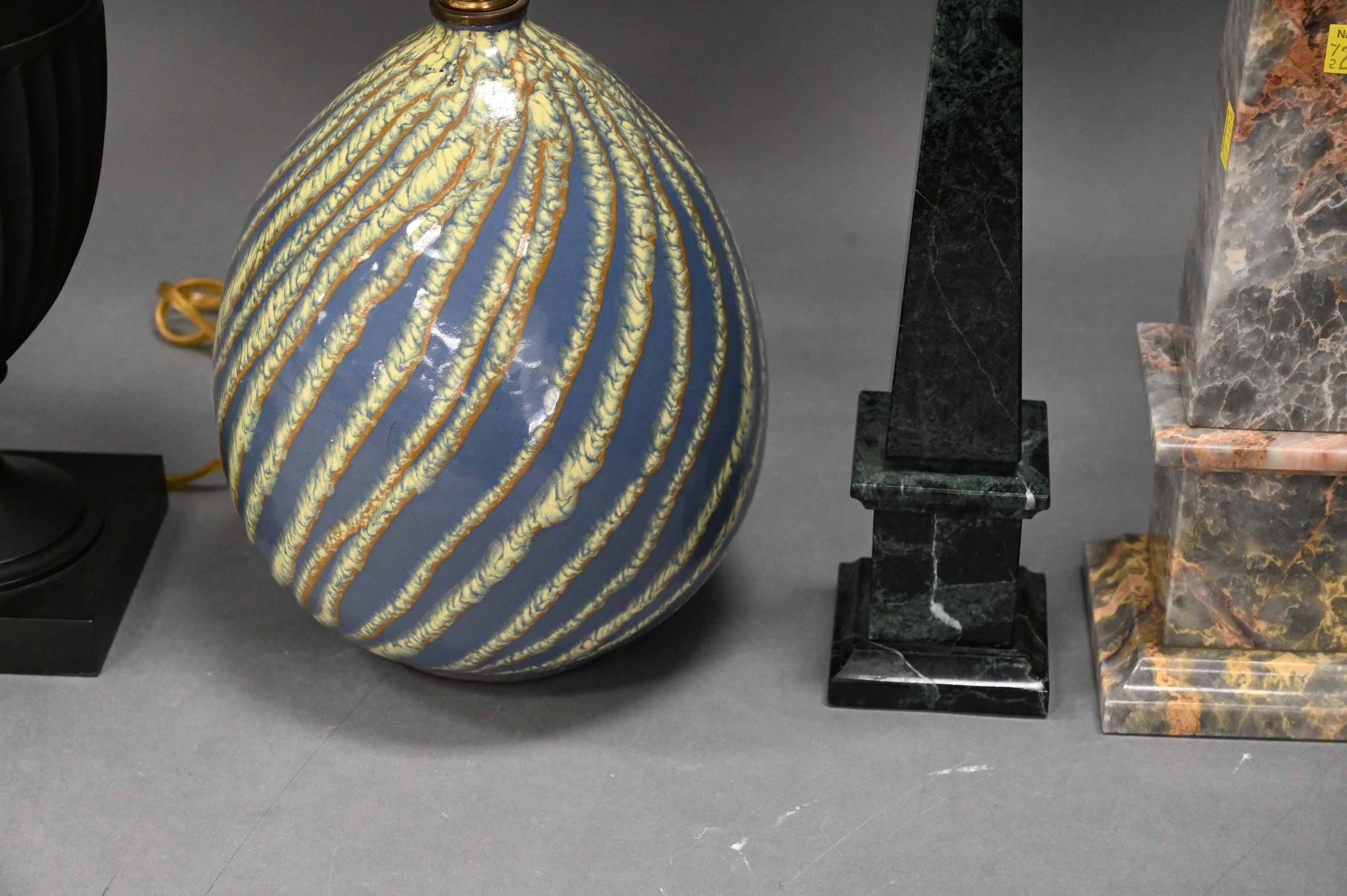 to include two obelisks marked on bottom, two table lamps, and one ceramic covered urn