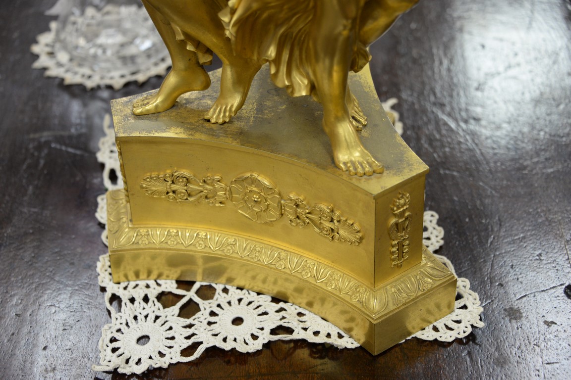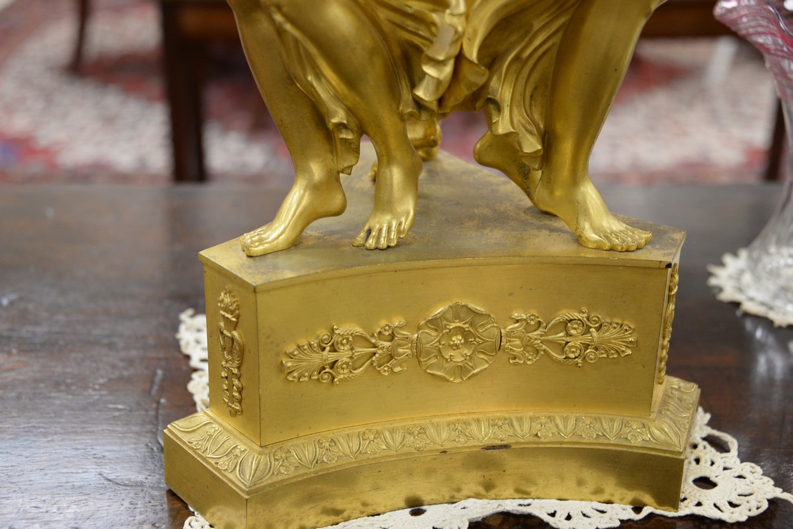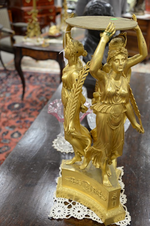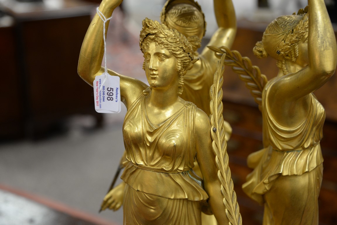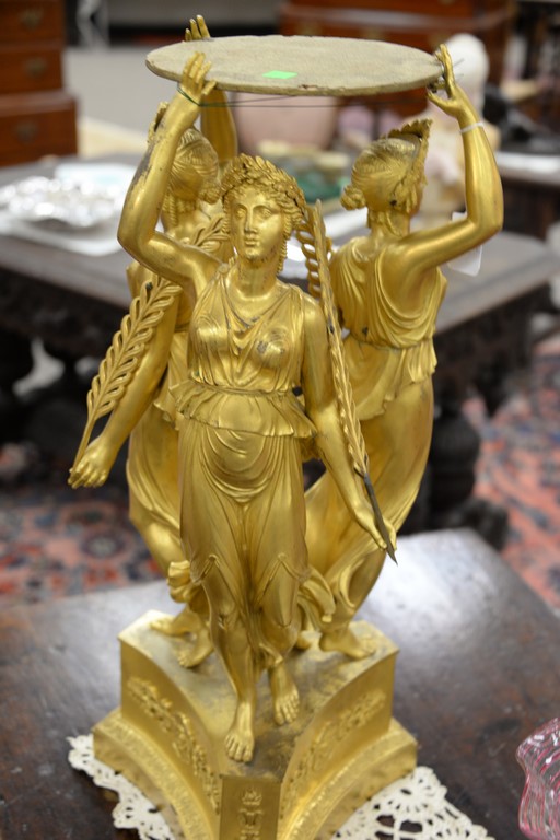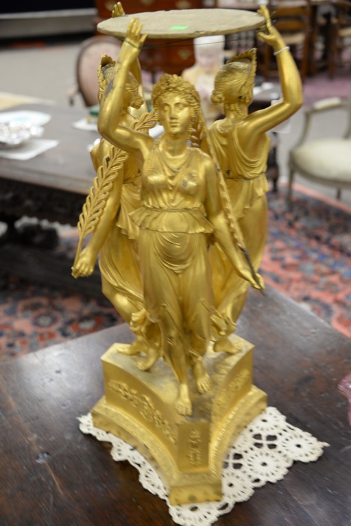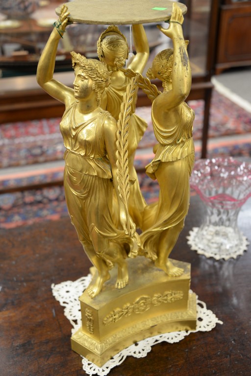 Lot 598: Large French empire gilt bronze surtout-de- table/center piece having three Classical standing figures with wreaths around their hea…