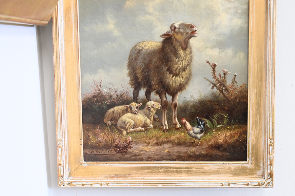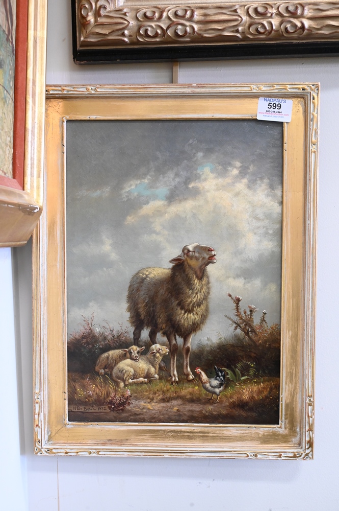 Lot 599: Henri De Beul (1845-1900), sheep and chicken, oil on canvas, signed and dated lower left H. De Beul 1882, 14″ x 10″.