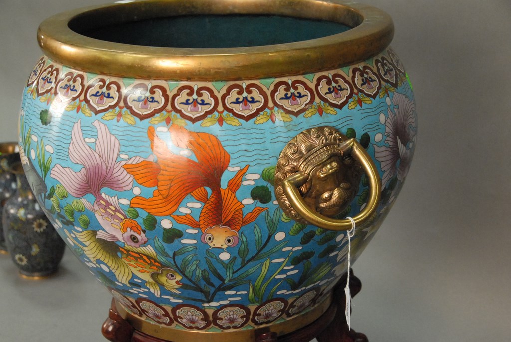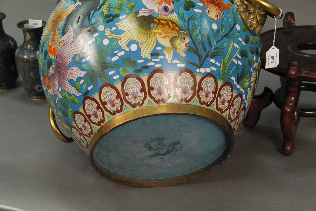 Lot 599: Large cloisonn fish bowl decorated with swimming coy fish, bubbles, and plants mounted with brass lion head handles and brass top a…