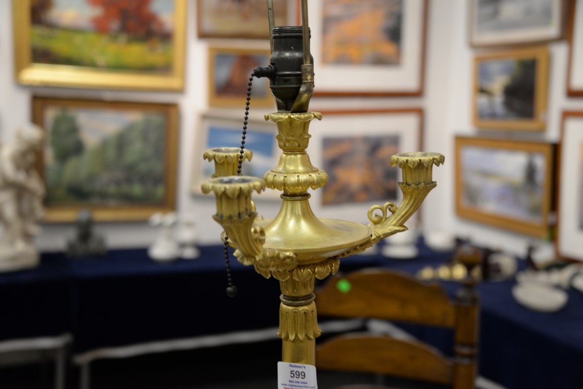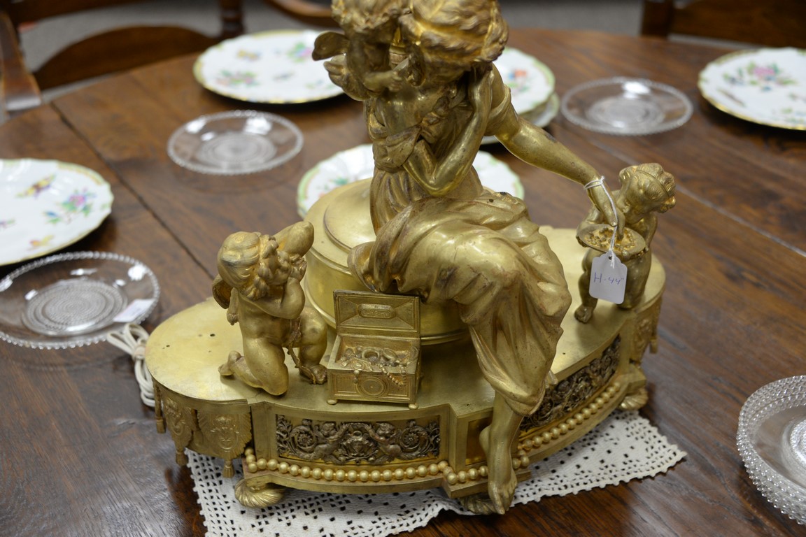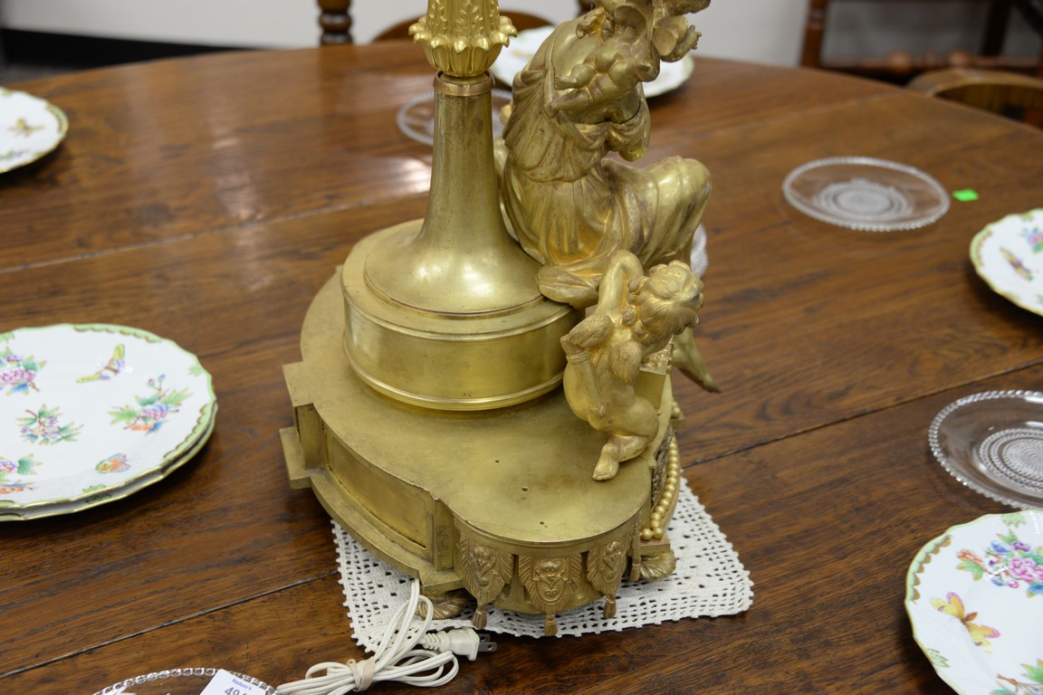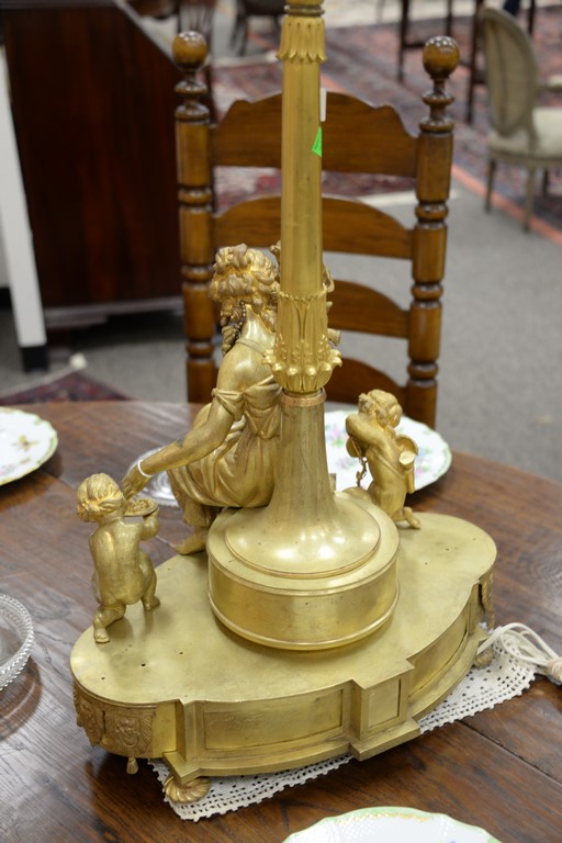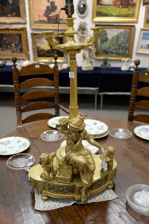 Lot 599: Large gilt bronze figural candelabra having four candle holder top over base with three putti figures and a woman with jewels, on la…