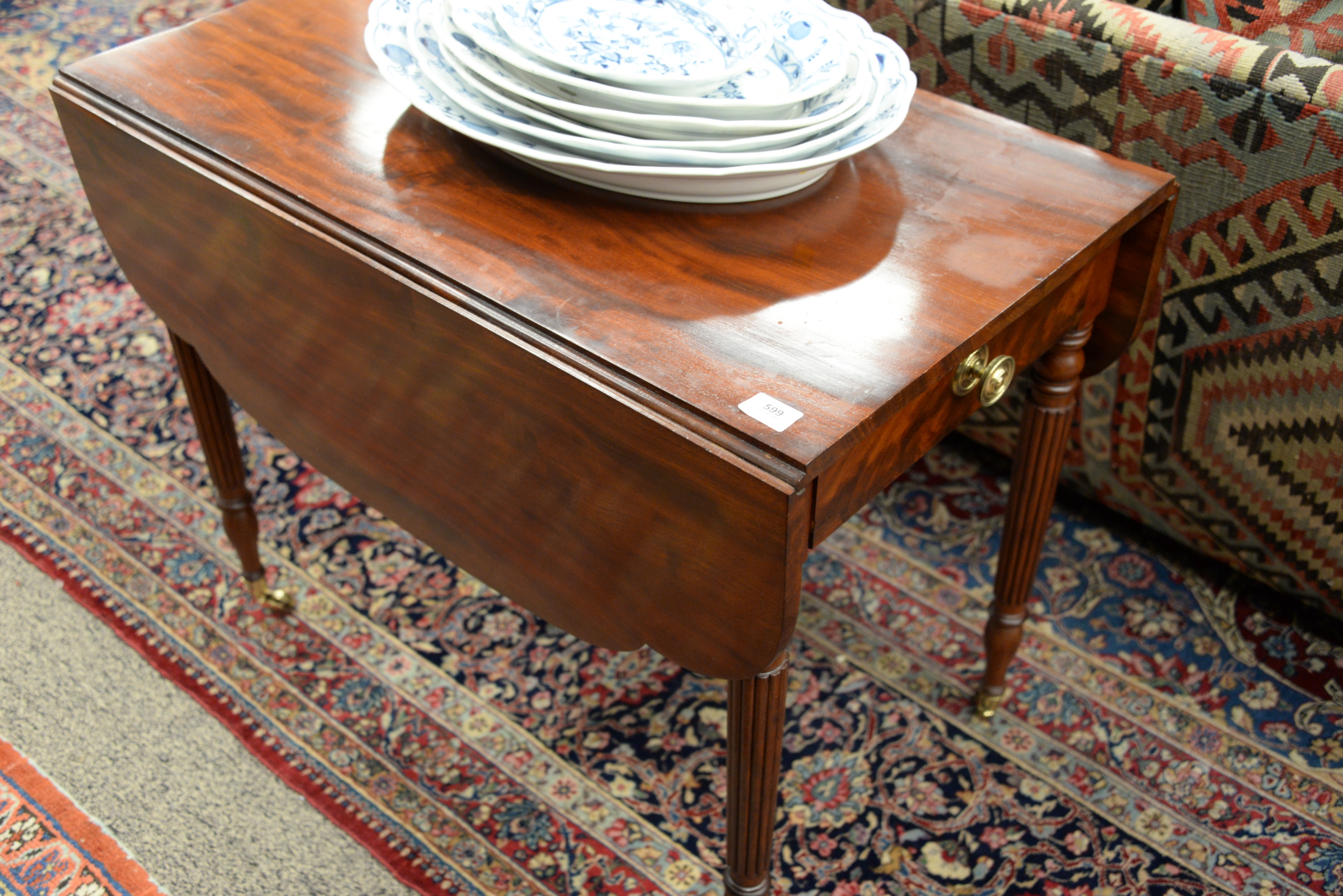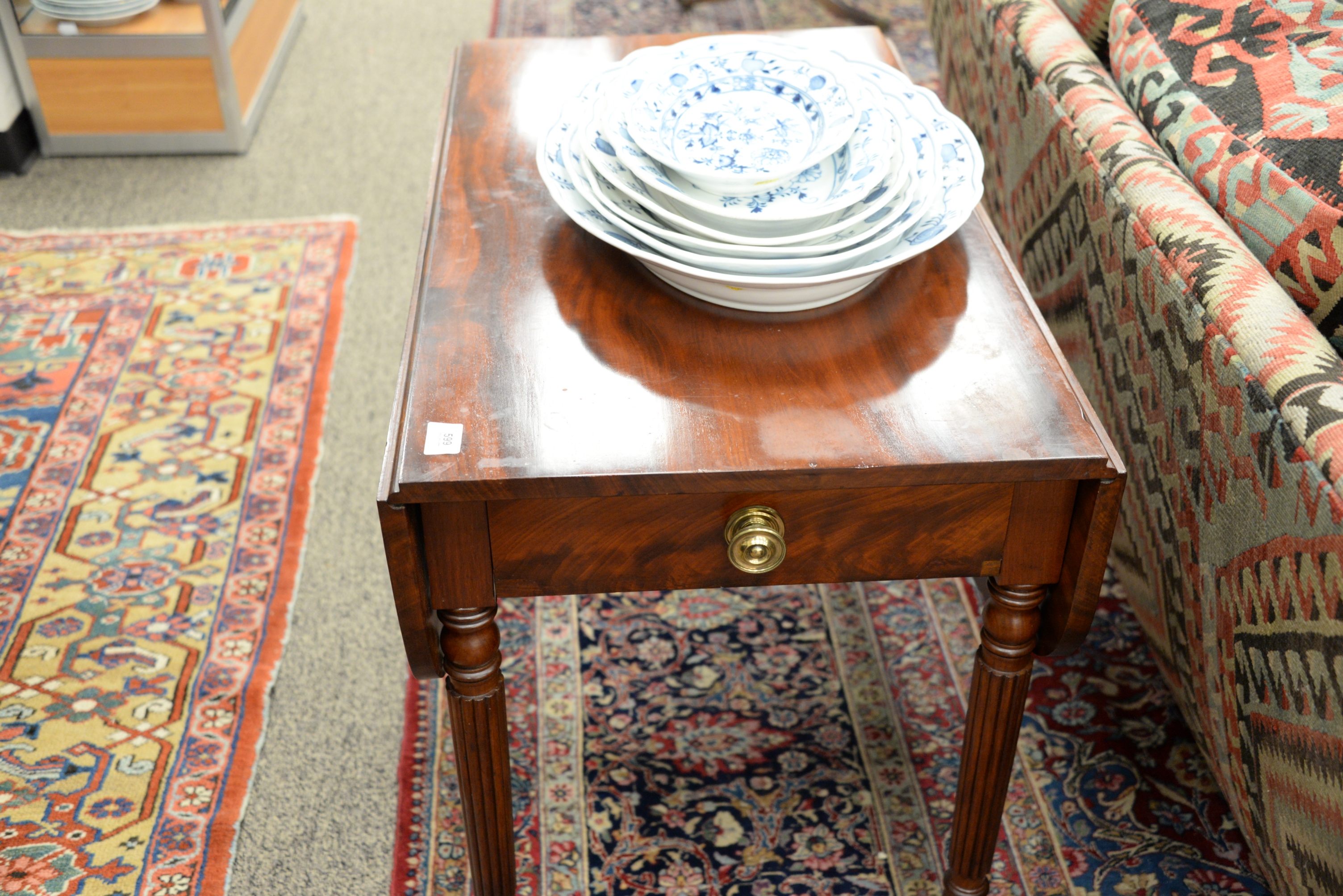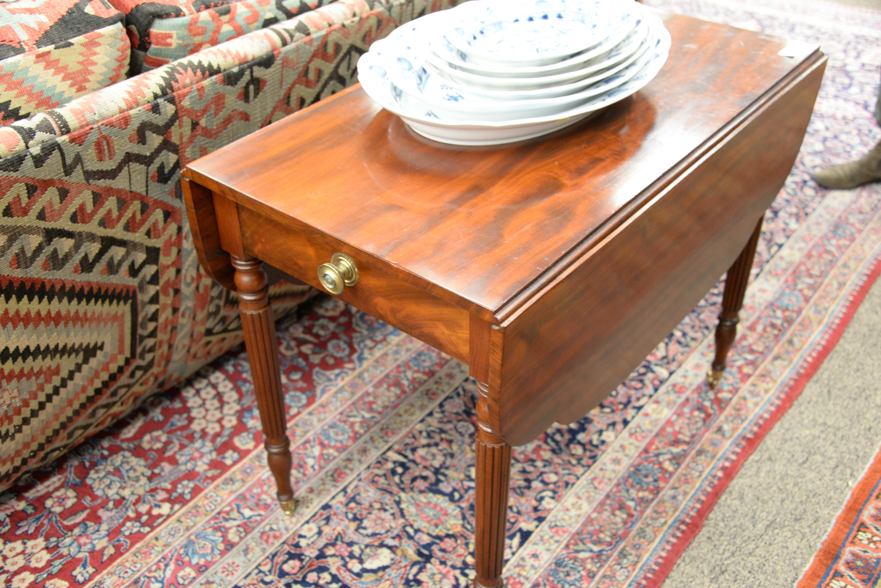 Sheraton Mahogany Drop Leaf Table, on fluted legs with one drawer, all ending in brass casters, circa 1820, top 20″ x 35 1/2″.