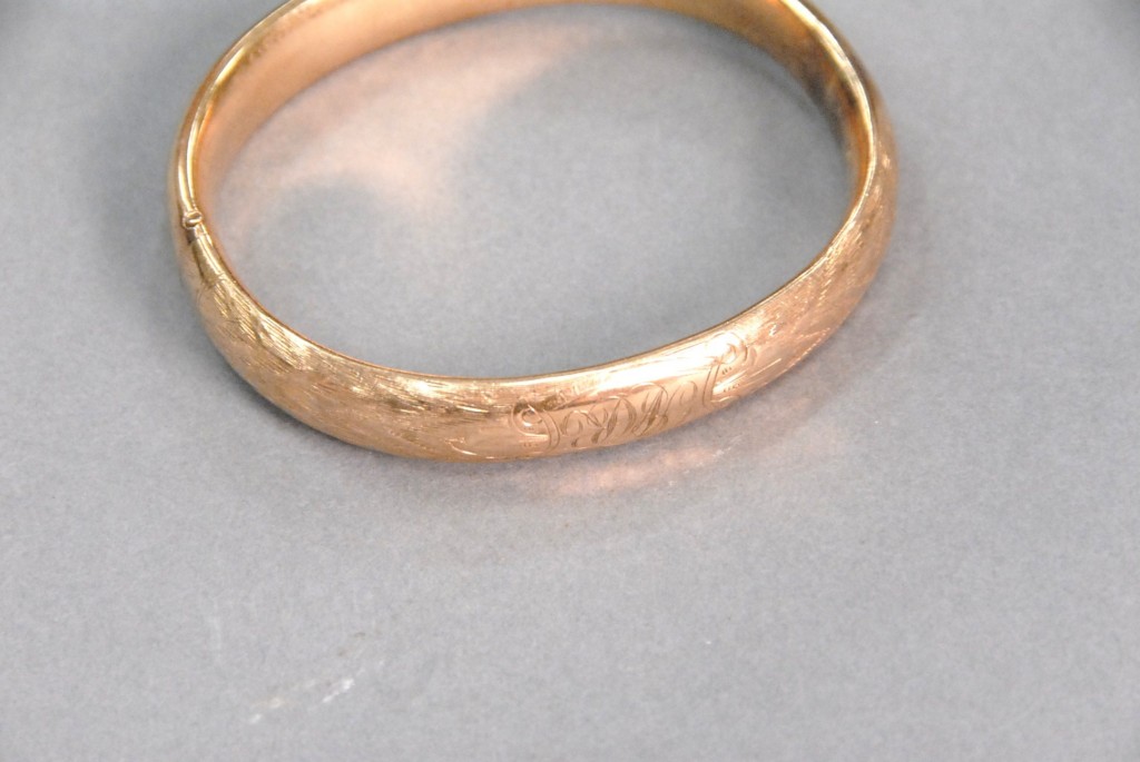 Lot 6: 10kt gold Victorian bangle bracelet with monogram, 17.1 grams.