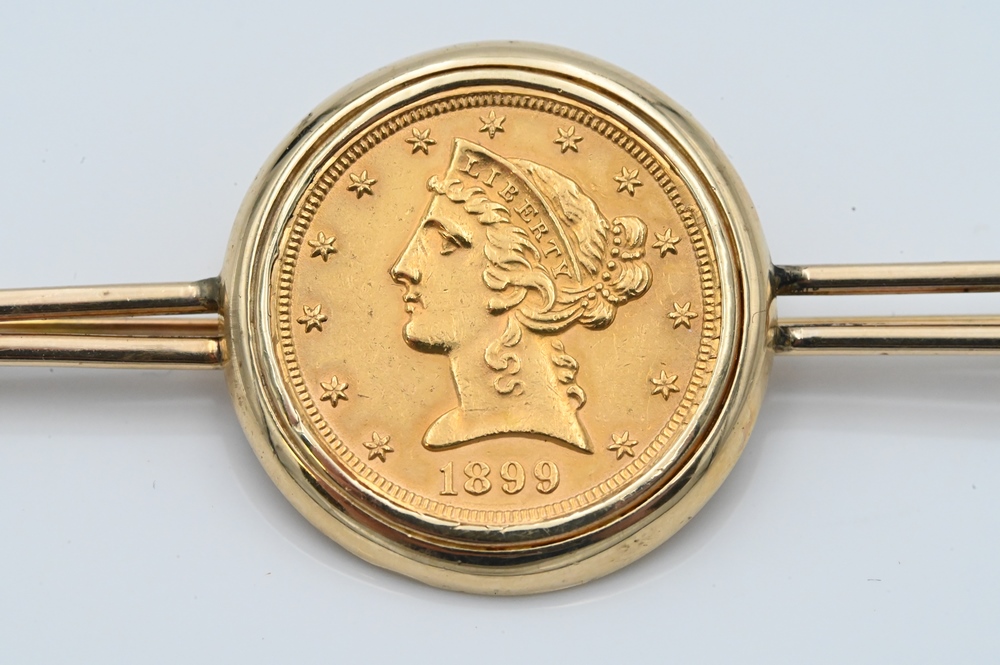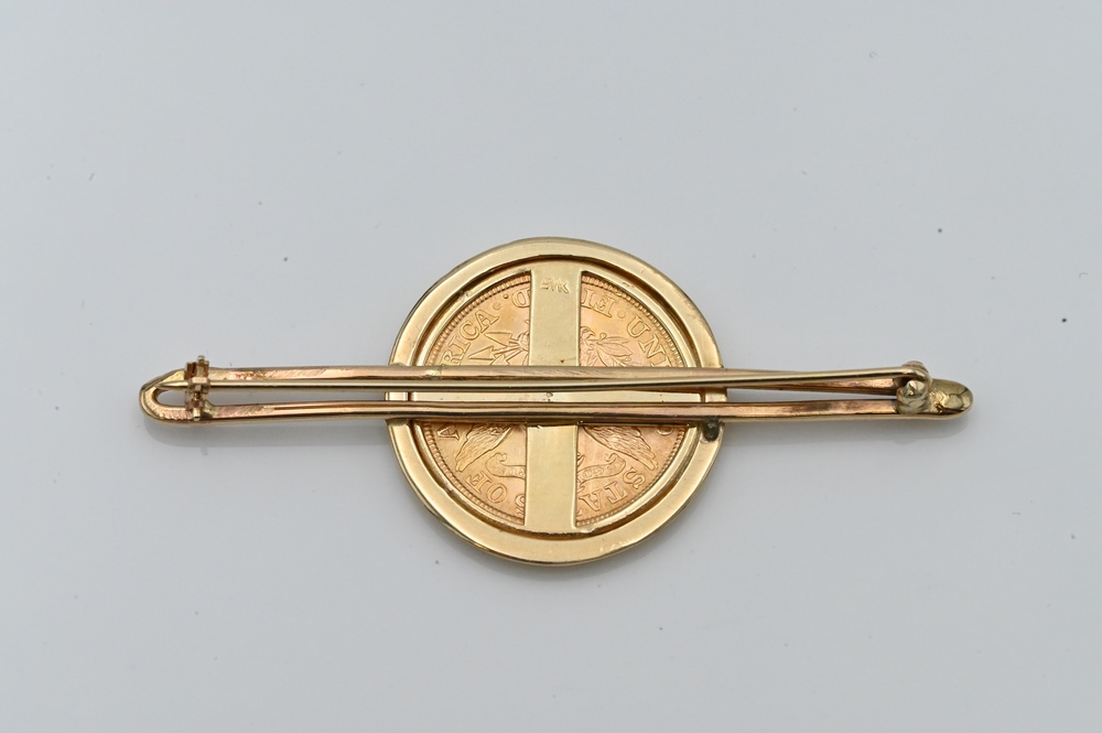14 Karat Brooch Set, mounted with 1899 five dollar Liberty gold coin, 16.3 grams.