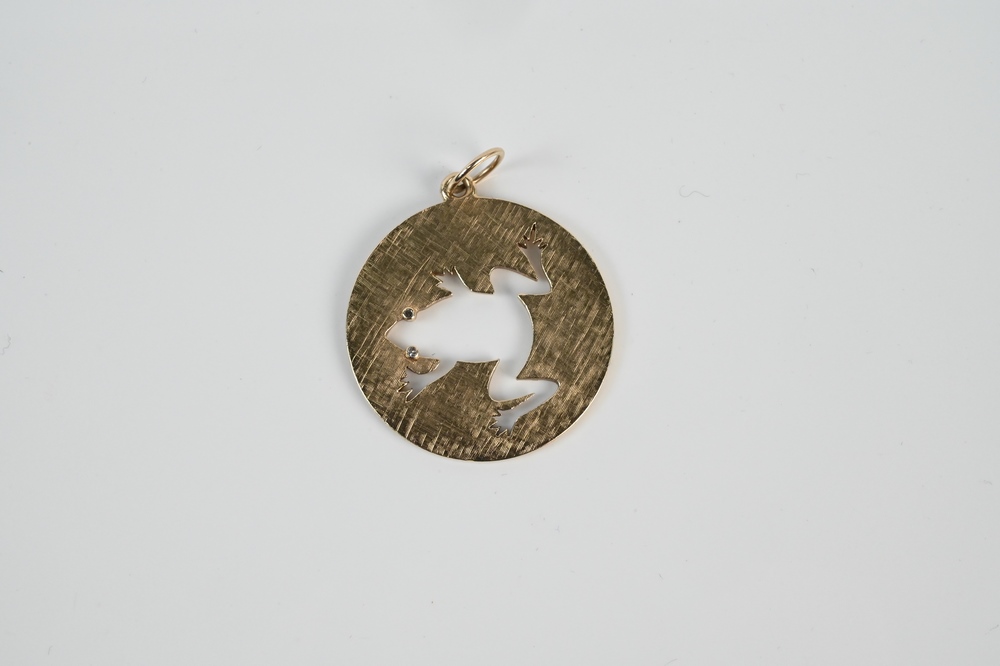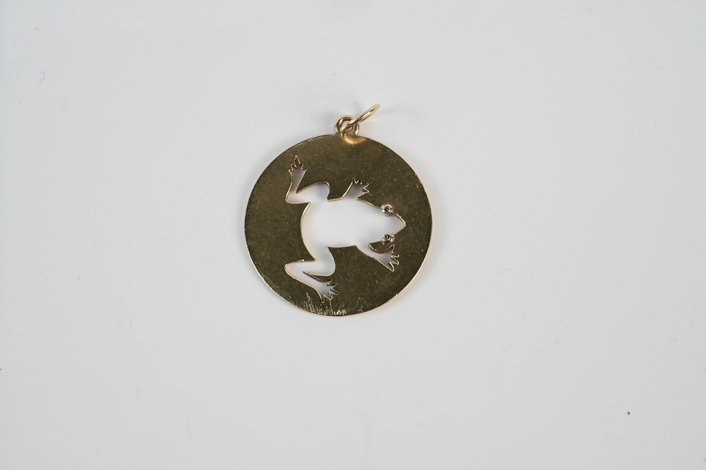 14 Karat Gold Pendant, having cut out frog with diamond eyes, diameter 1 3/8 inches, 12.6 grams.