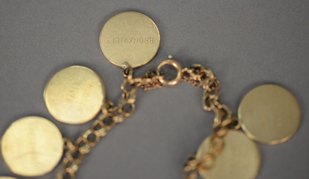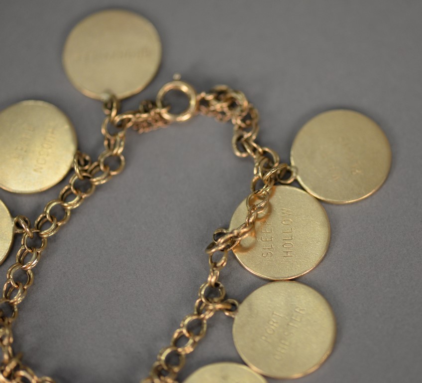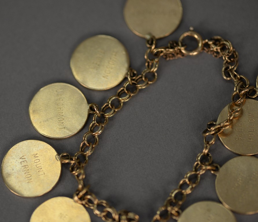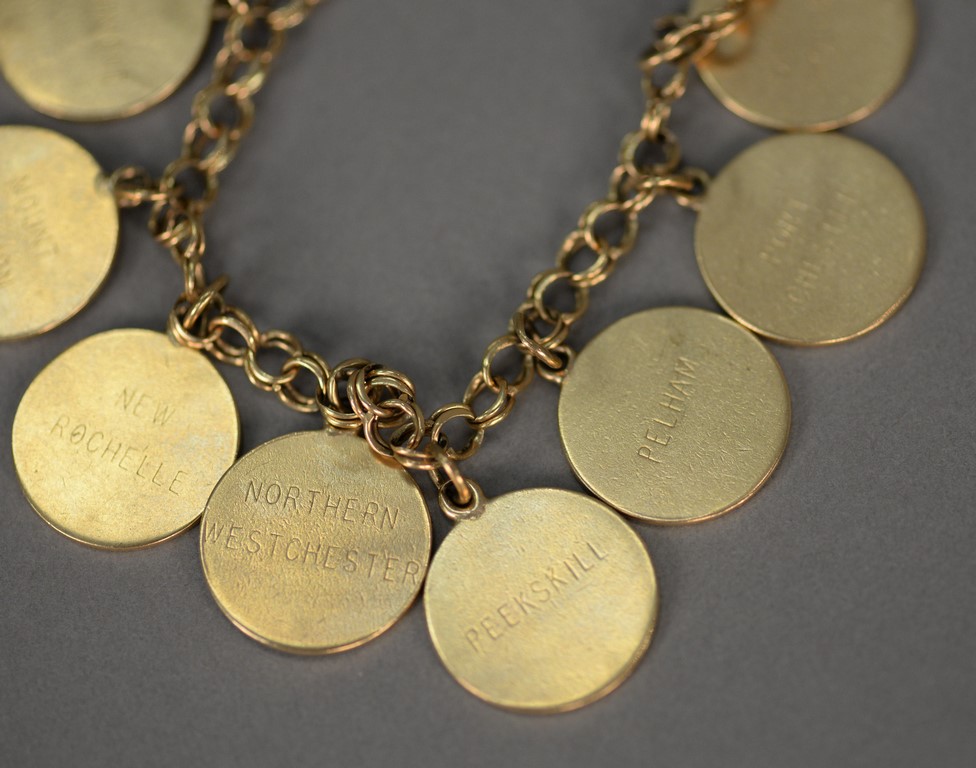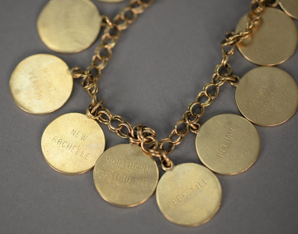 14K gold charm bracelet noted with town medallions. 61.2 grams