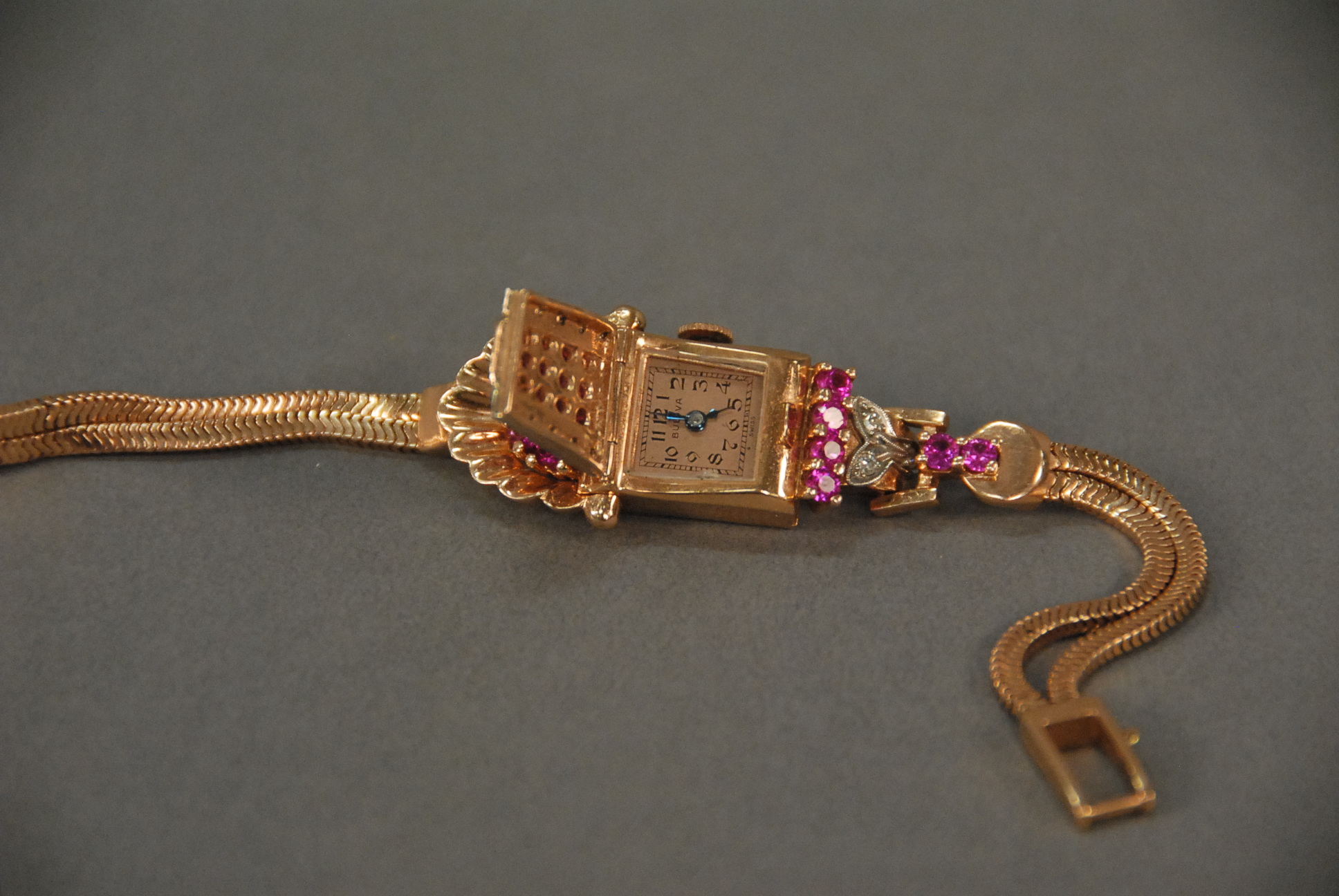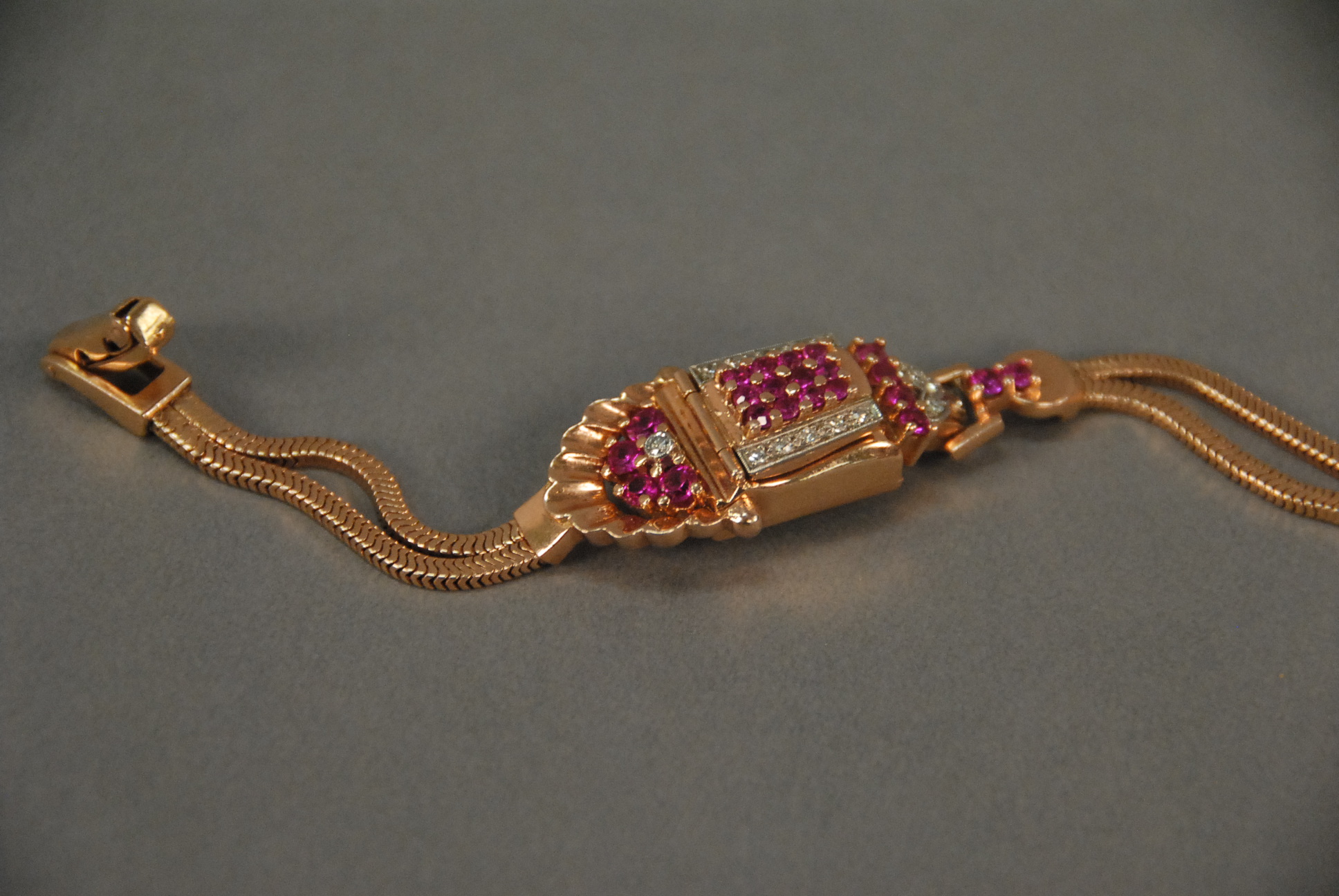 Lot 6: 14K pink gold Bulova ladies wristwatch, Art Deco style with 14K gold bracelet and mounted with rubies and diamonds. 28.3 grams total weight