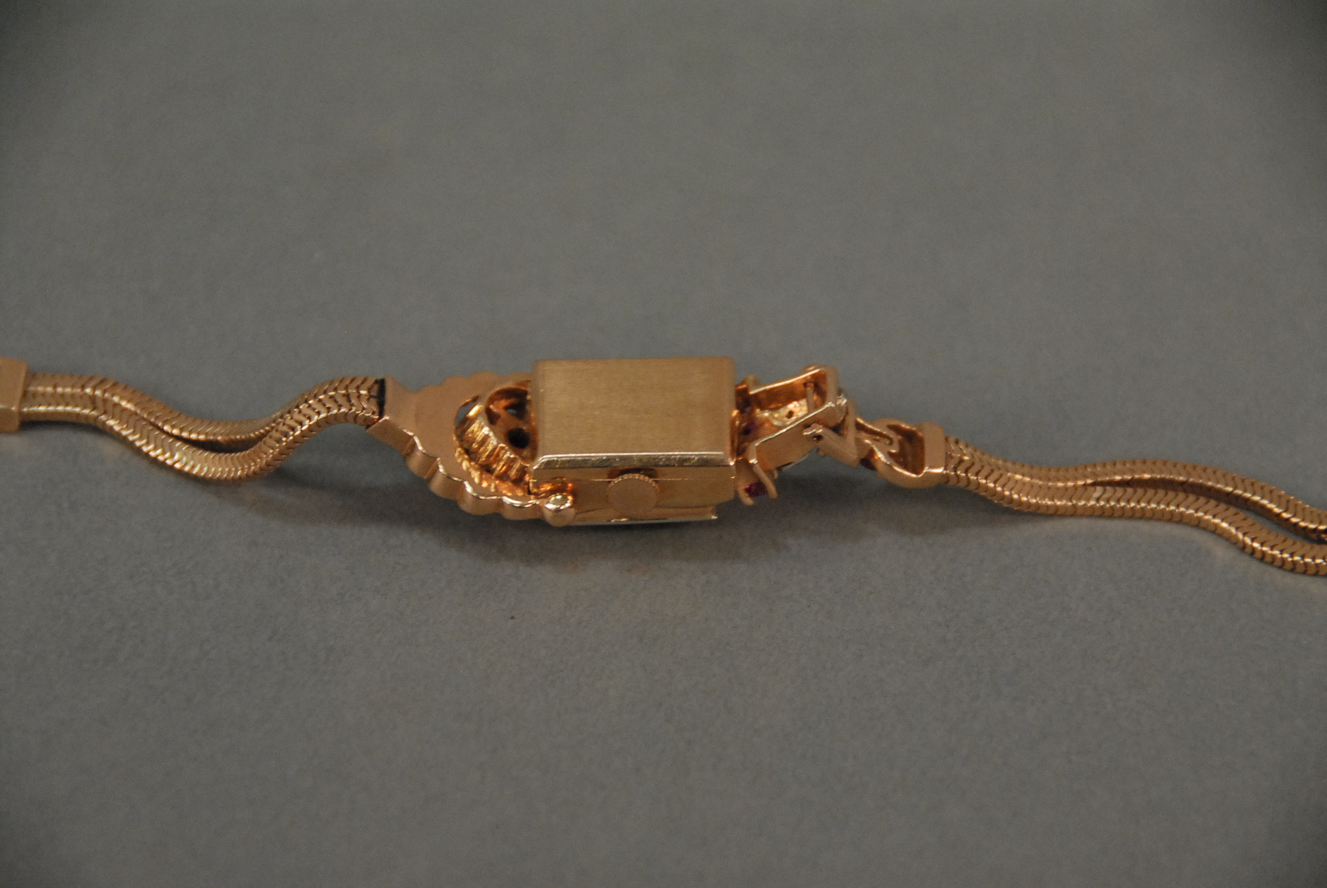 14K pink gold Bulova ladies wristwatch, Art Deco style with 14K gold bracelet and mounted with rubies and diamonds. 28.3 grams total weight