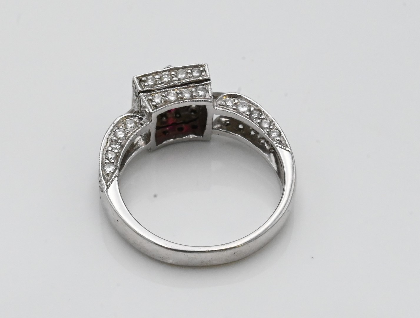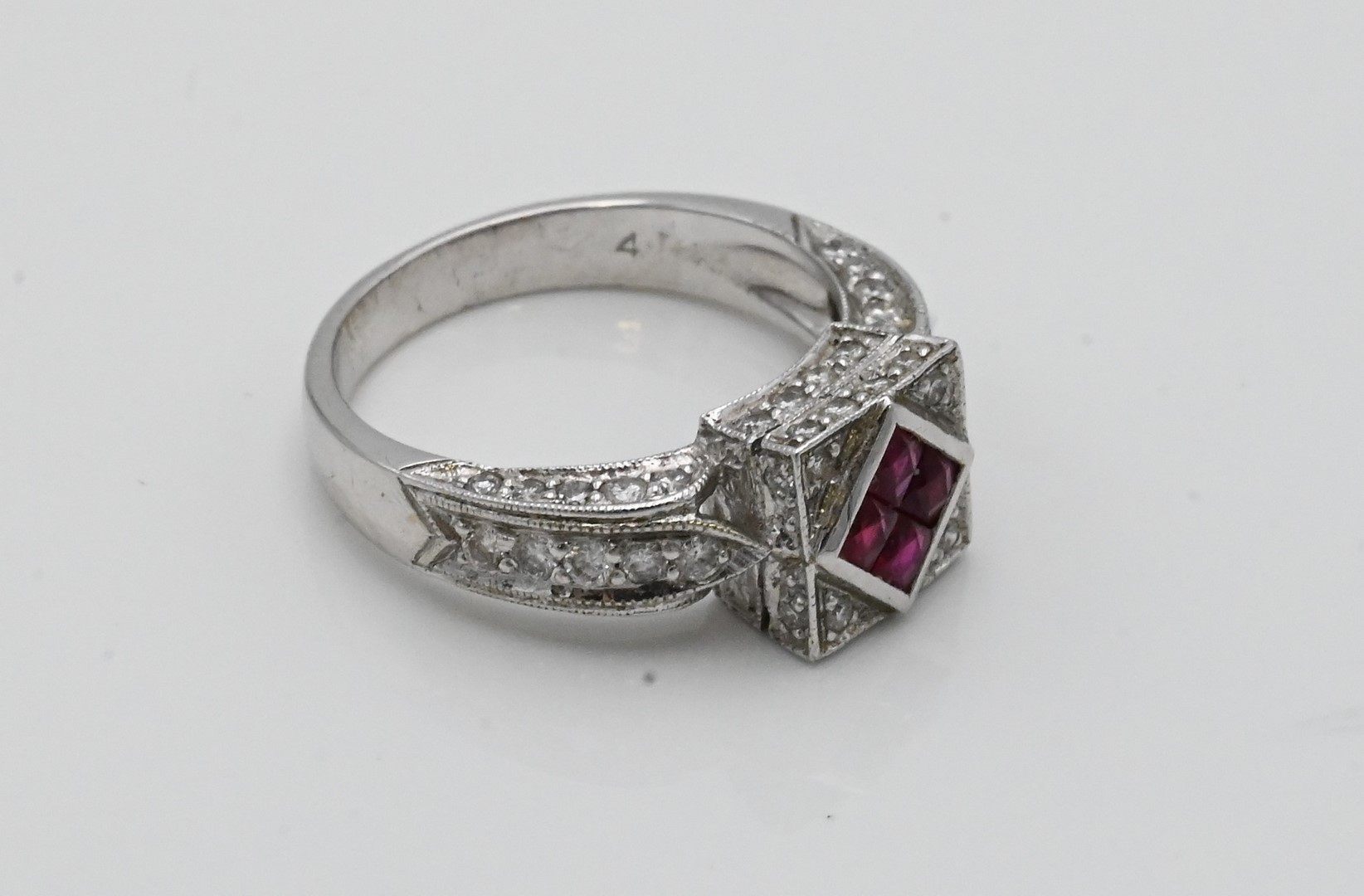 18 Karat White Gold Ring, set with four center rubies and small diamonds, size 6 1/2, 5 grams.