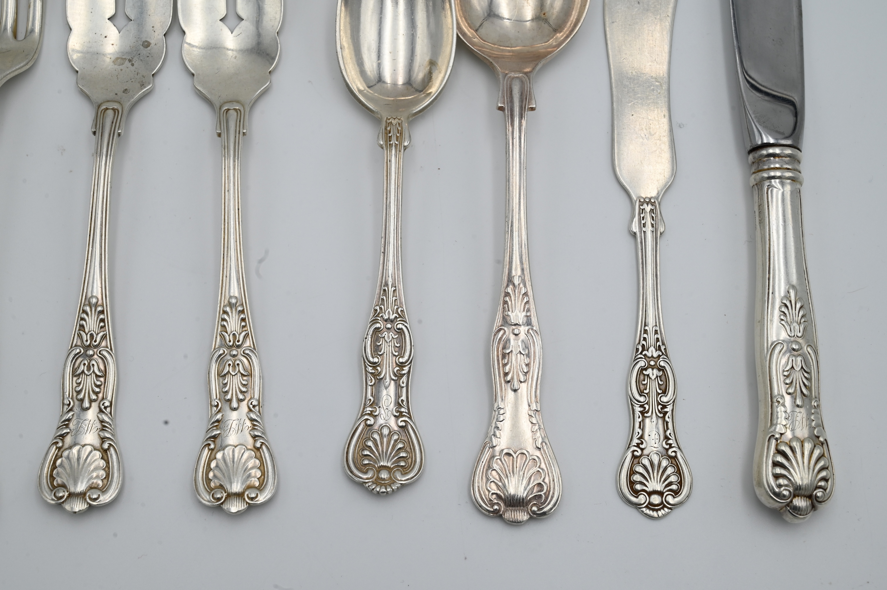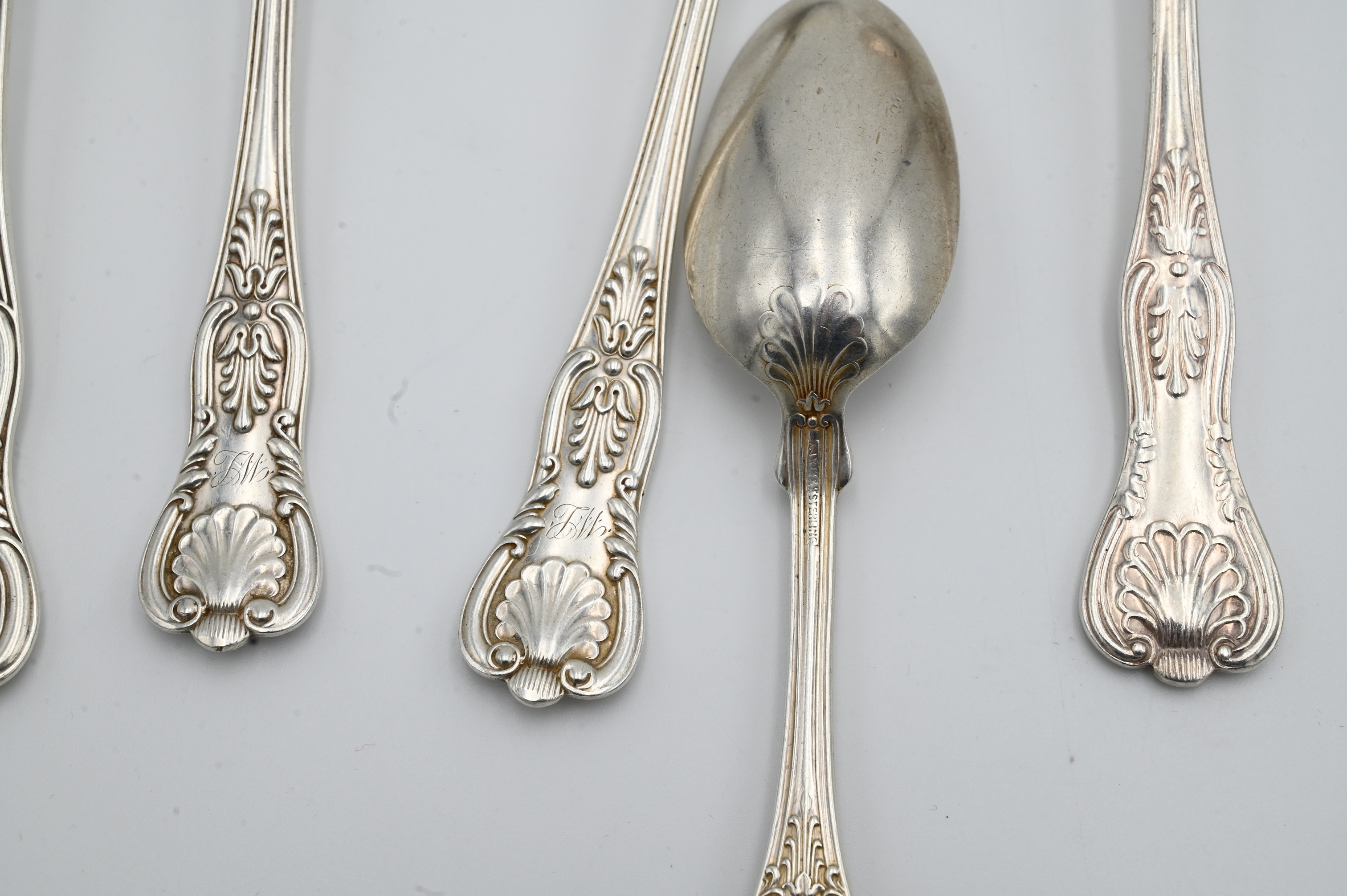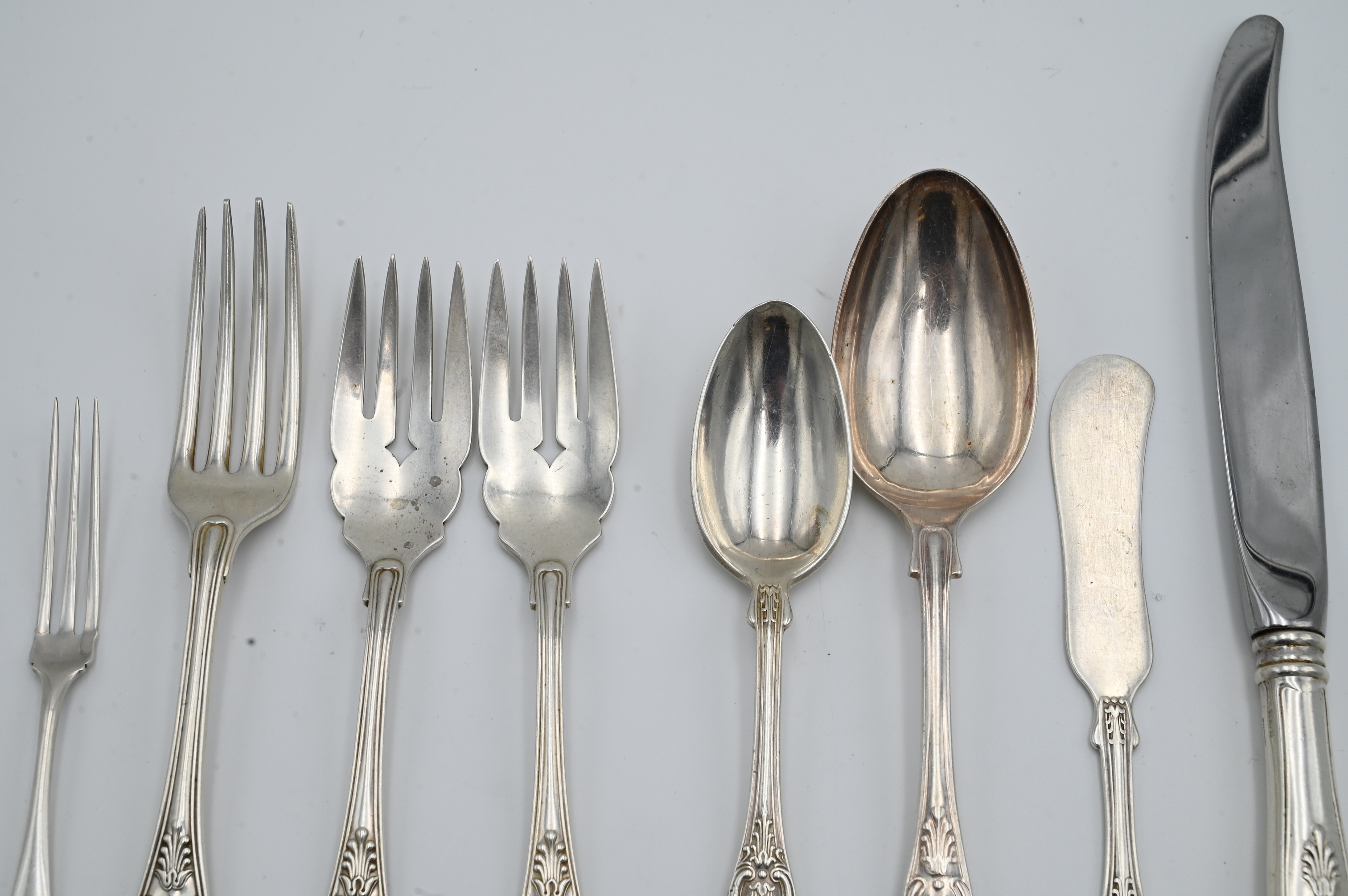 42 Piece Sterling Silver Flatware, King pattern, partial set, 50.1 t.oz. plus seven handles; 7 lunch forks, 12 salad forks, 2 table spoons, 8 teaspoons, 5 butter knives, 7 dinner knives, along with 1 pickle fork.