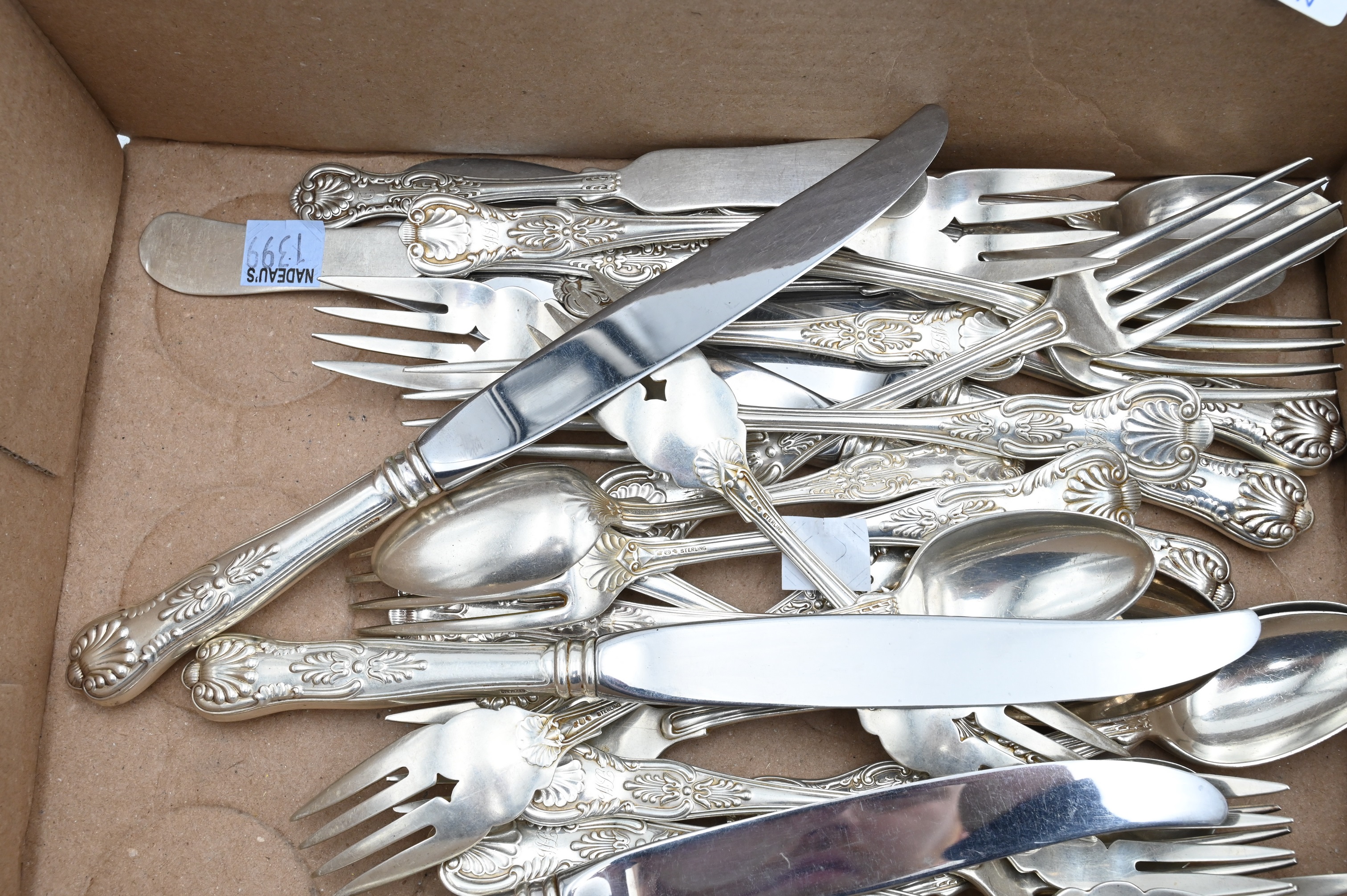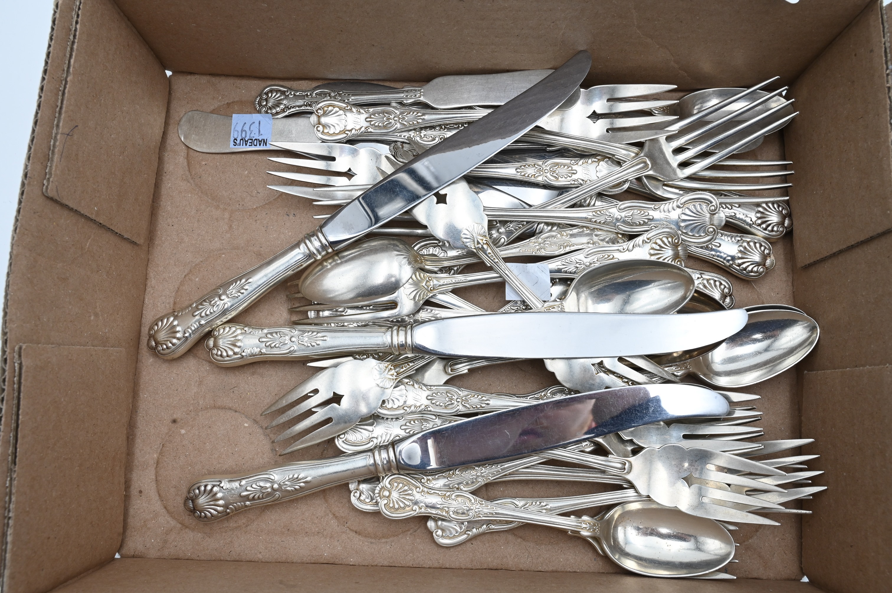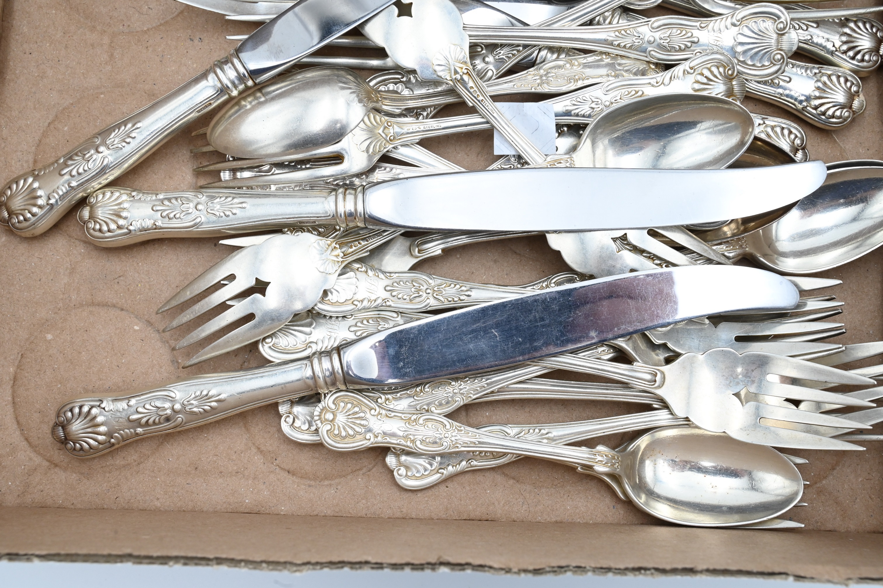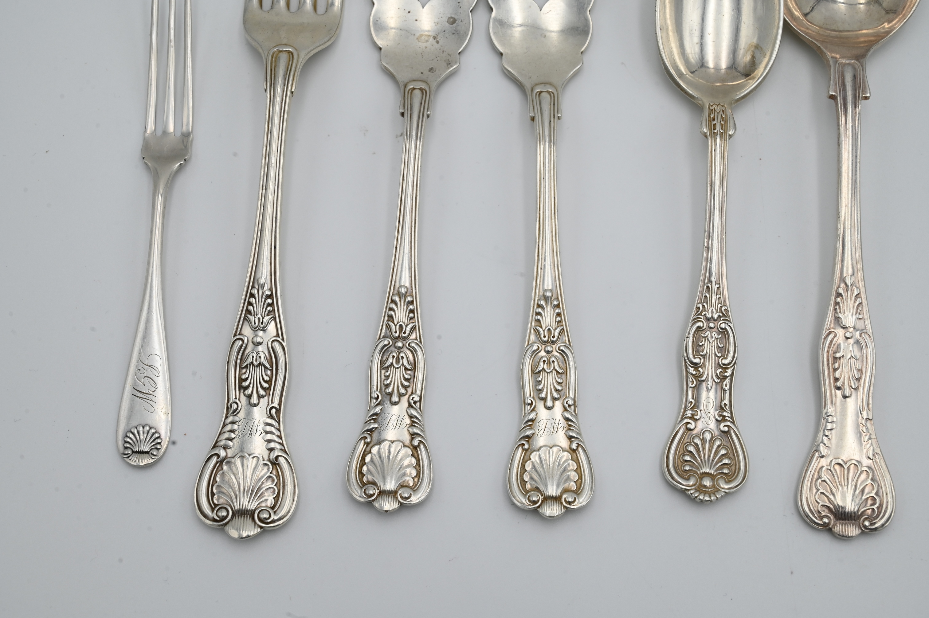 42 Piece Sterling Silver Flatware, King pattern, partial set, 50.1 t.oz. plus seven handles; 7 lunch forks, 12 salad forks, 2 table spoons, 8 teaspoons, 5 butter knives, 7 dinner knives, along with 1 pickle fork.