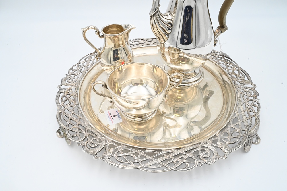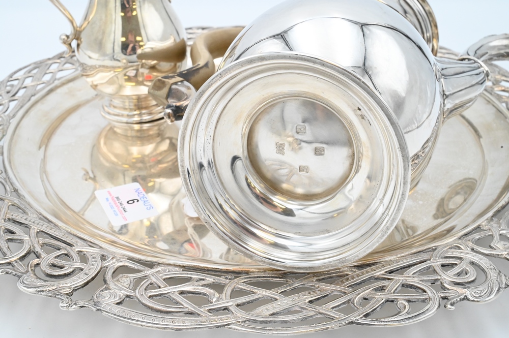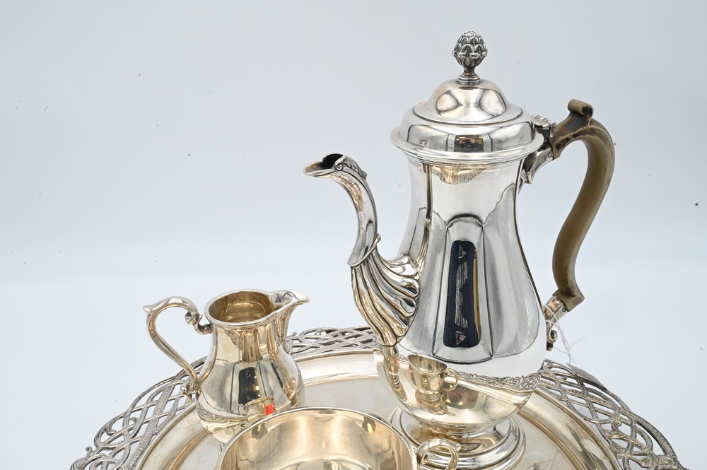 Lot 6: Four Piece Silver Set, to include teapot, sugar, creamer, and round tray, tray diameter 15 1/4 inches, 102.7 t.oz. Provenance: Collections of Norma Reilly, New Jersey.
