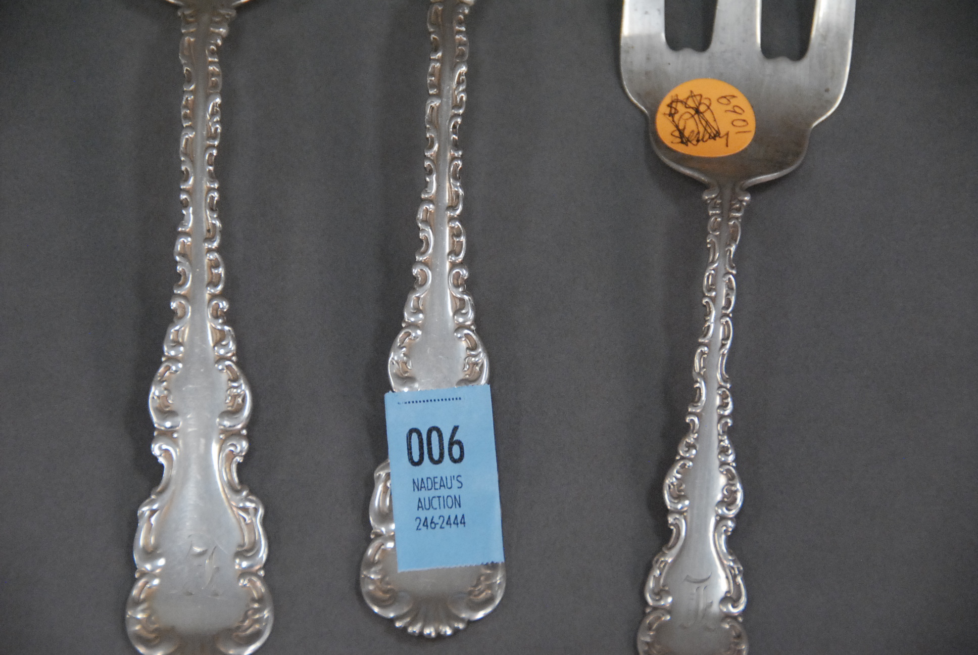Four piece sterling silver serving pieces including Gorham asparagus spoon, 10.5 t oz.
