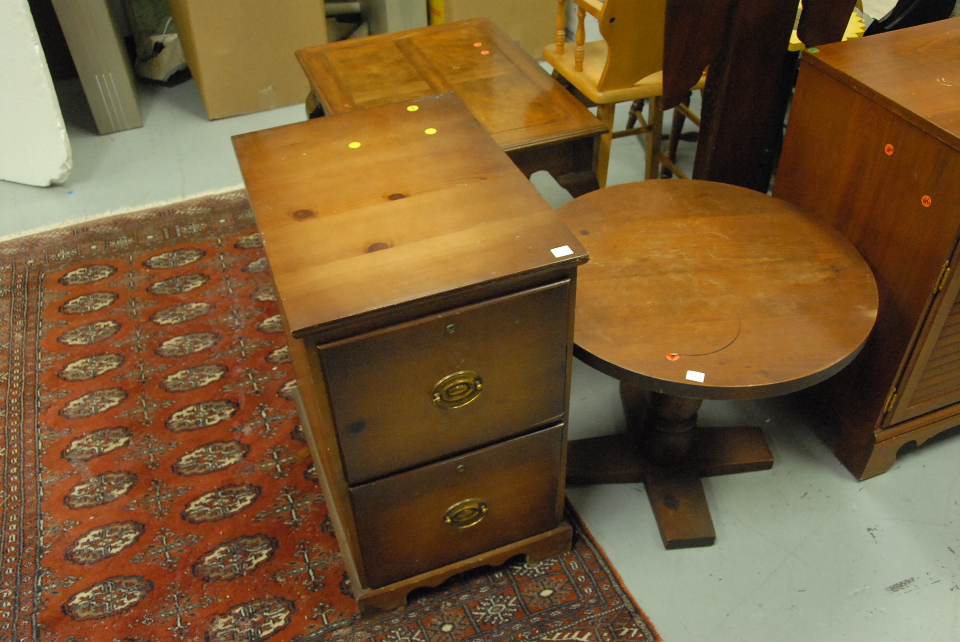 Group lot to include two figural stands, a man, as is, a woman, a flower, a carved totem pole, a high chair, a floor lamp with a parchment shade, a round table, an odd chair, file cabinet, a Queen Anne style table, and a rug.