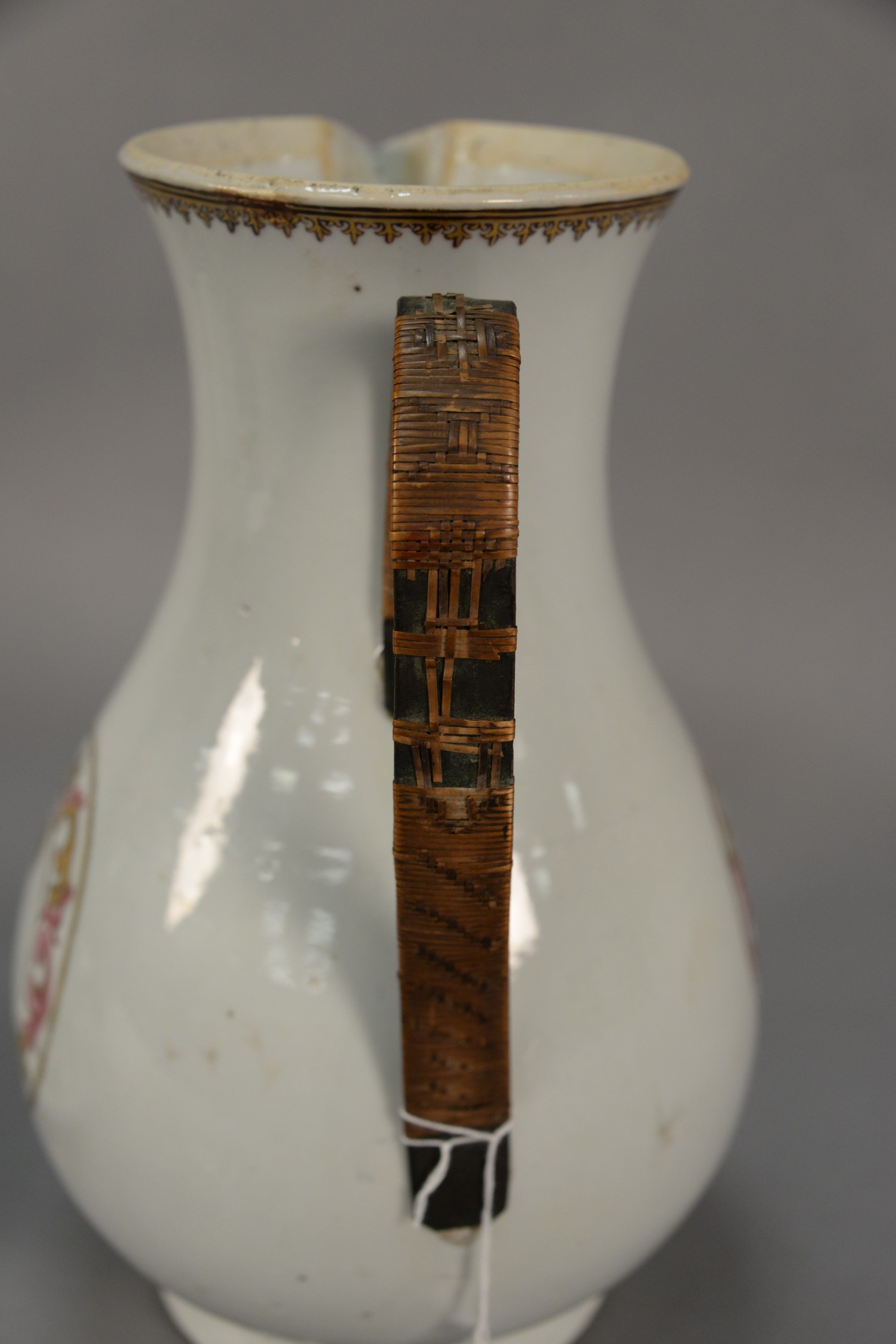Lot 6: Large Chinese export pitcher in baluster form having enameled crest on each side and flowers on the front replaced handle. ht….