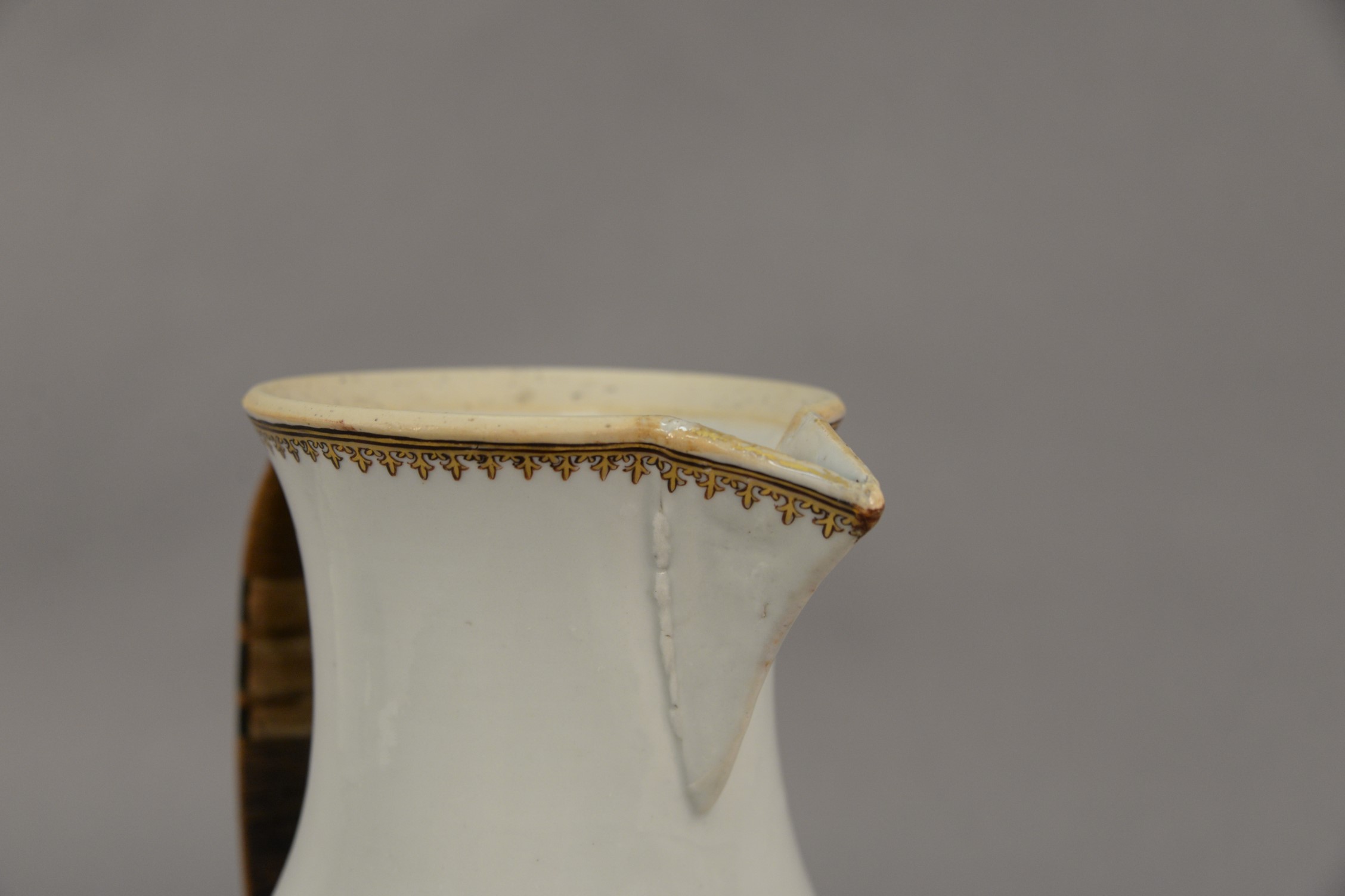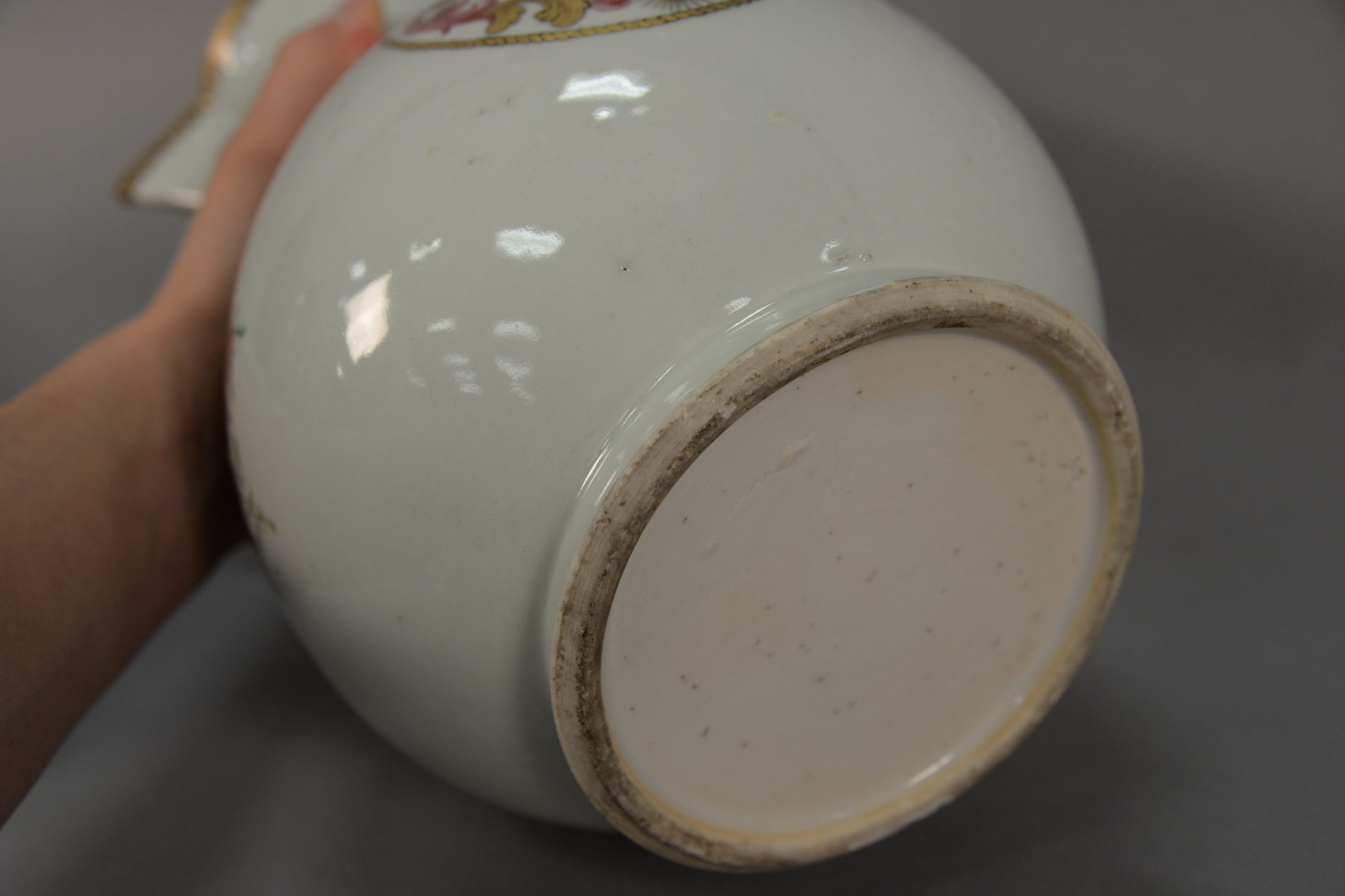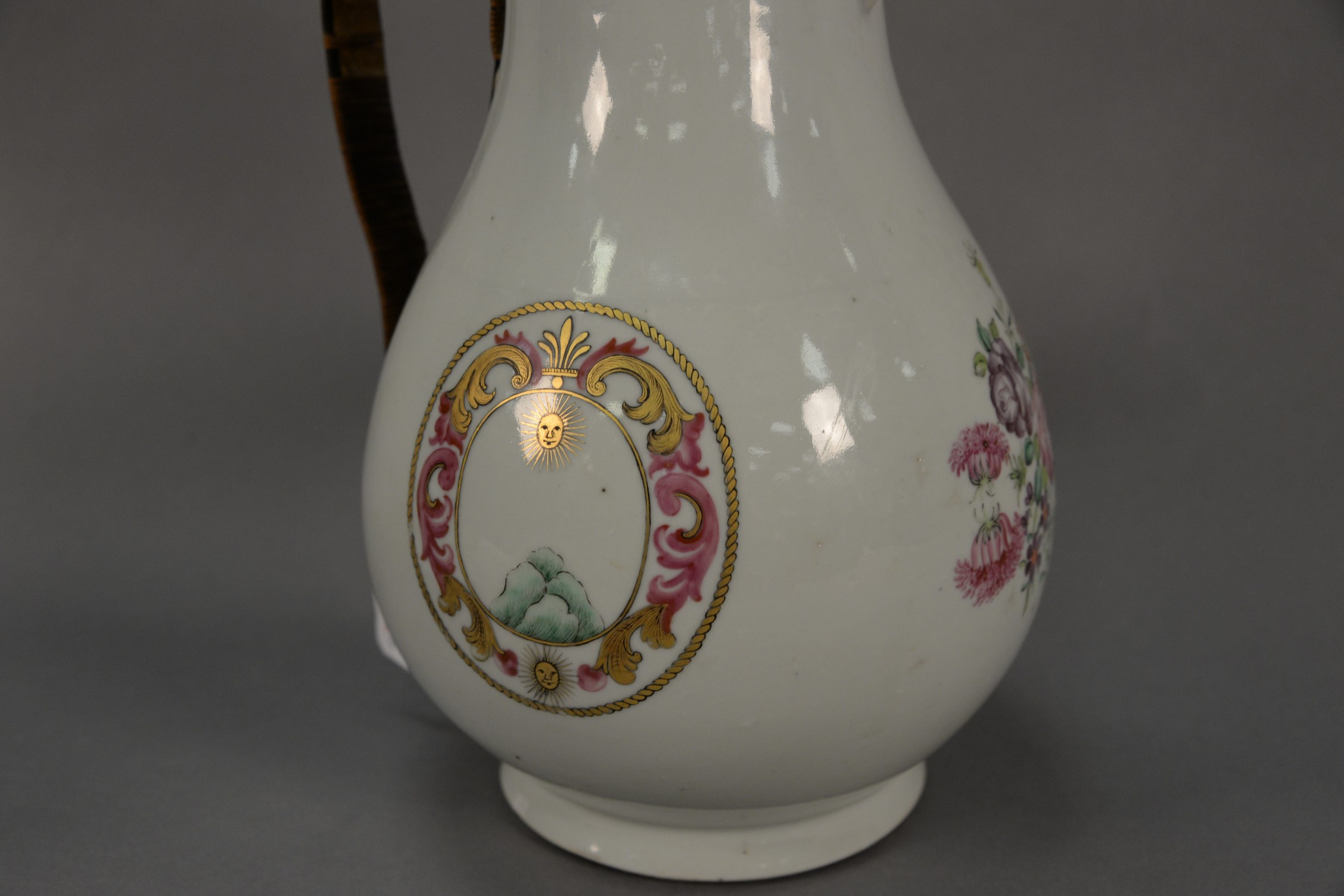 Large Chinese export pitcher in baluster form having enameled crest on each side and flowers on the front replaced handle. ht. 12 1/2 in.