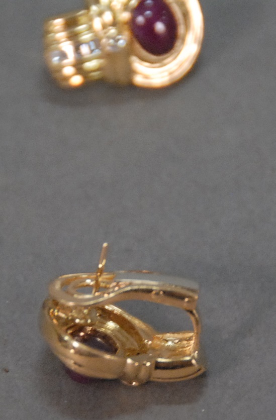 Pair of 18K gold earrings each set with cabochon set rubies and five small diamonds.