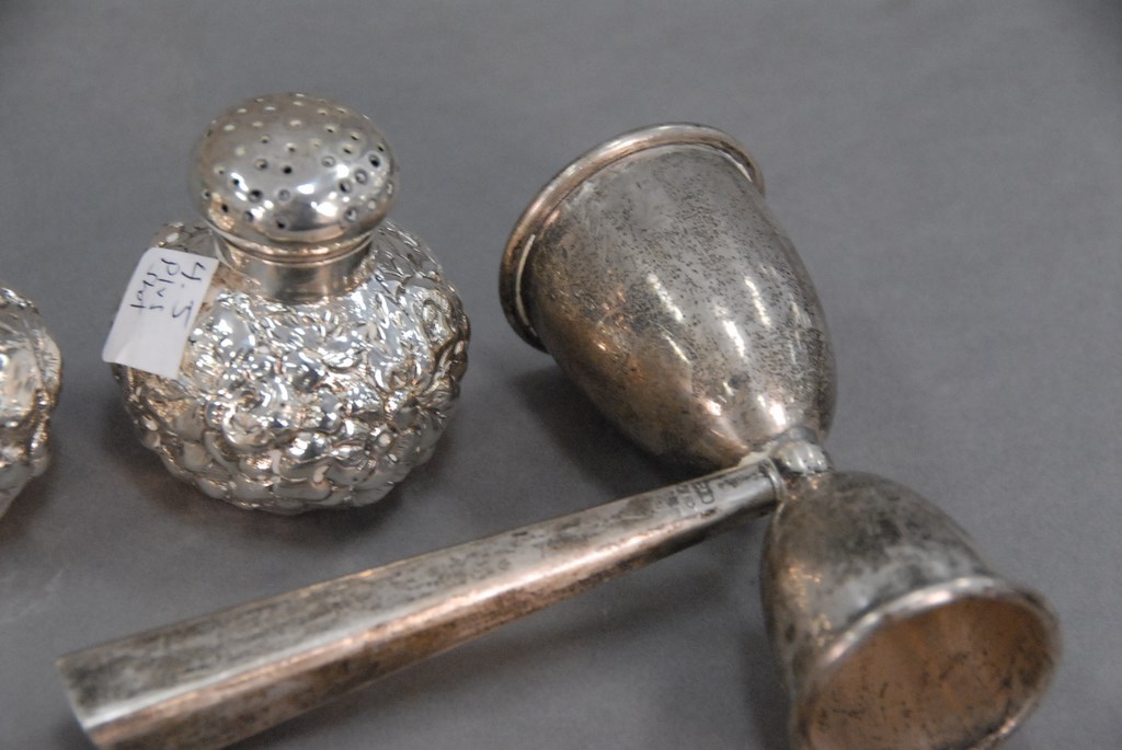 Pair of repousse pepper shakers, spoon, and shot measure, 4.5 t oz. plus shot measure.