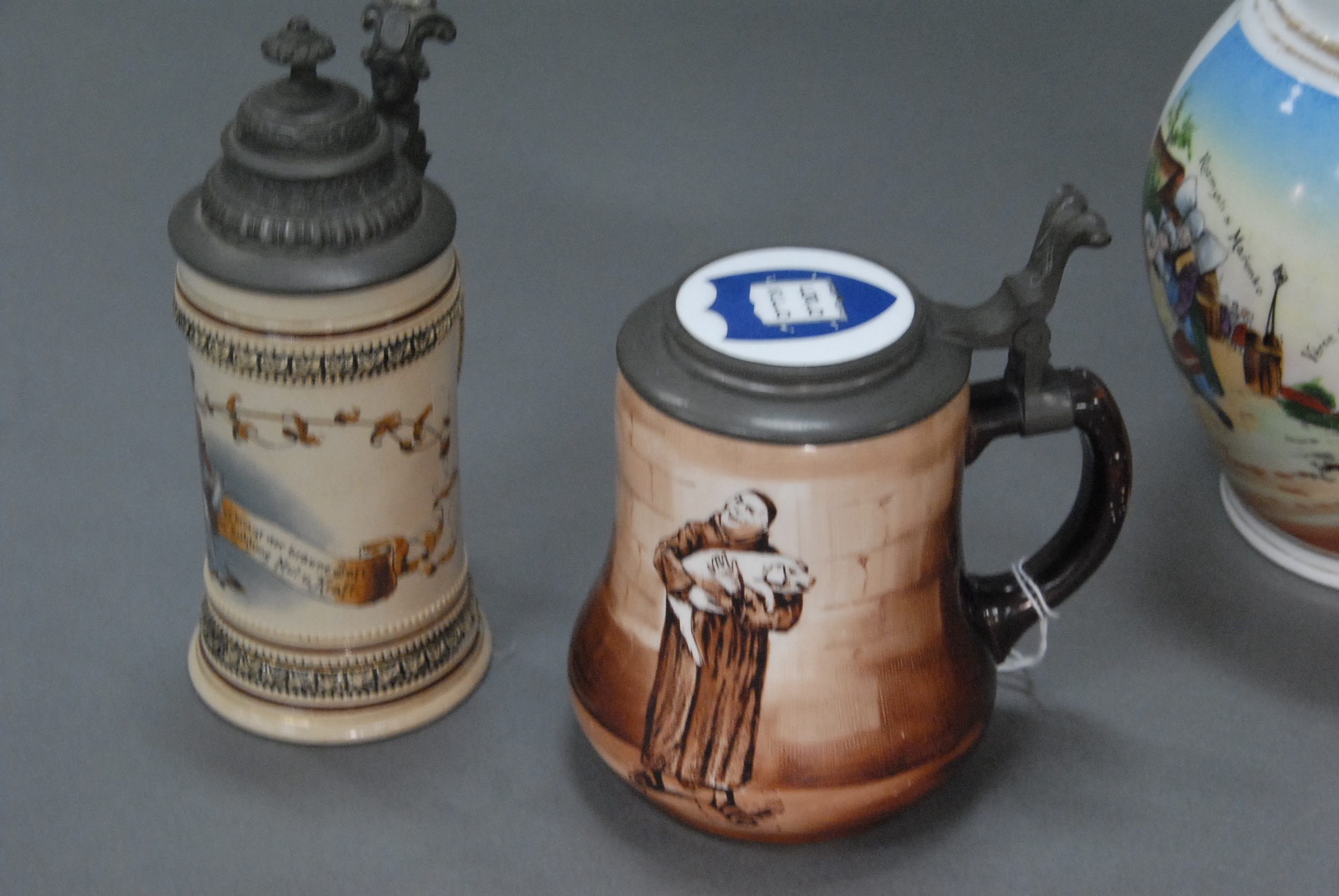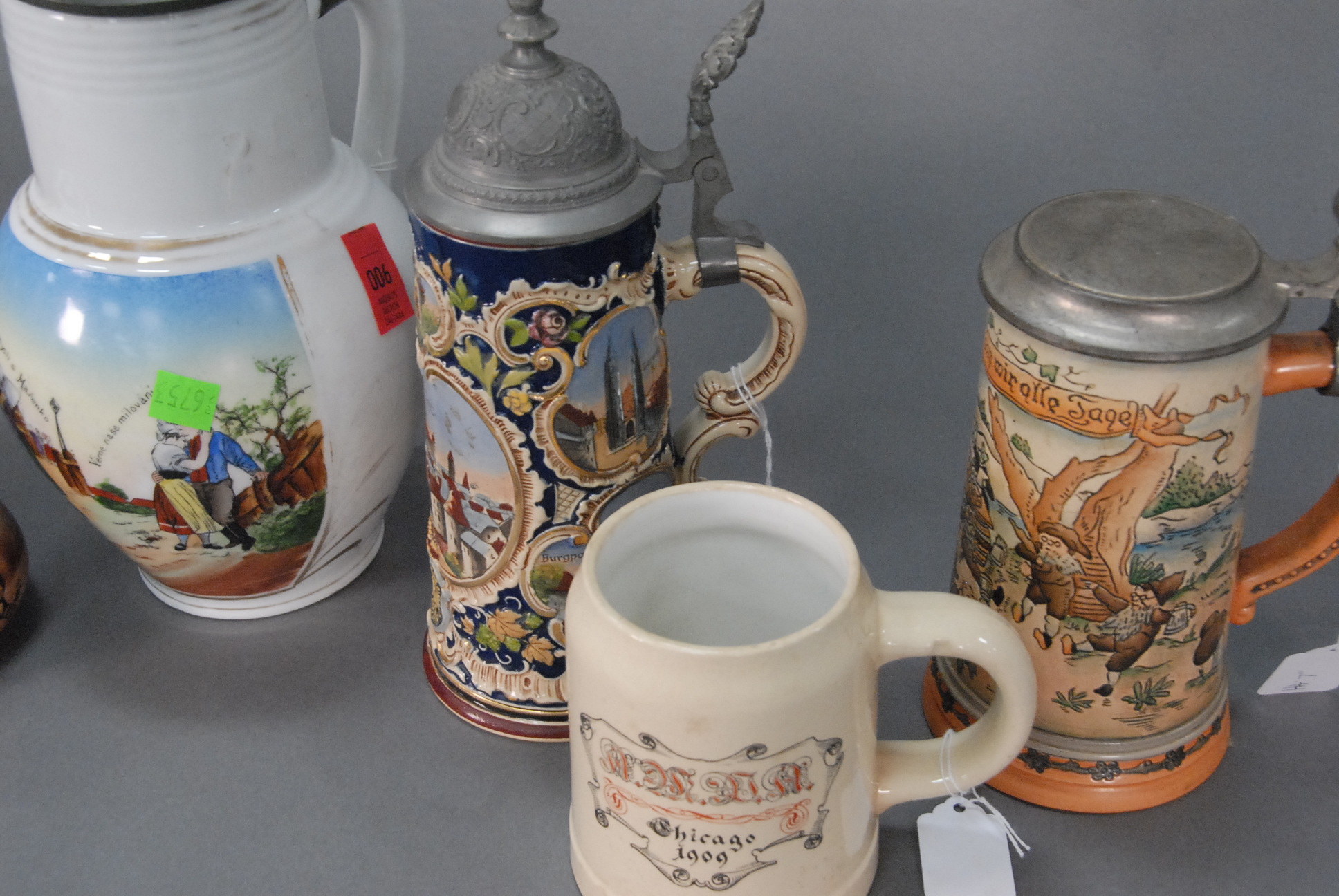 Six piece lot of steins and pitcher, tallest: ht. 12in.