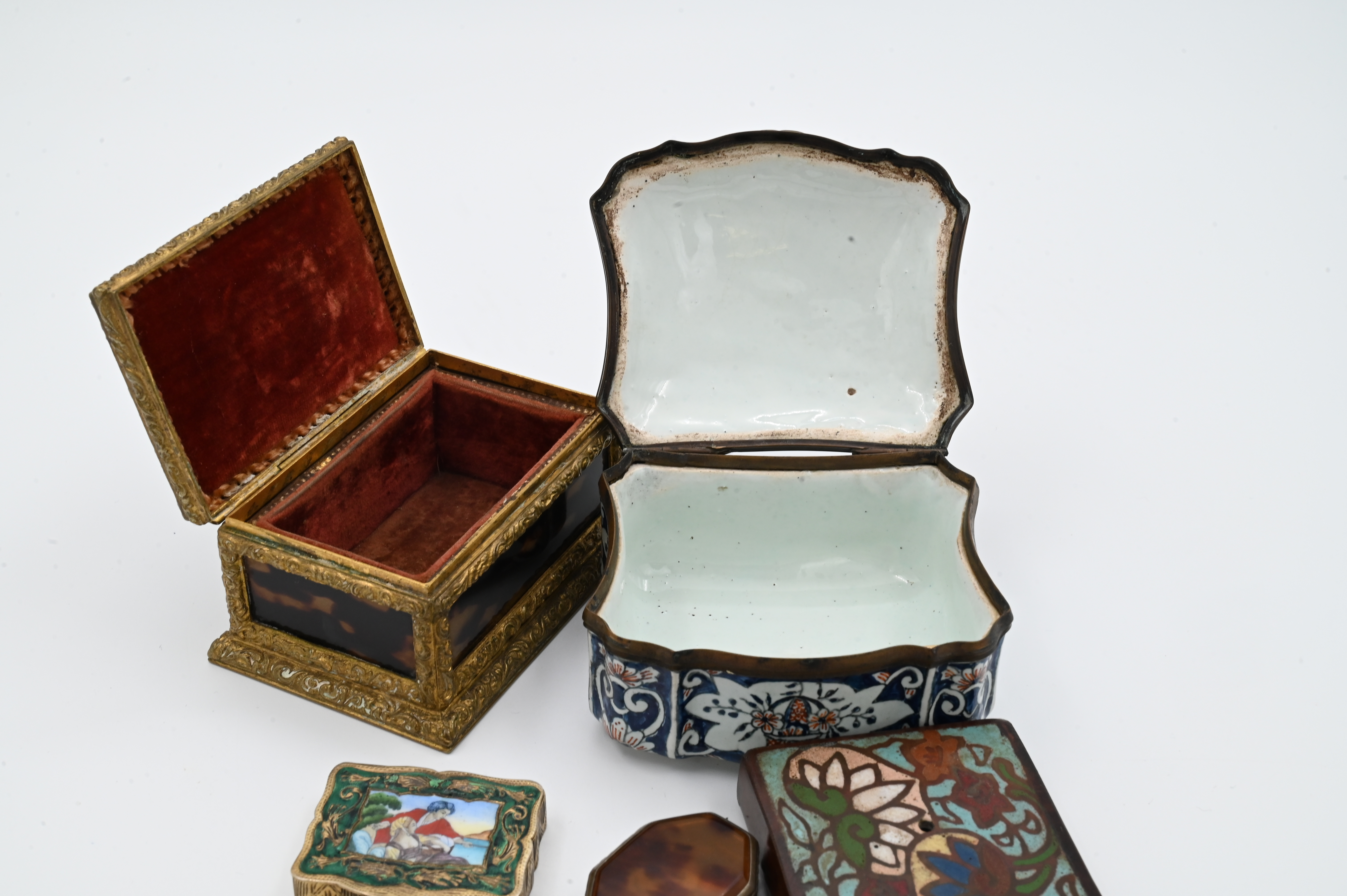 to include delft box having hinged orange and blue marked H.V., likely 18th century, one brass framed, one cloisonne lamp, three small silver boxes one of which is enameled