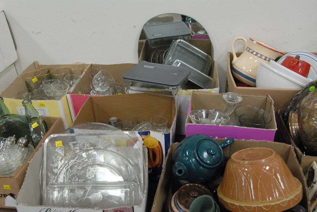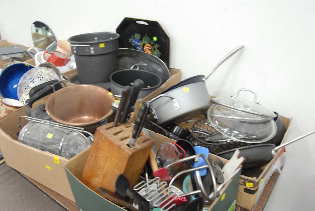 Table lot four box lots of pots and pans and kitchenware plus dishes and glassware.