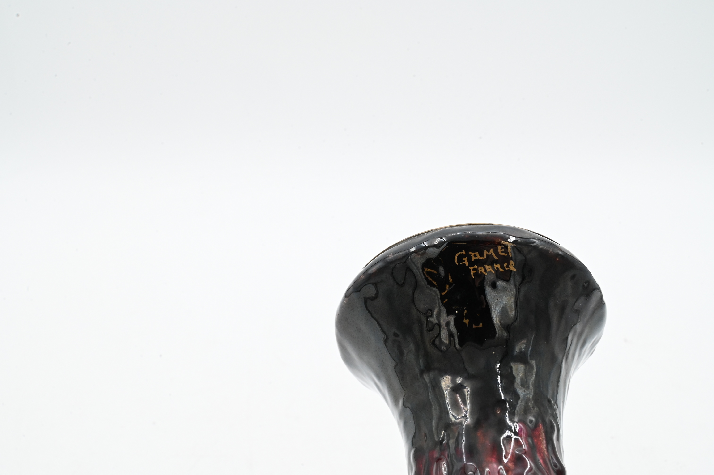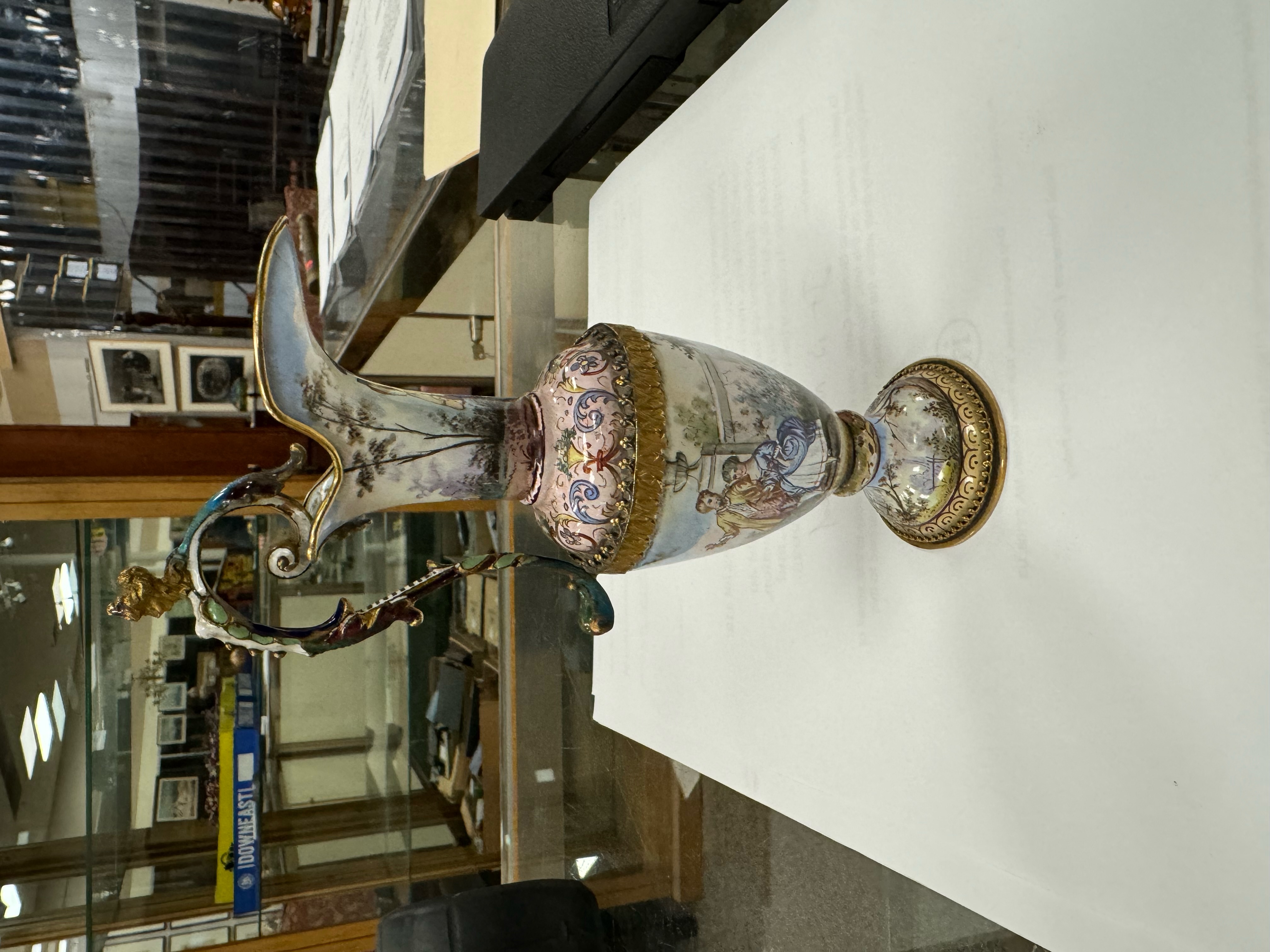 depicting a herder and family,Gamet France enamel and copper vase, along with a French enamel ewer (small chips)