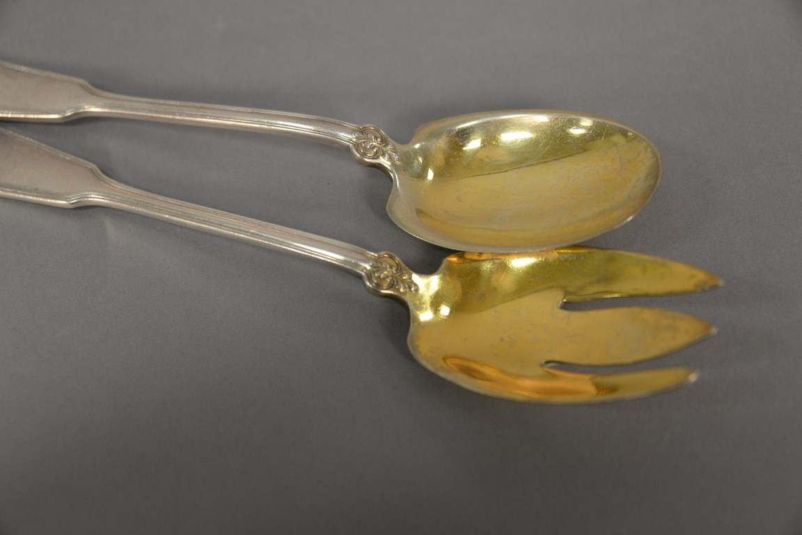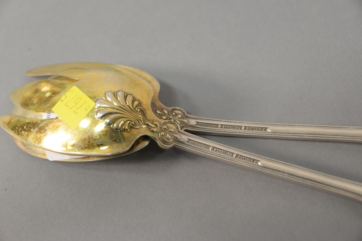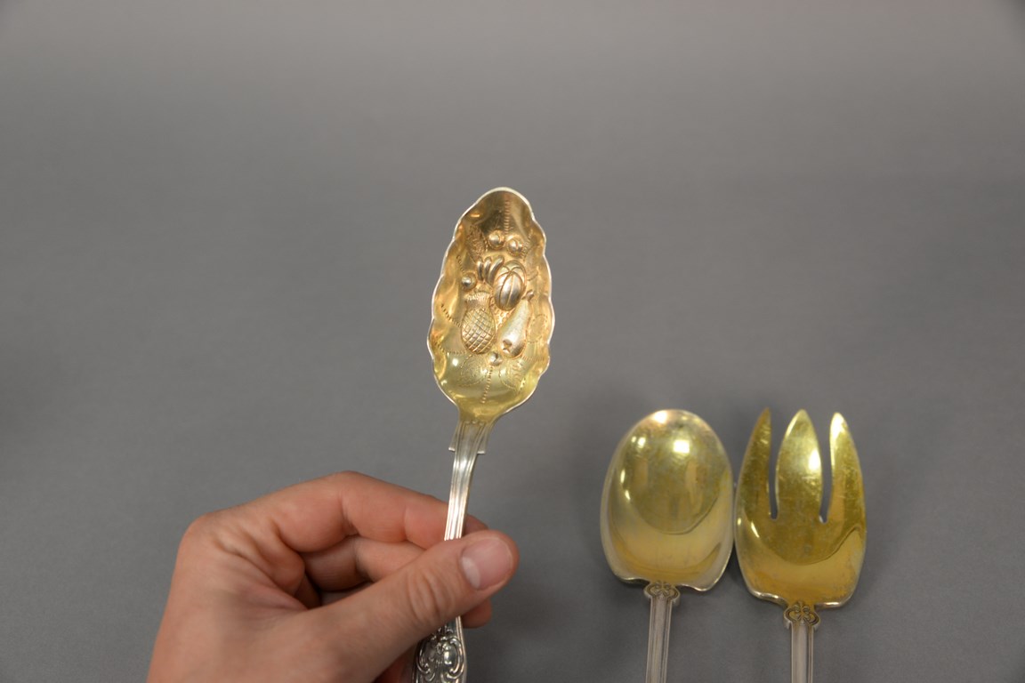 Lot 6: Three Tiffany sterling silver serving pieces including gold wash spoon and fork lg. 8 1/2 in. and a gold wash berry spoon lg. 10 in….