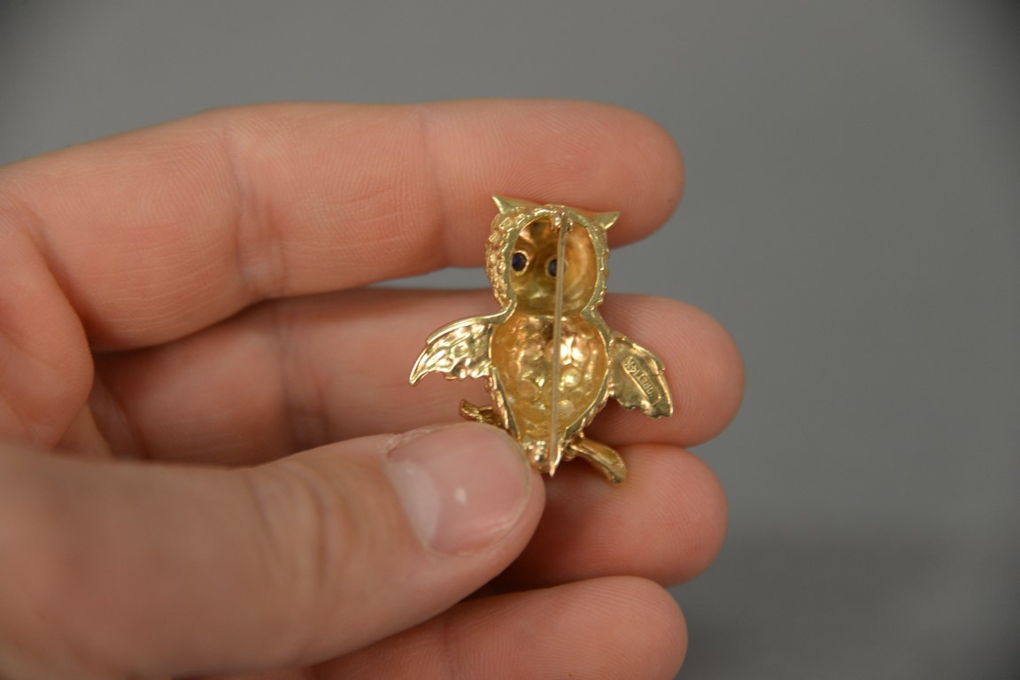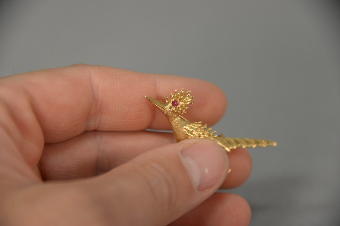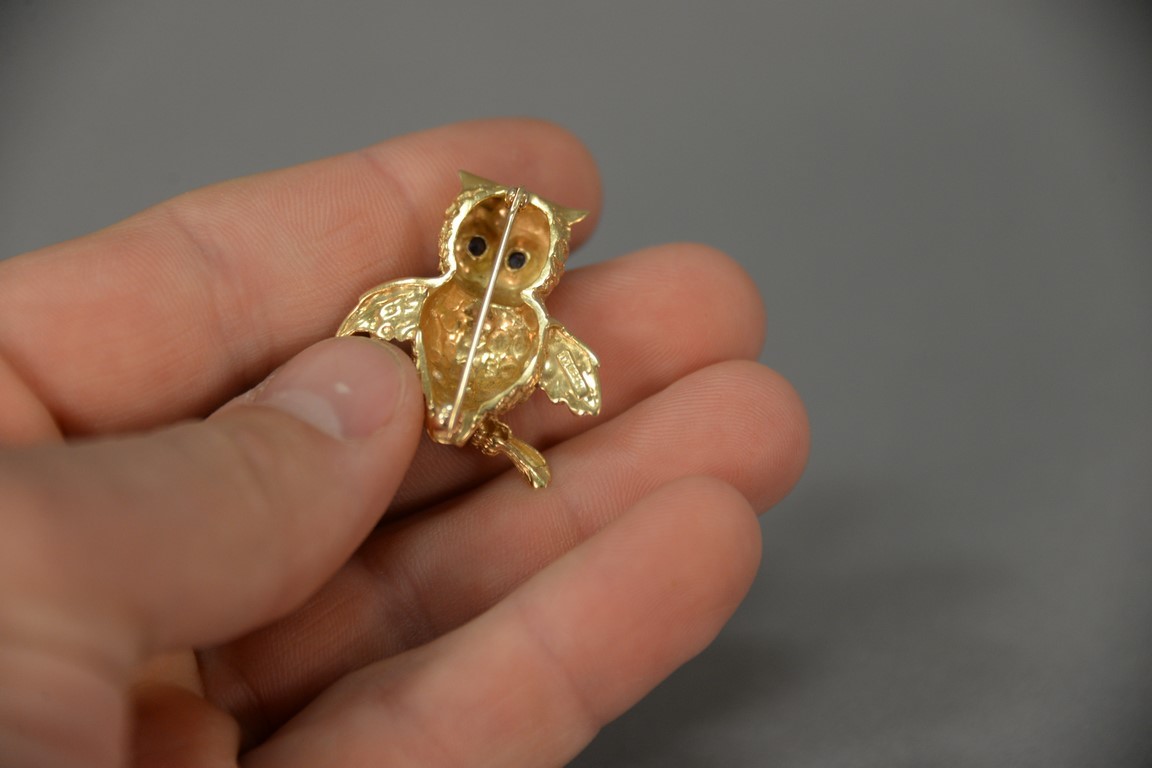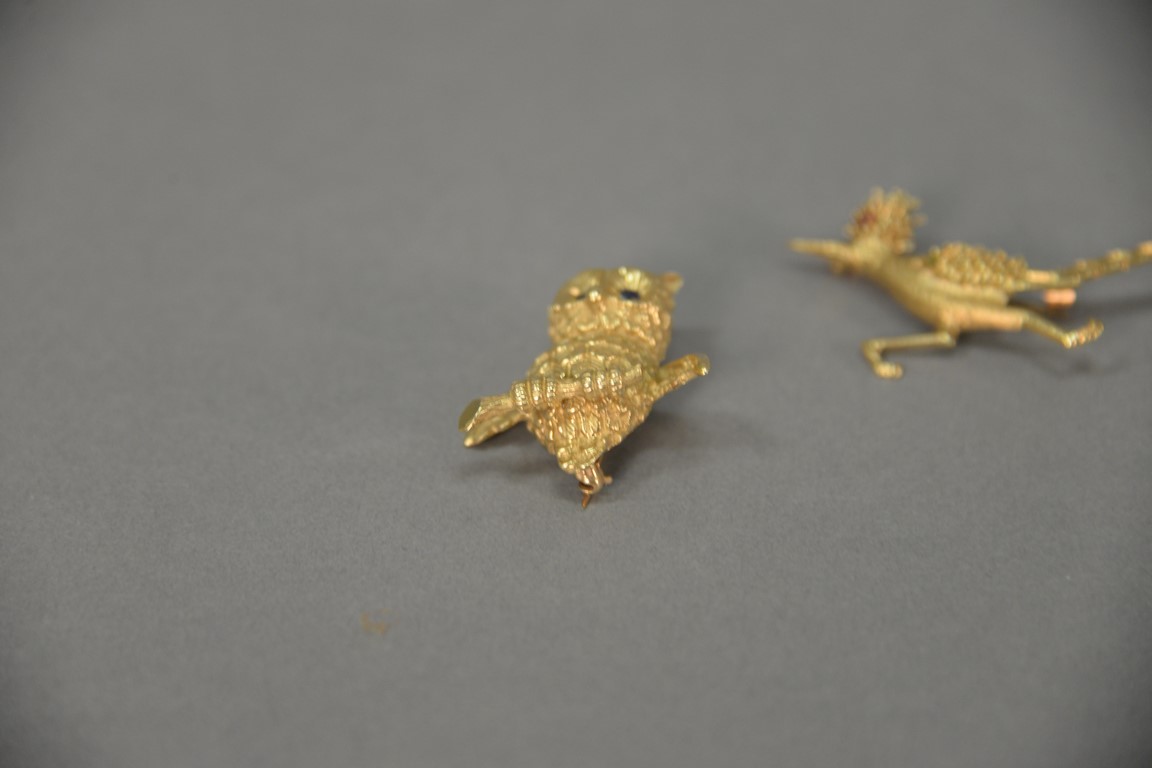 Two 14K gold bird pins, owl and road runner. 1 1/4 x 1 and lg. 2 in., 17.3 grams