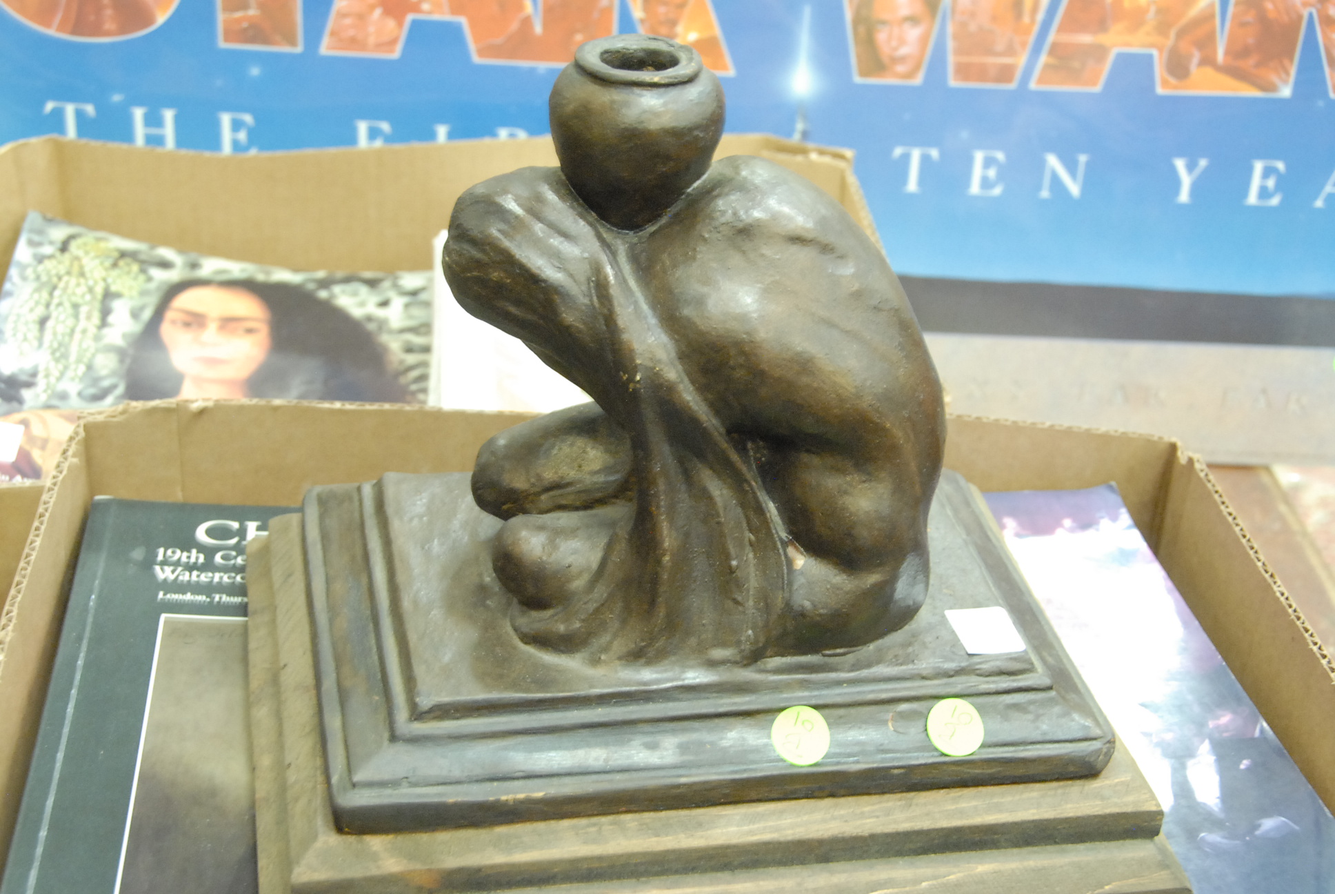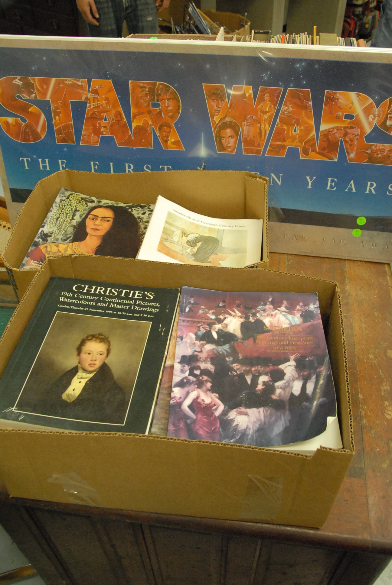Two boxes of records along with two boxes of auction catalogs , a figural candle holder, two Star Wars posters, one poster is signed by John Alvin and numbered 701.