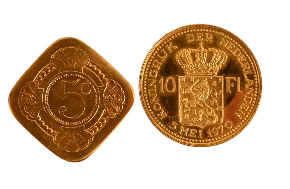 Two Netherlands Gold Coins, 10 FL and square 5C, 10.9 grams.
