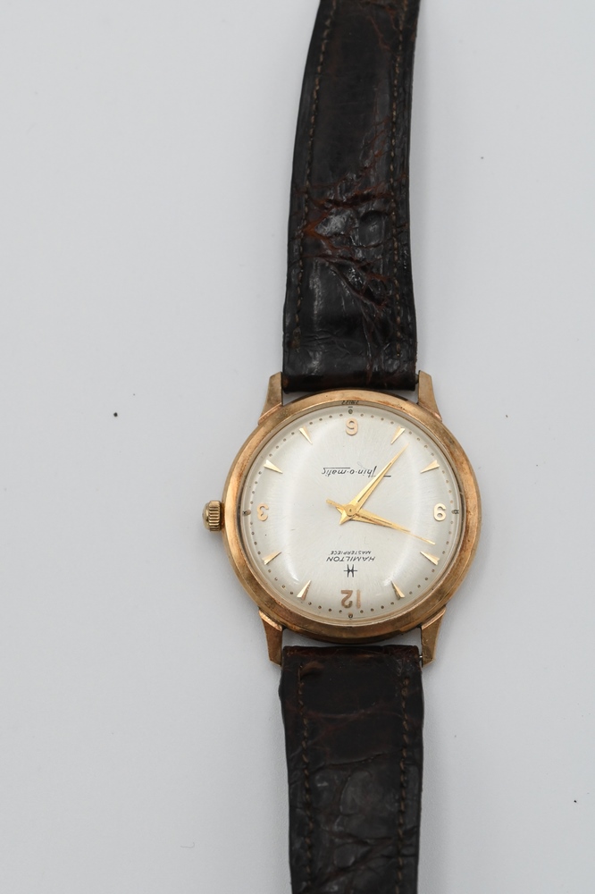 Lot 60: 10 Karat Gold Hamilton Masterpiece Thin O’Matic Mens Wristwatch, 33 millimeters.