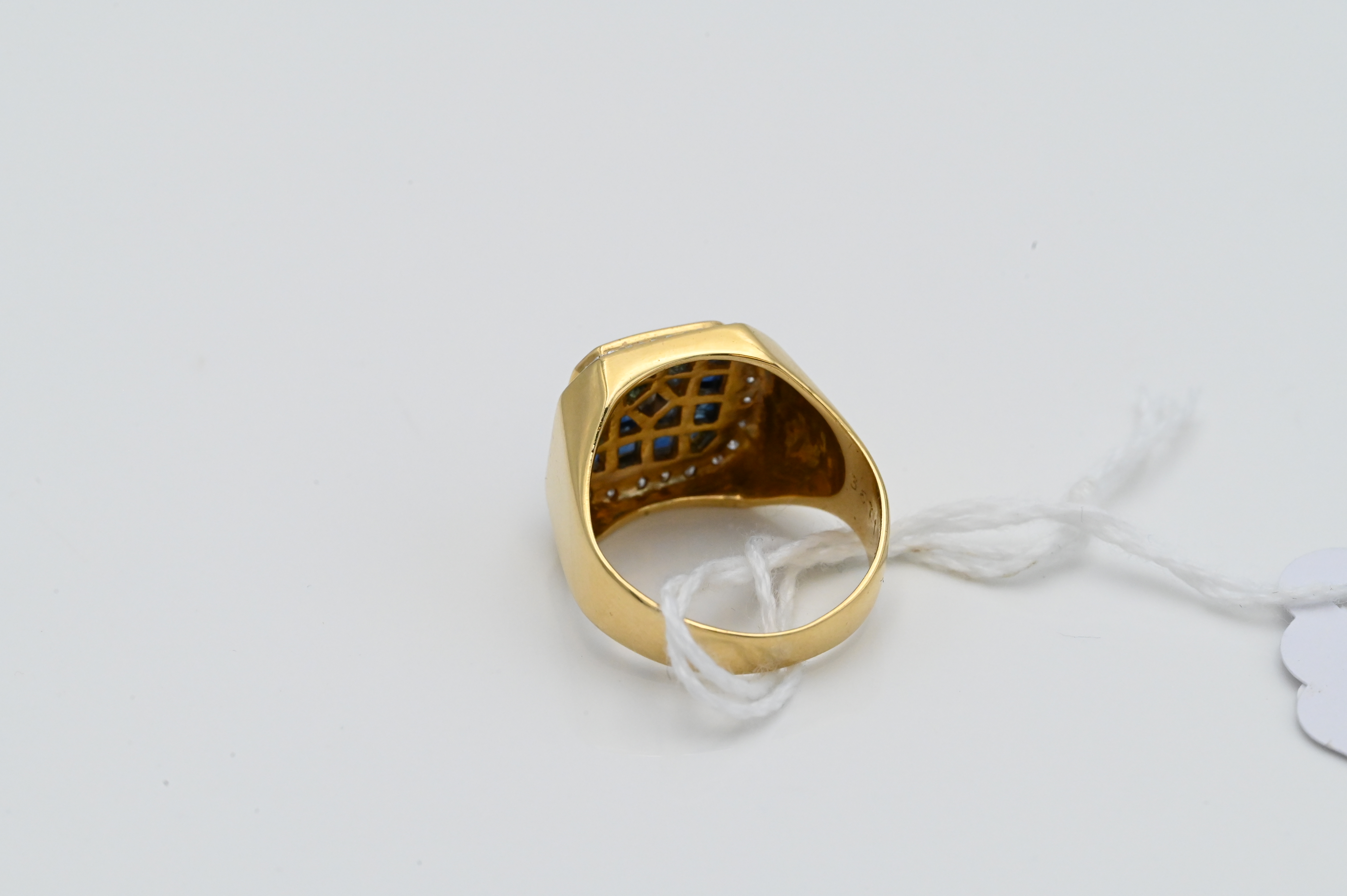 18 Karat Yellow Gold Mens Ring, set with blue sapphires and diamonds, size 8, 11.3 grams total weight.
