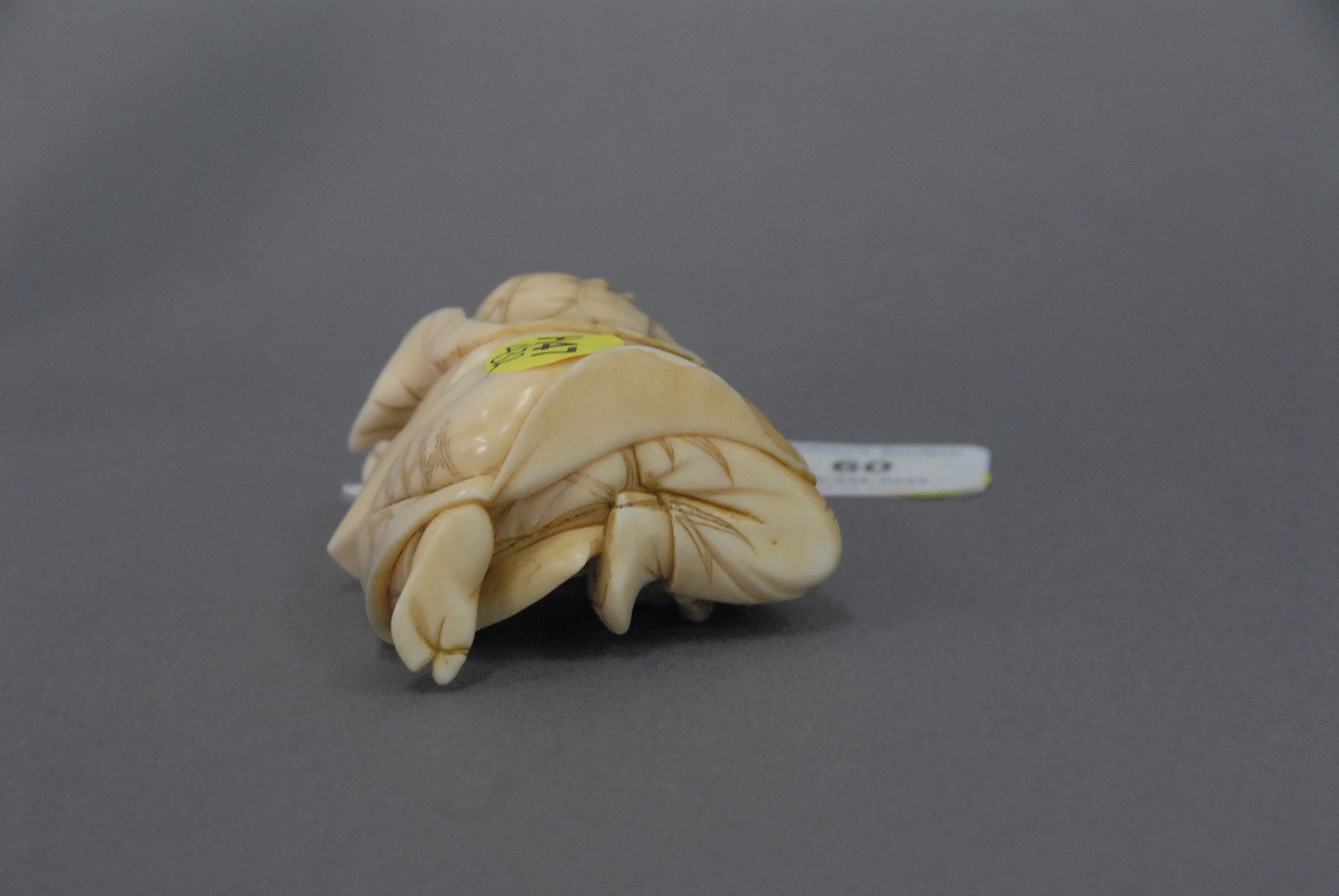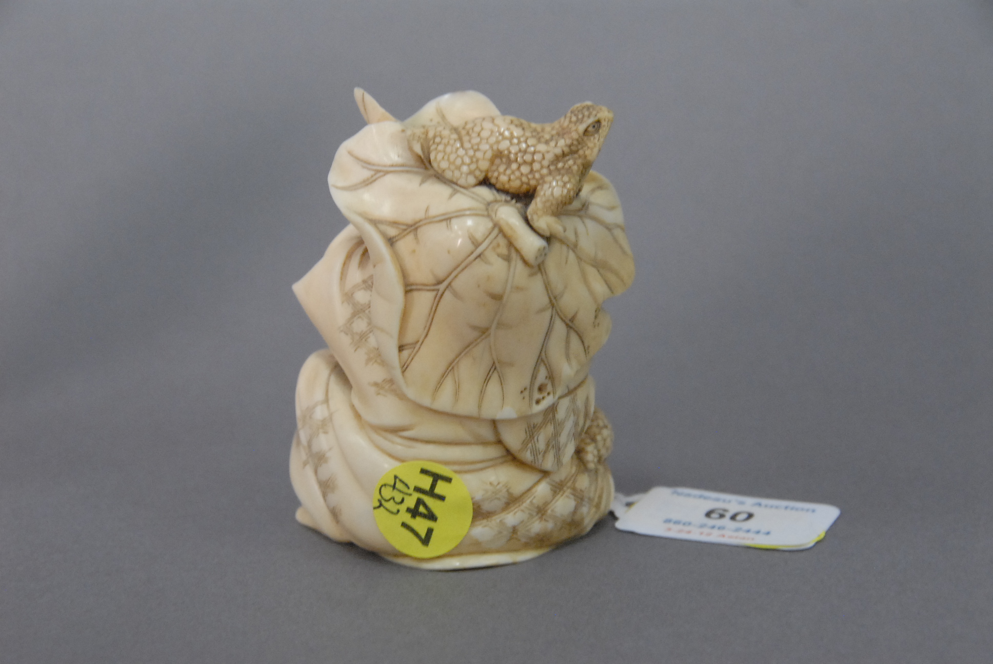 Lot 60: Carved ivorine figure of a man crouching with a lotus on his head and a toad on it, and holding a toad, ht
