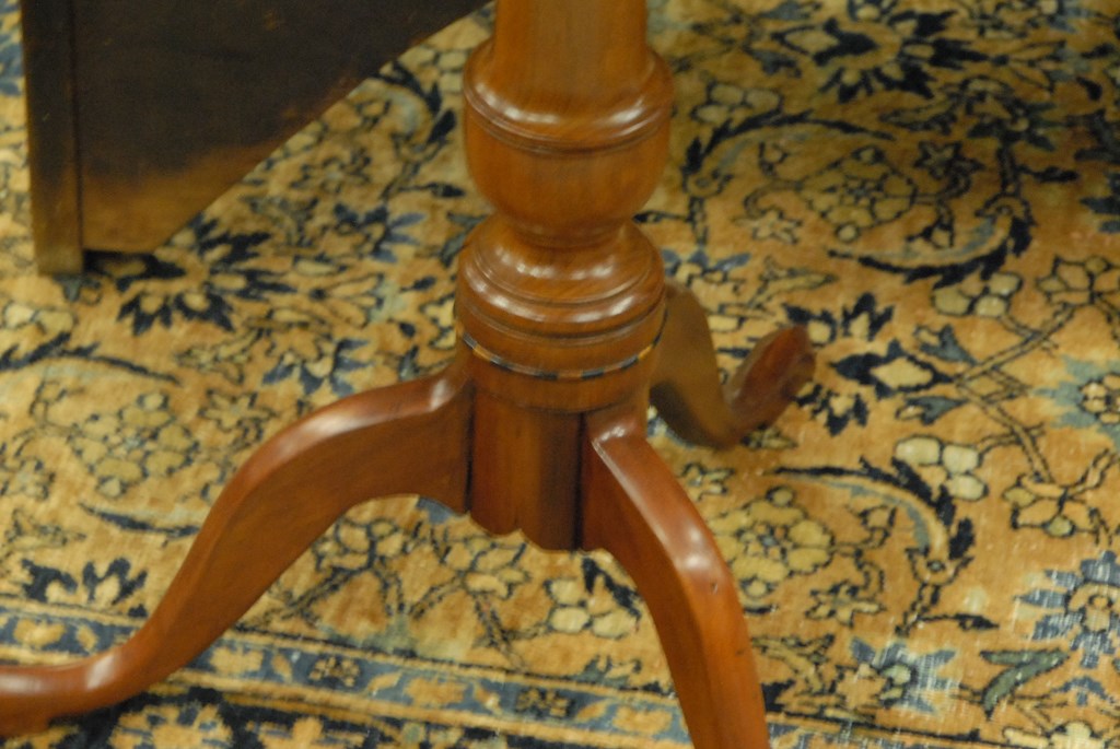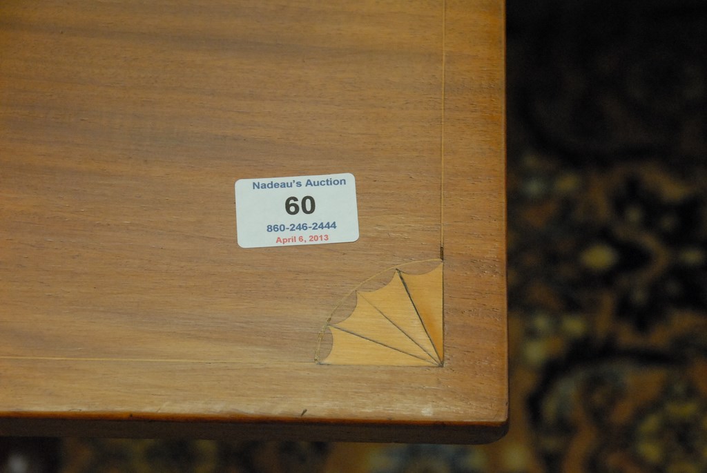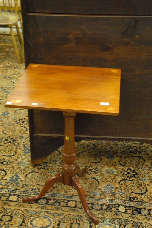 Lot 60: Cherry candlestand with square top and vase turned shaft on tripod base with fan inlaid top. ht. 29in. top: 19 x 20