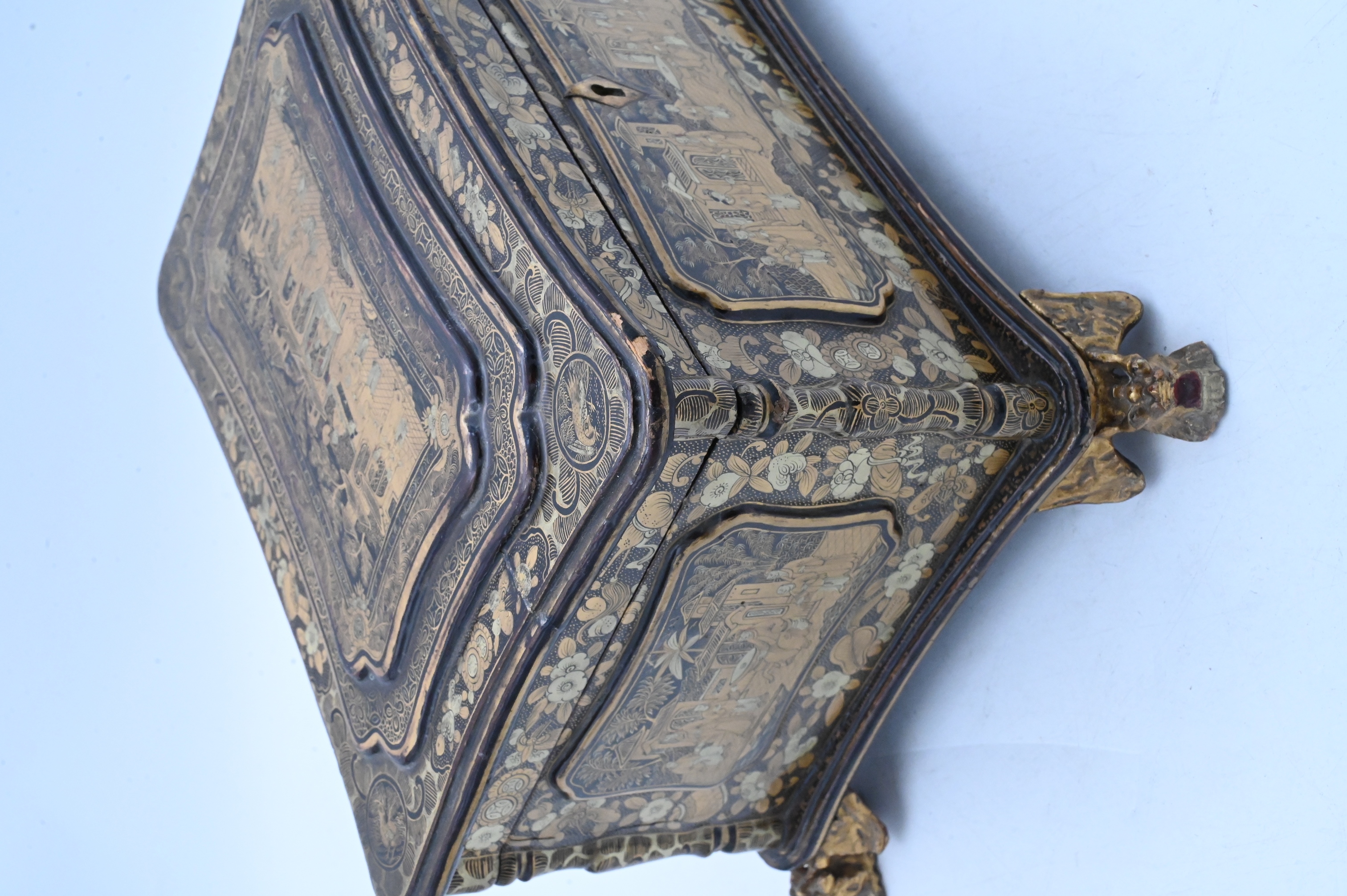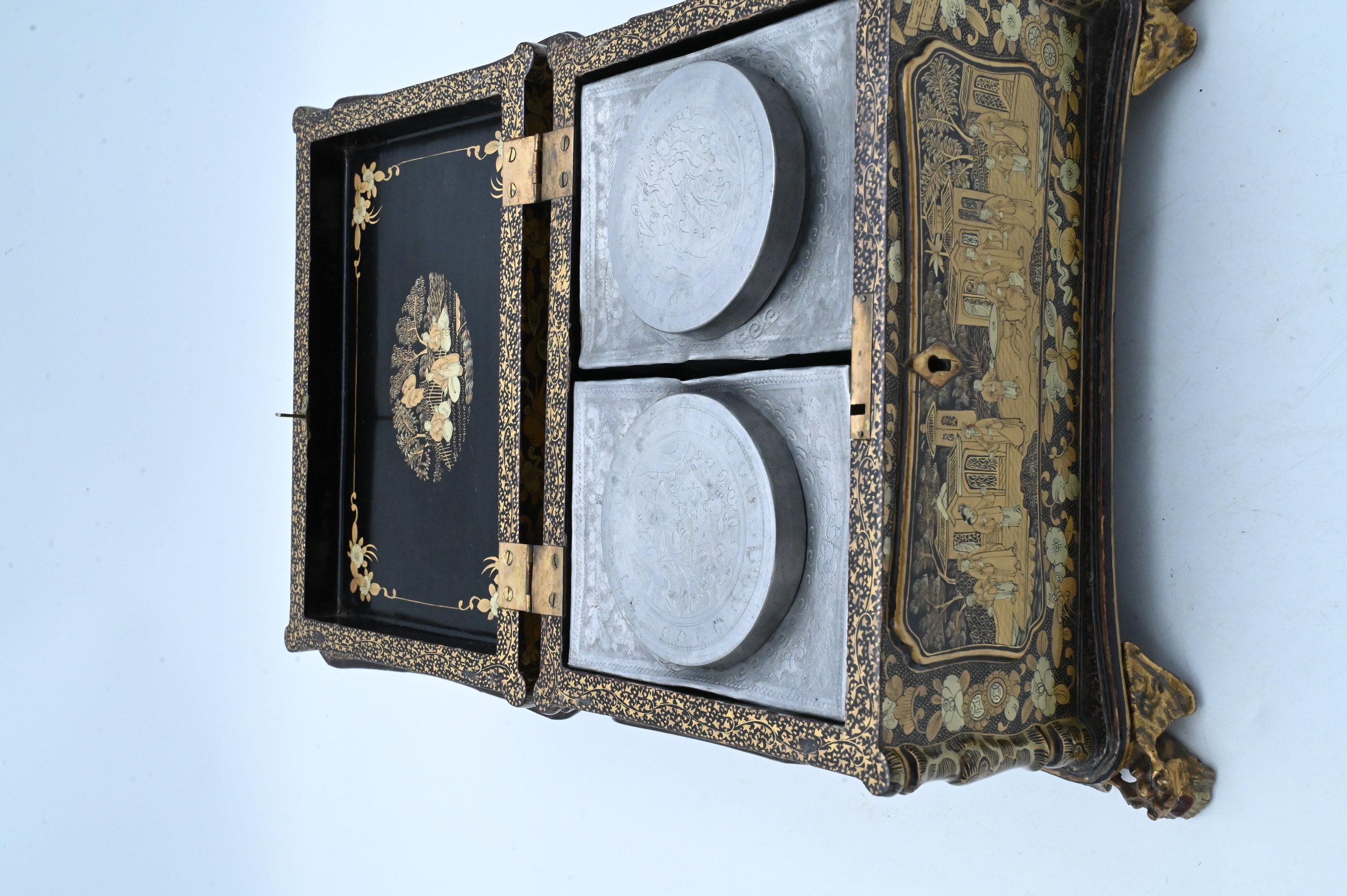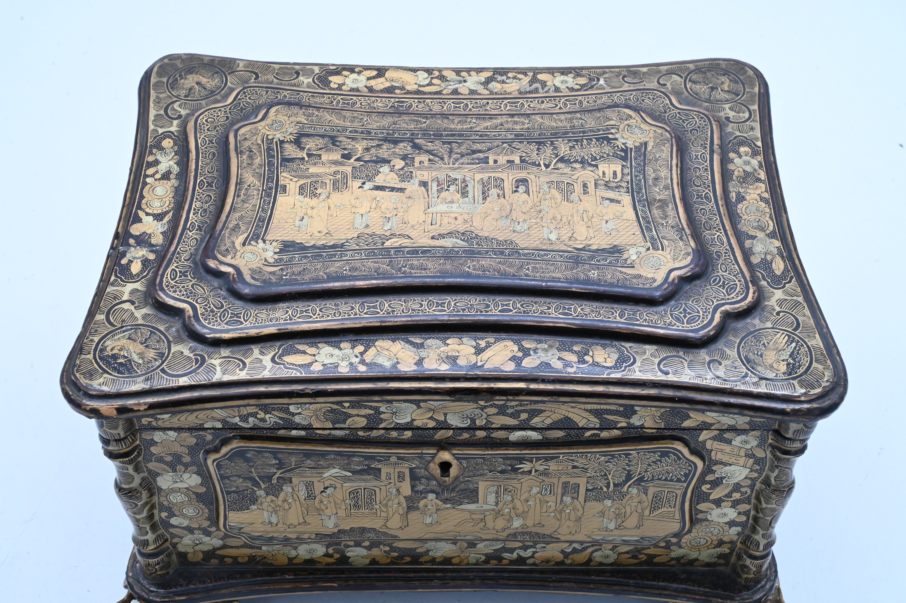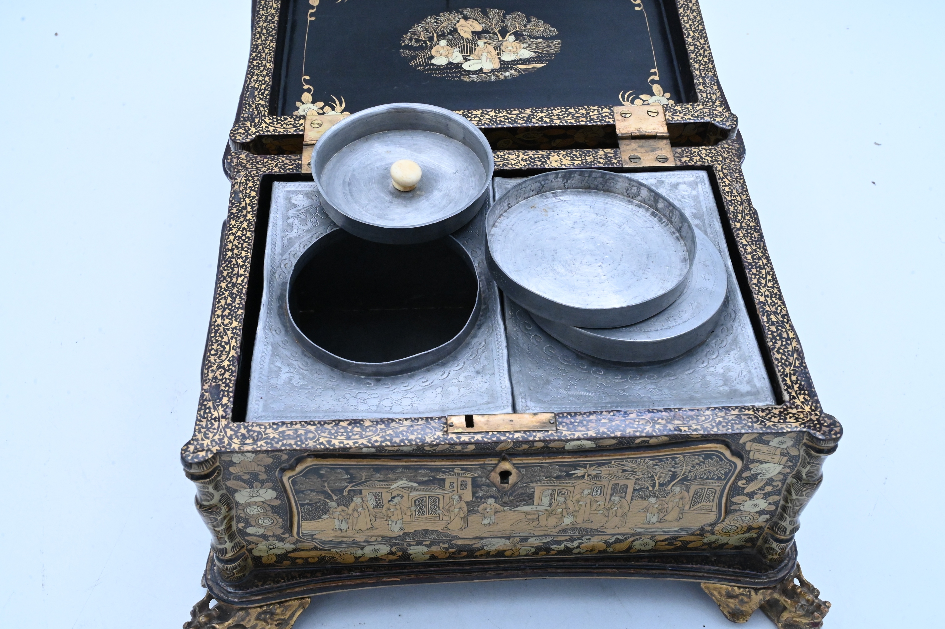 A Chinese export lacquer tea box, the exterior finely decorated with gilt figural scenes and floral borders, the sides and lid with courtly pavilion scenes, raised on four gilt-painted paw feet. Interior fitted with a two-section pewter liner.