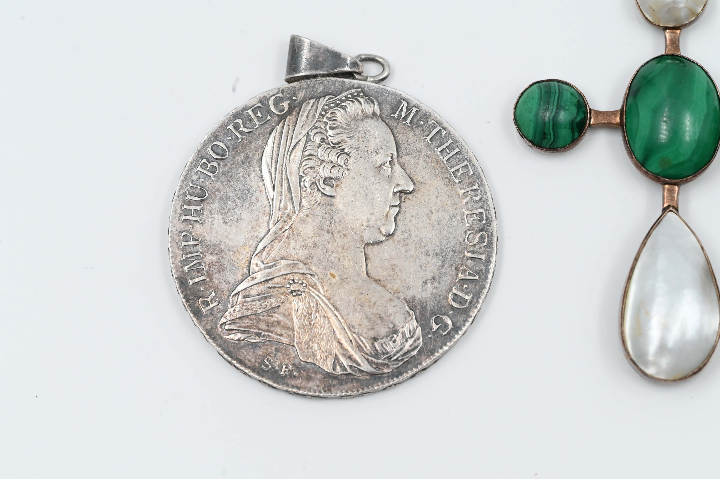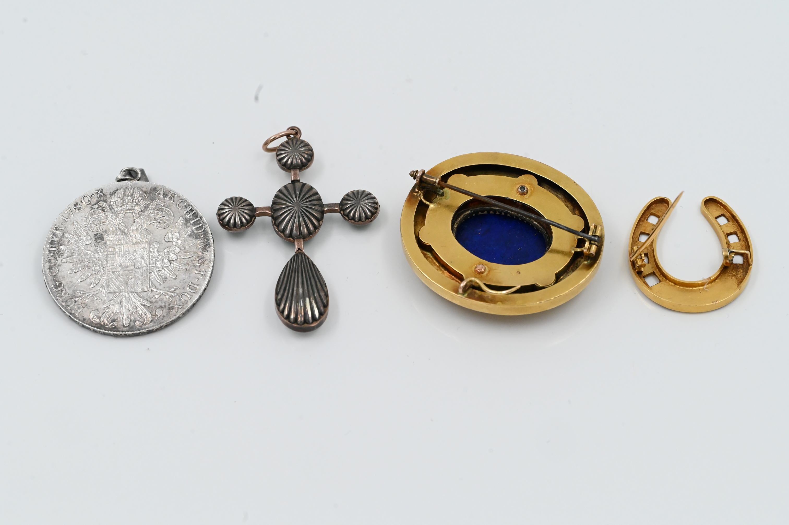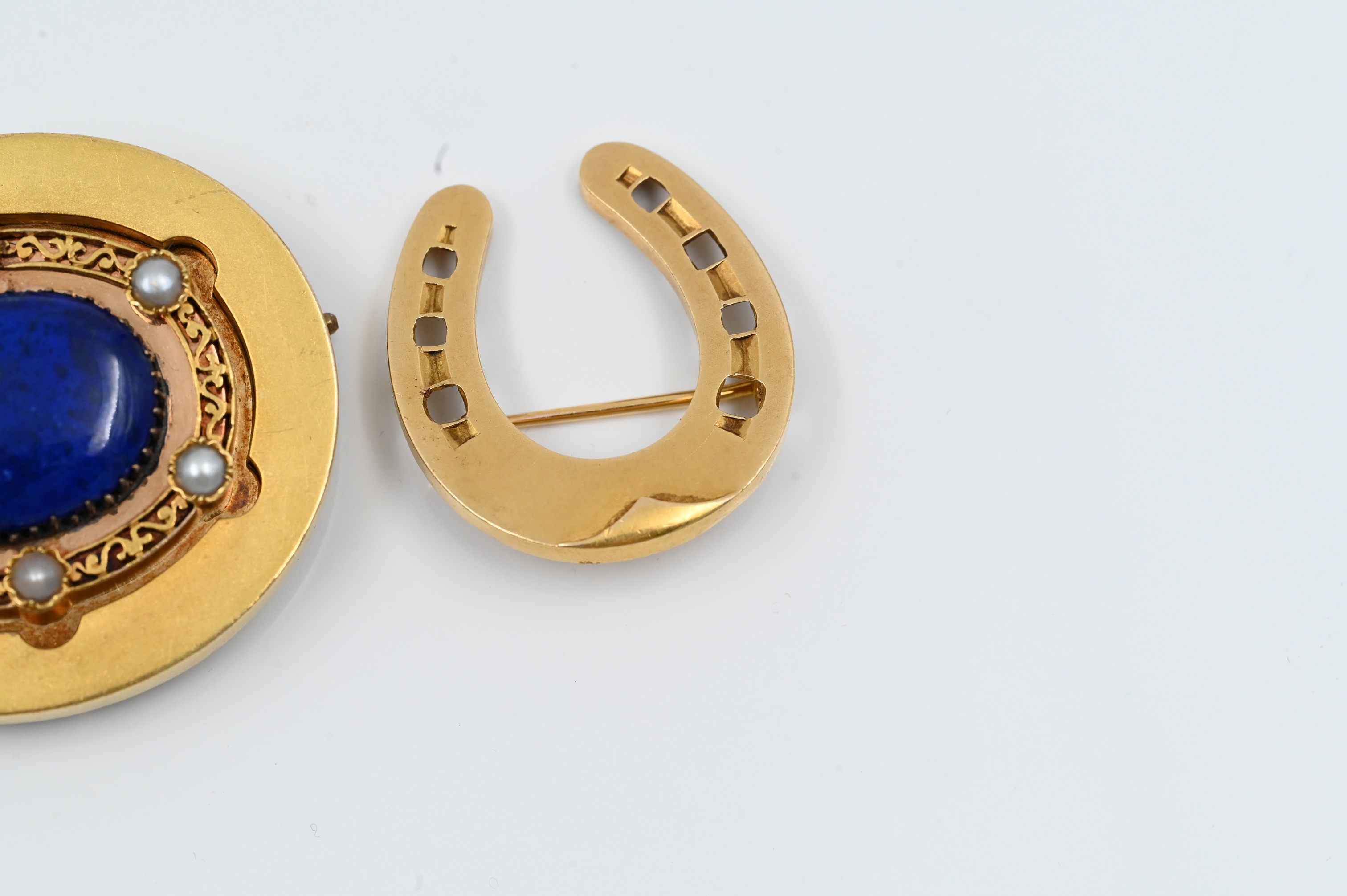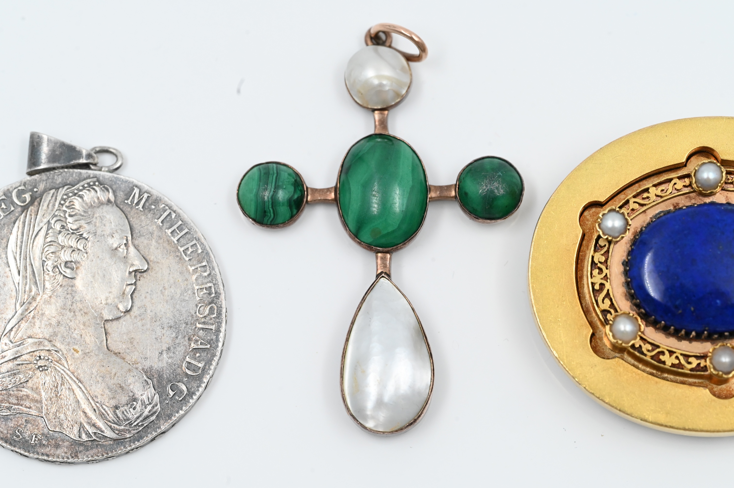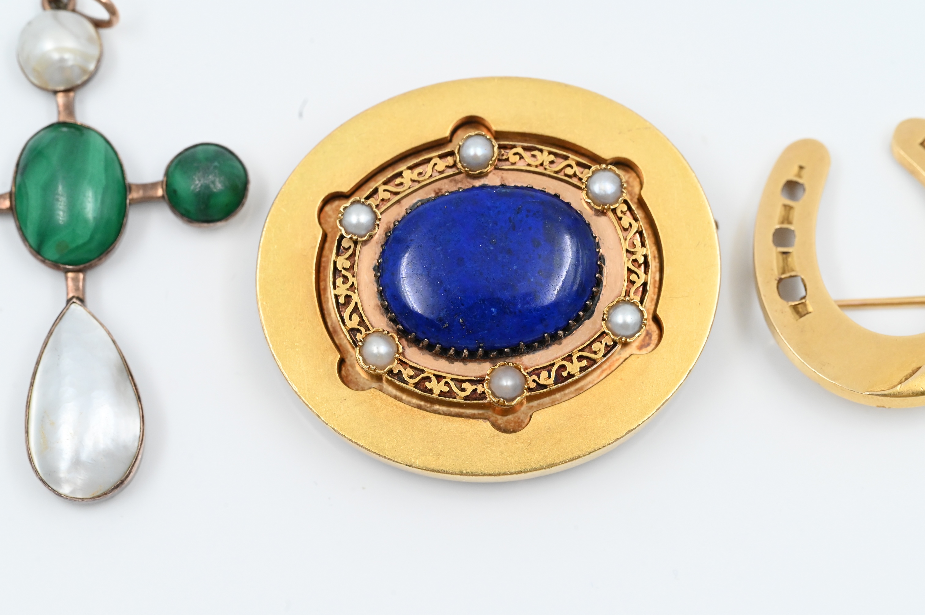 to include horseshoe shaped brooch, lapis, and pearl brooch / pendant, along with Austrian malachite and pearl cross